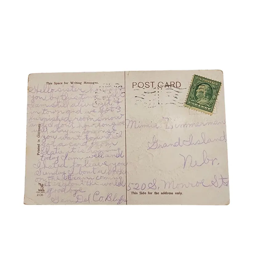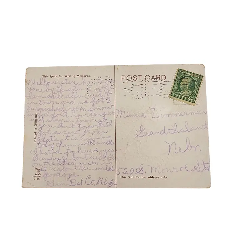 • Antique postcard with handwritten message • Features embossed design for added texture • Postmarked and stamped for authenticity