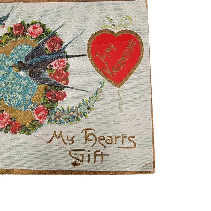 This vintage postcard carries the whispers of love and nostalgia. Featuring a heartfelt design with swallows, roses, and a golden heart, it embodies timeless romance.
