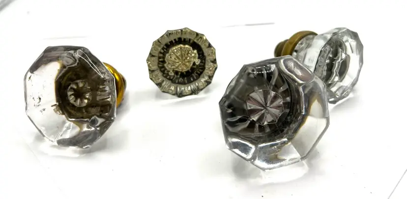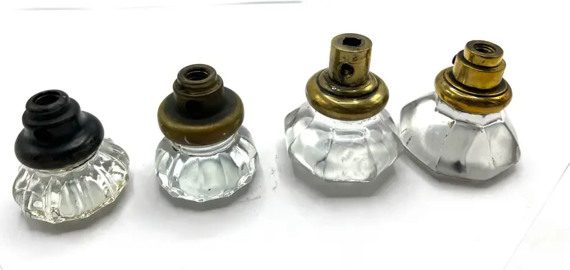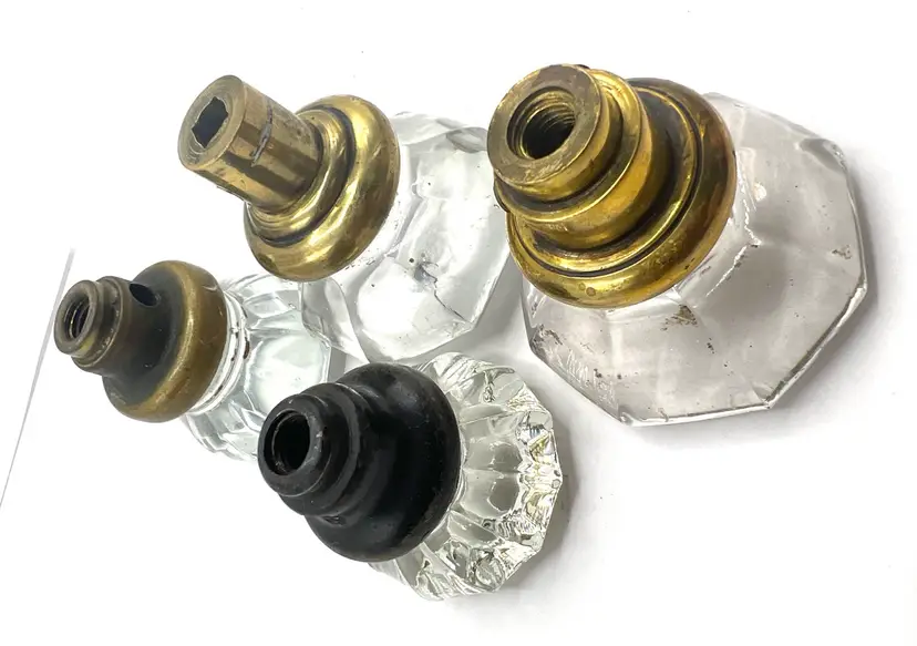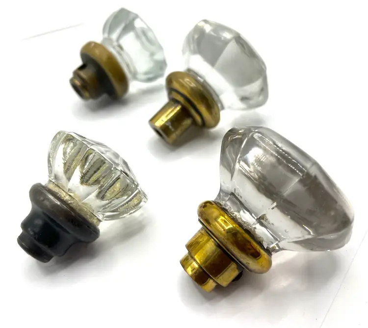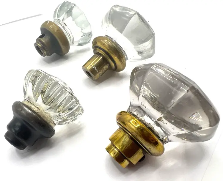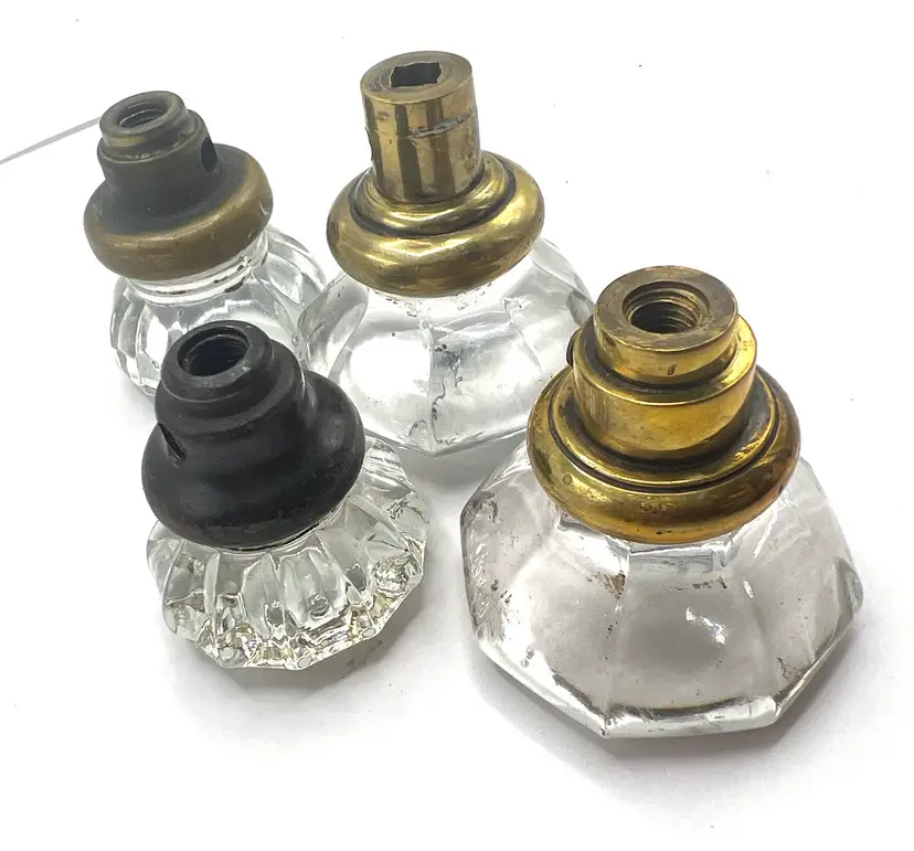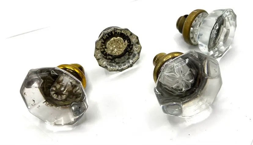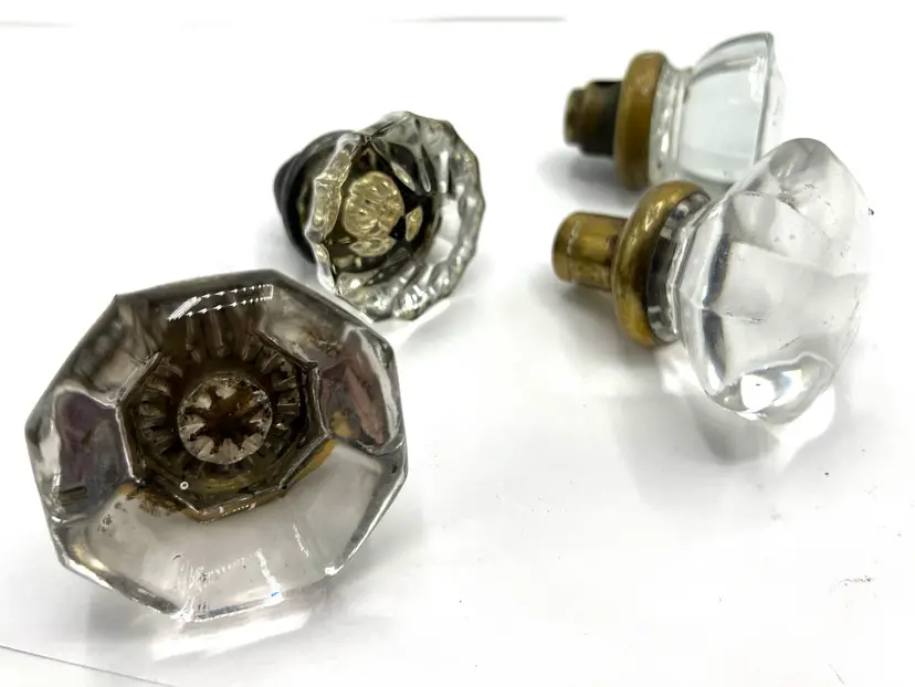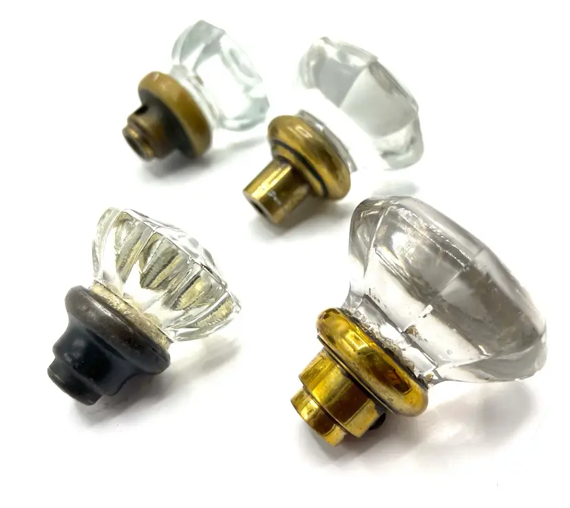 Amazing set of 4 antique glass doorknobs. The design is from early turn of the century and came from a local home. Perfect for home renovation or could be used as candle holders or decor for your mantle. Antique Architectural Salvage Size: 2 inch glass diameter by 2 1/4 inch long to the end of the brass. Condition - very good vintage I love the original patina of these pieces- no chips or wear to the glass