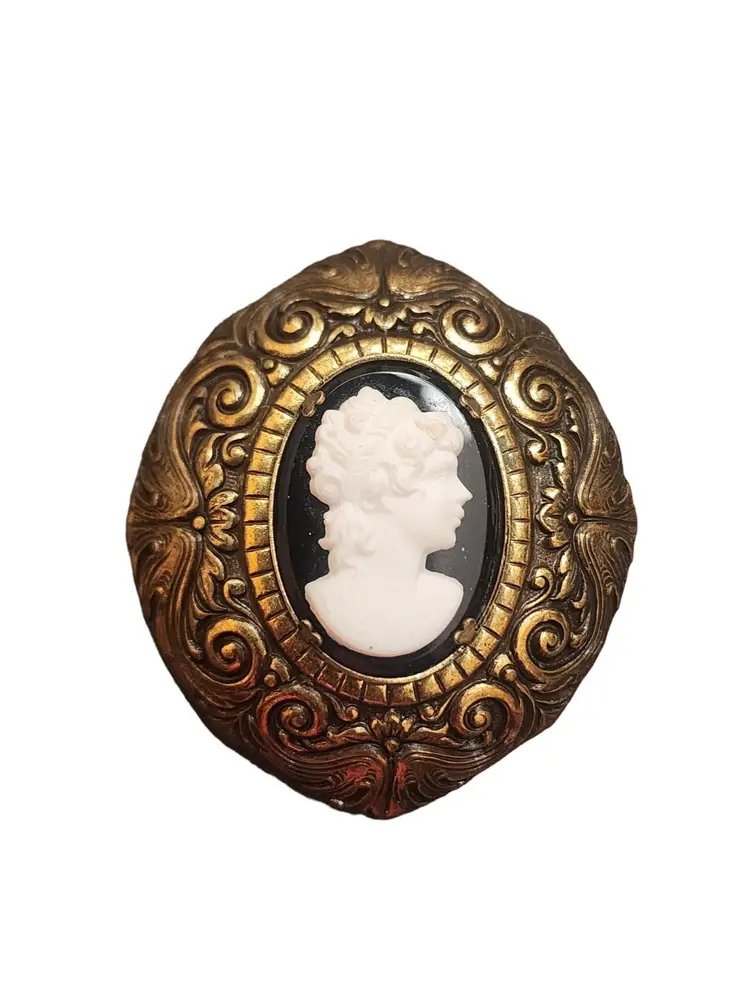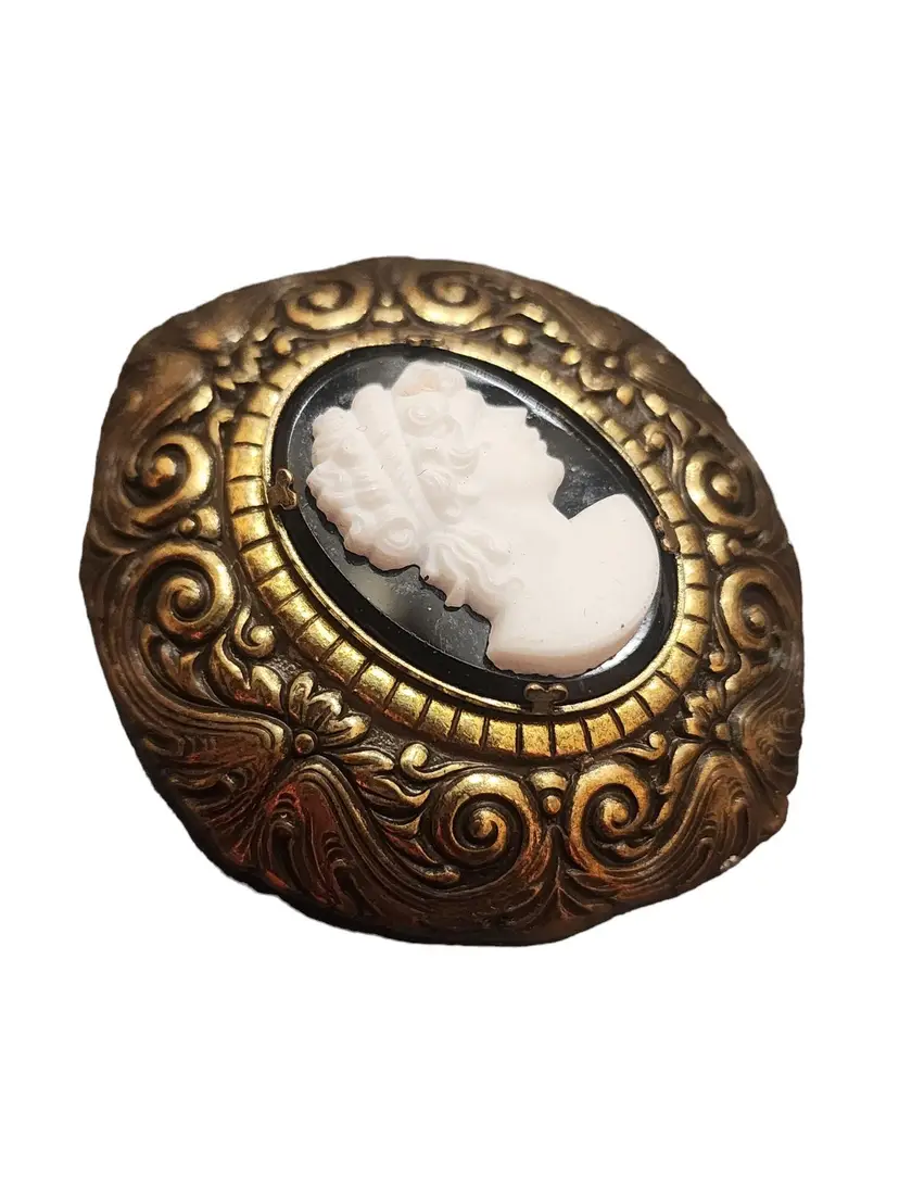 Size: 2 x 1.75" wide Color: Gold, Black, White Condition: Very good Signed: None Details: Nice patina to brass