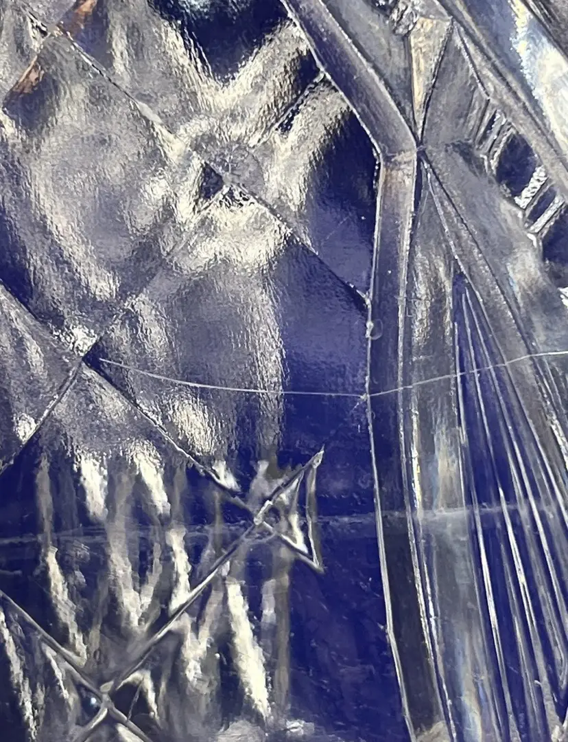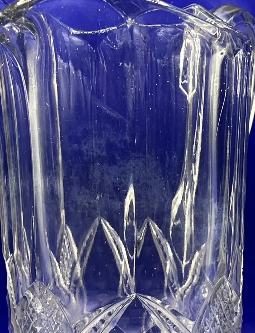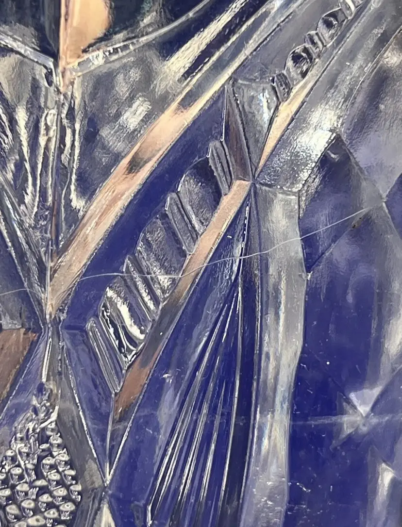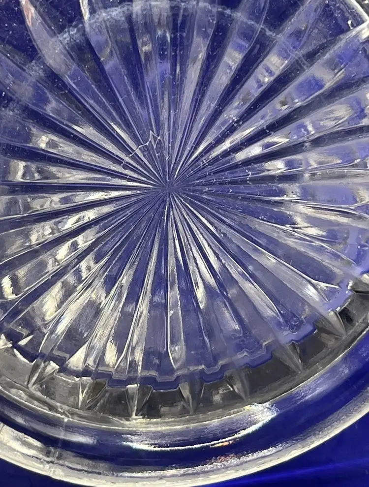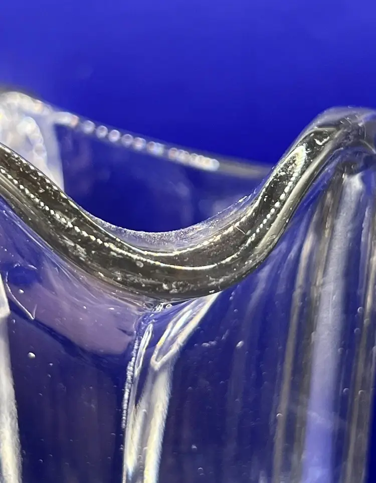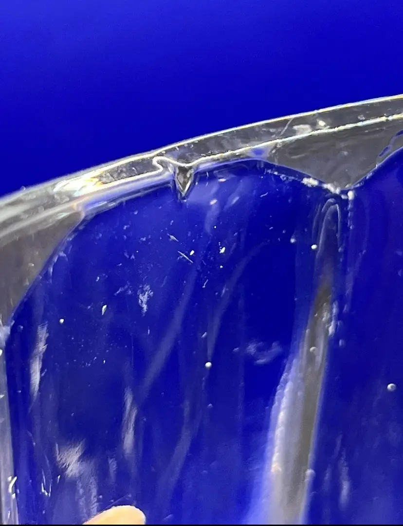 No chips. Has a lot of scratches and some lines inside the glass as well as some indents on the rim that are smooth. There is some cloudiness to the glass in some areas. Very similar to Duncan & Miller’s King Arthur pattern.
