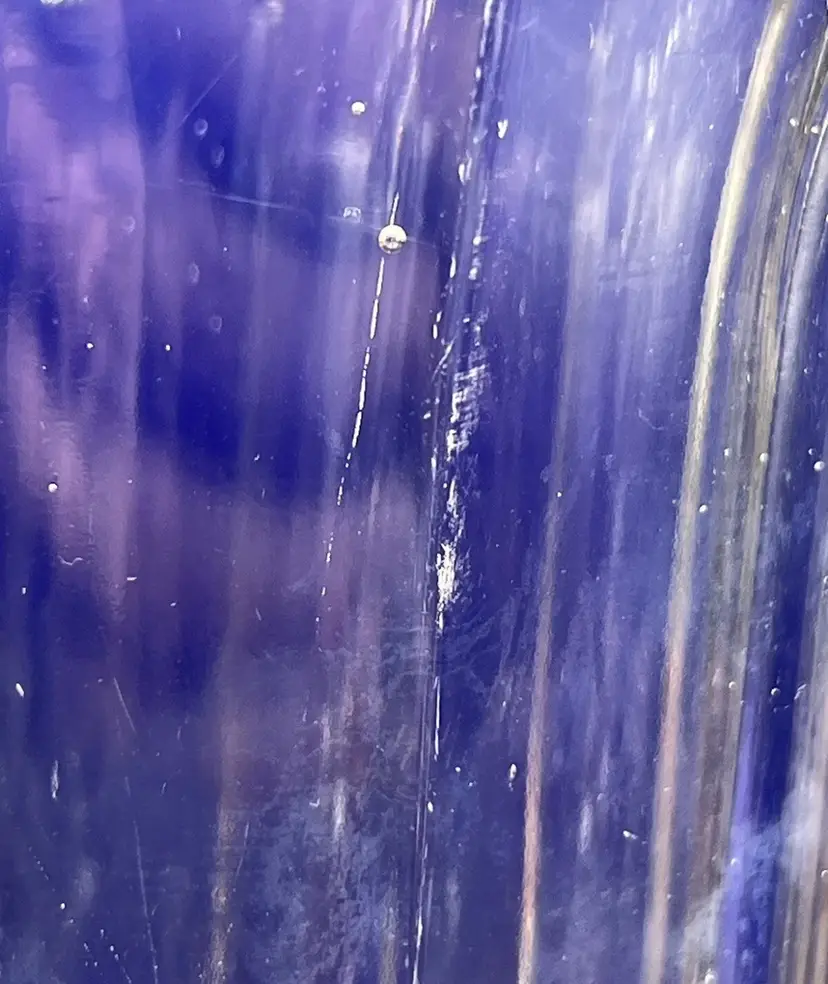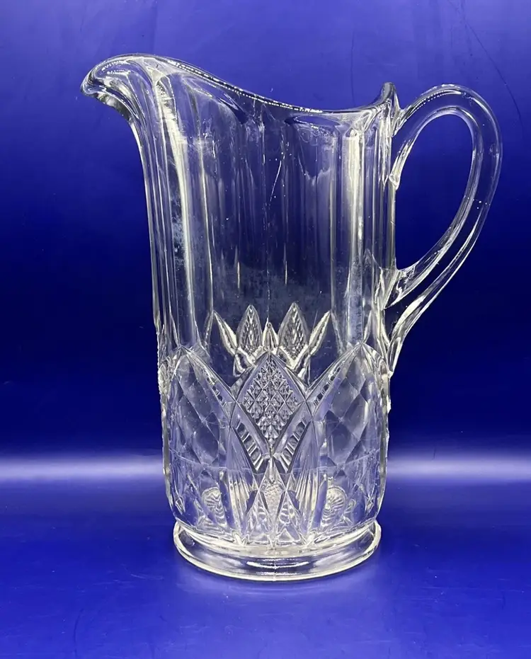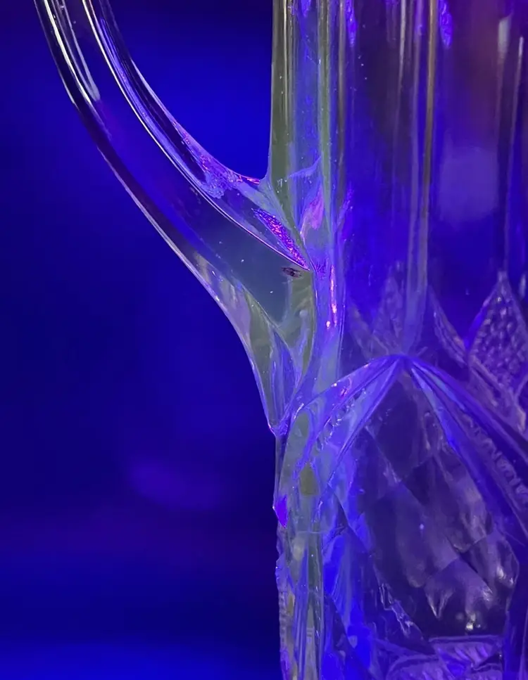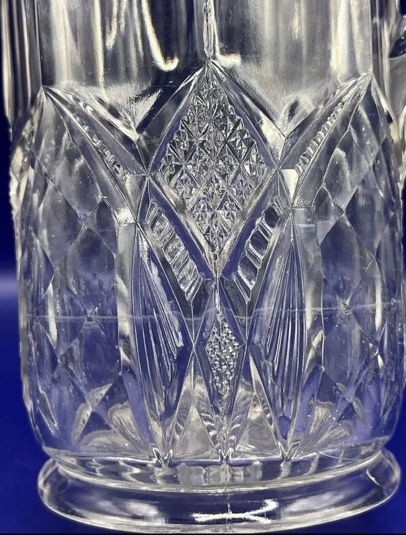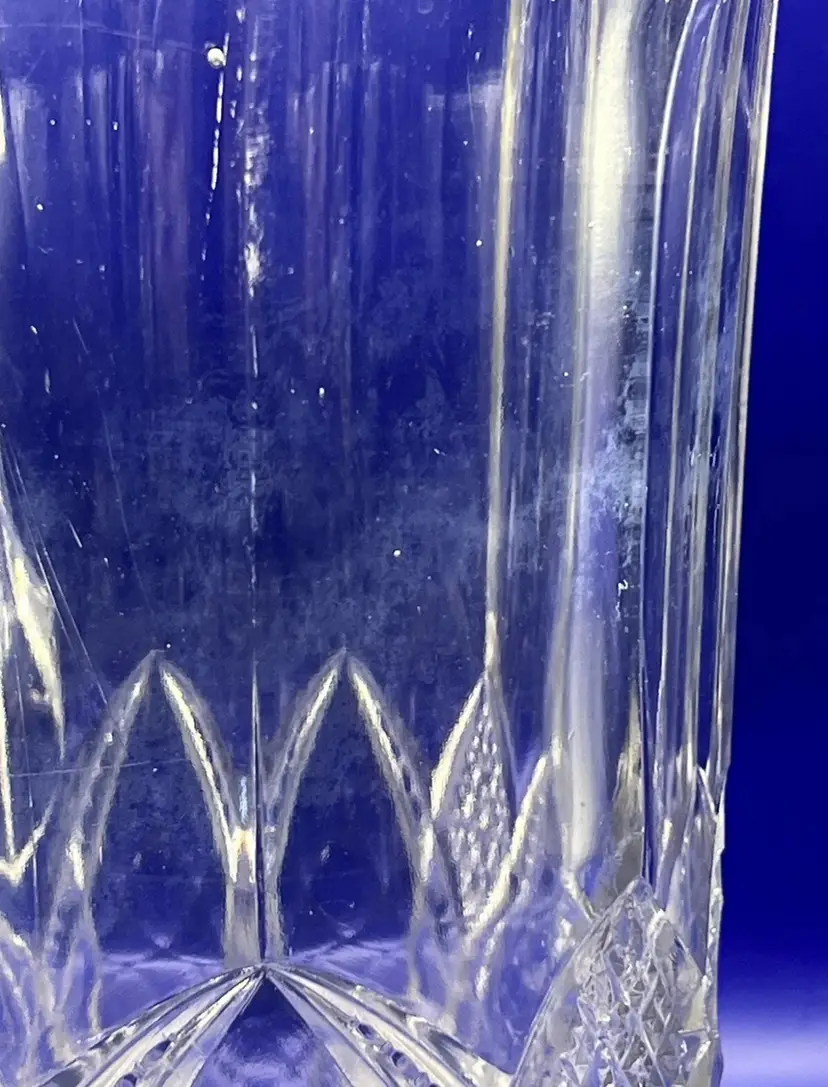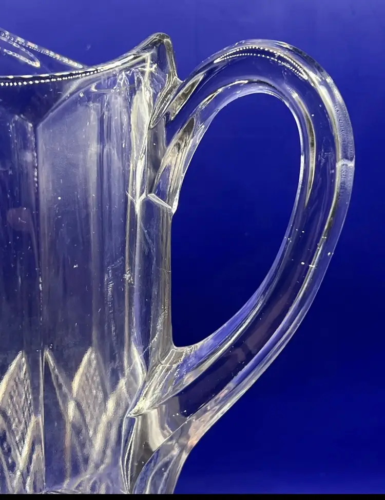 No chips. Has a lot of scratches and some lines inside the glass as well as some indents on the rim that are smooth. There is some cloudiness to the glass in some areas. Very similar to Duncan & Miller’s King Arthur pattern.