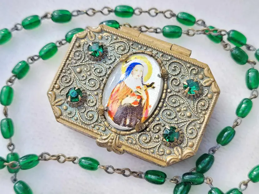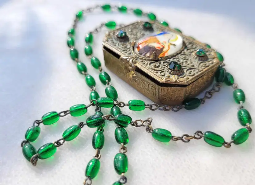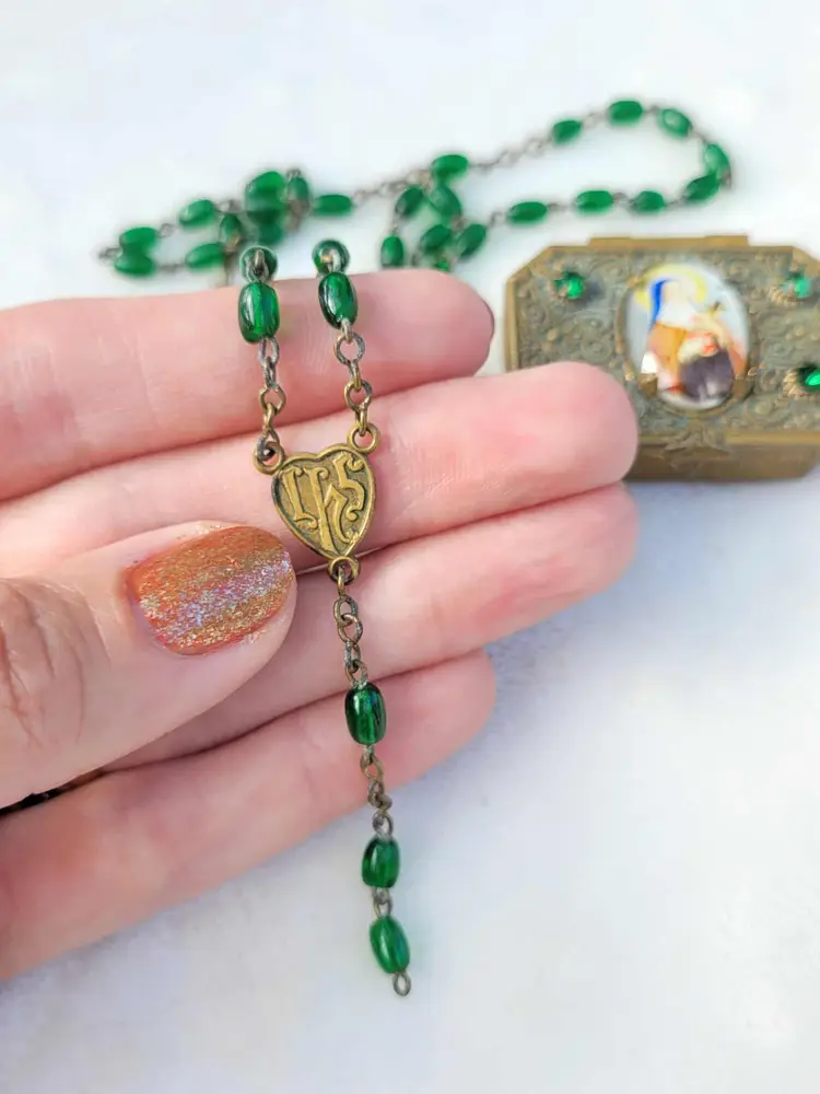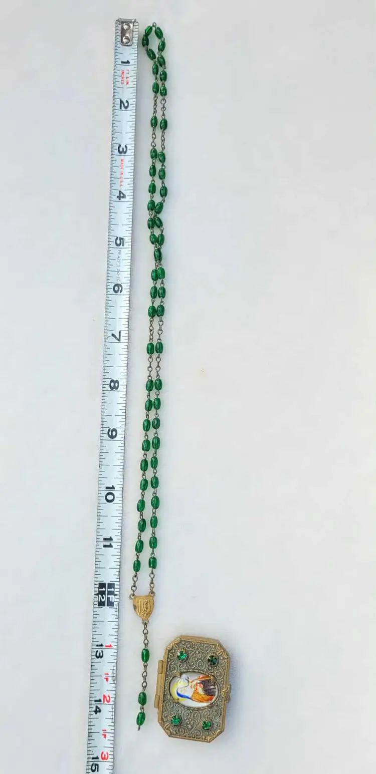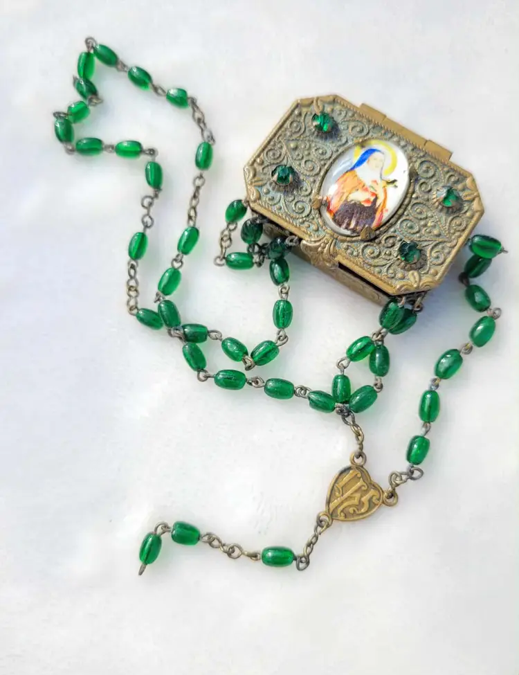 Emerald-green glass beaded rosary, in its original bejeweled brass box with a reverse glass painting of mother Mary in the center. This is from an estate and is circa 1910s, possibly Czech in origin. They are in good condition with some signs of wear and age, please see pictures for details and measurements.