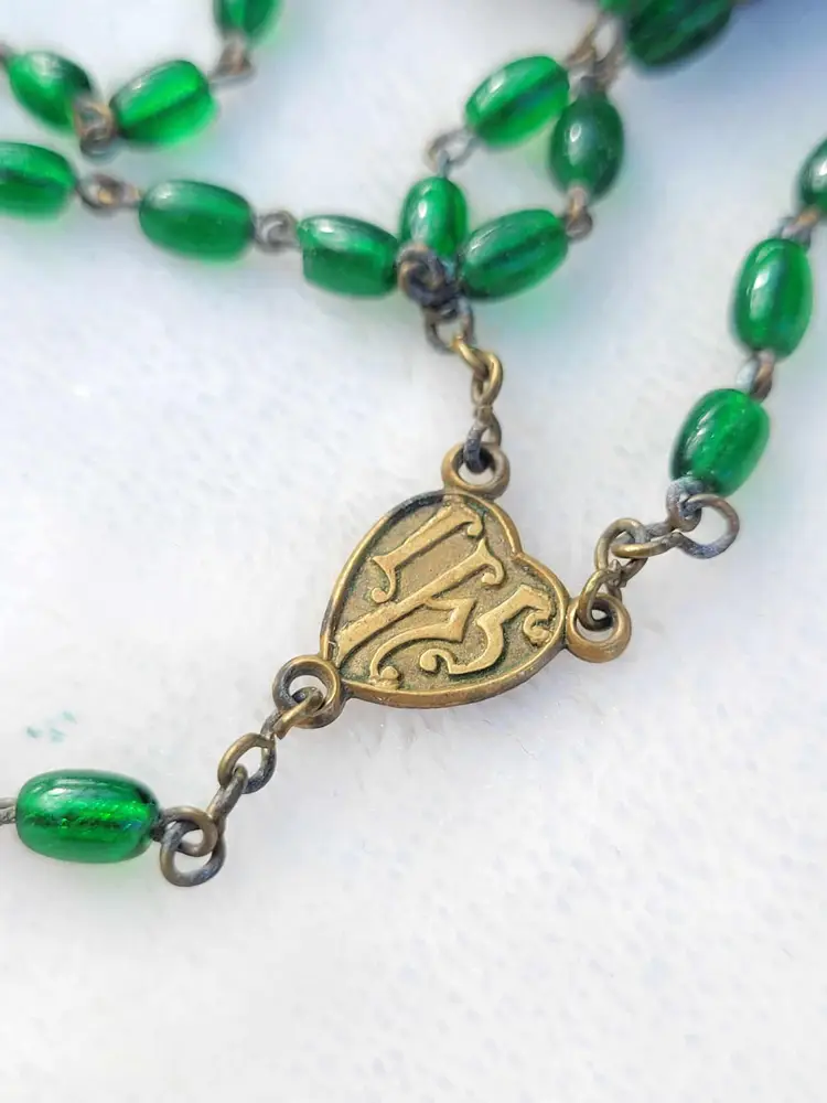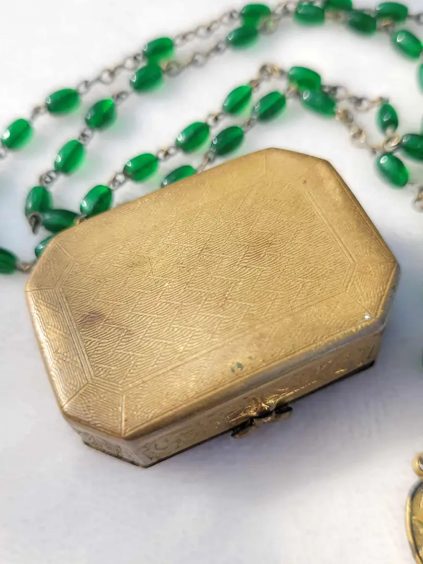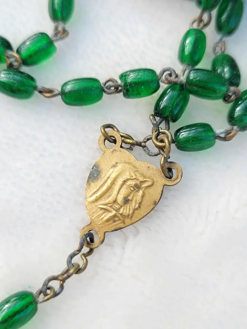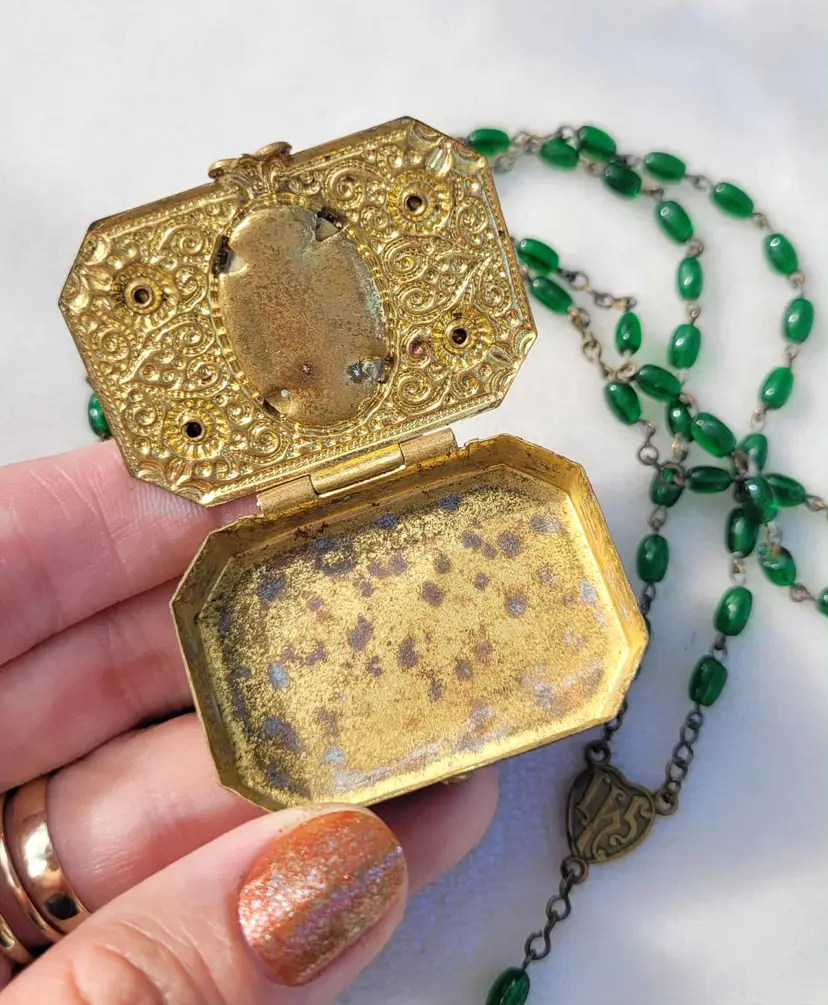 Emerald-green glass beaded rosary, in its original bejeweled brass box with a reverse glass painting of mother Mary in the center. This is from an estate and is circa 1910s, possibly Czech in origin. They are in good condition with some signs of wear and age, please see pictures for details and measurements.