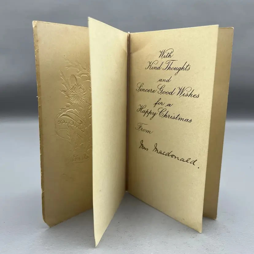 Antique Greeting Card Happy Christmas Alexander Baird & Son Britain Thistle 3x4.5" Beautiful signature inside "Mrs. MacDonald"