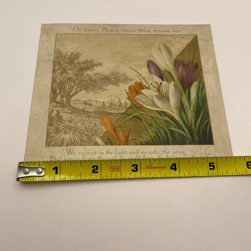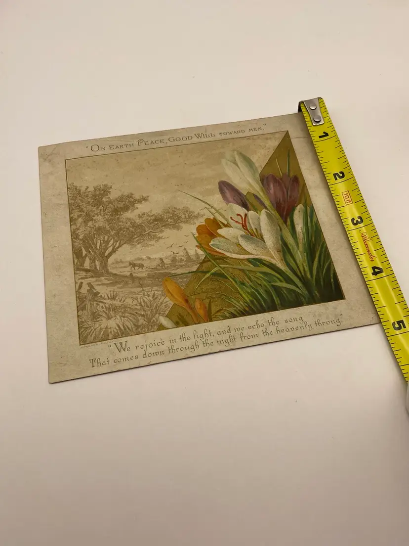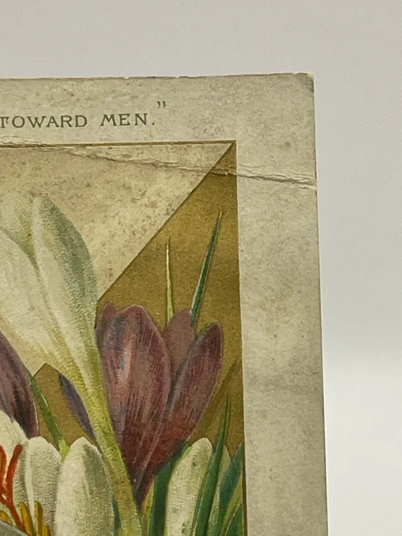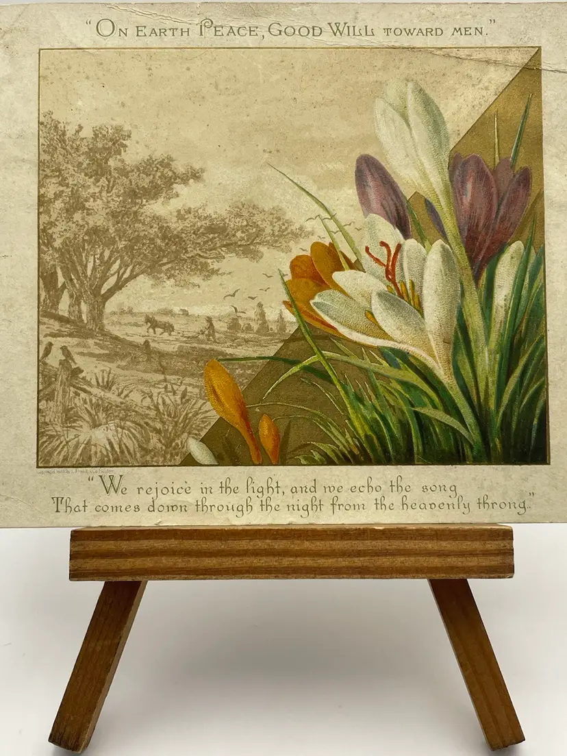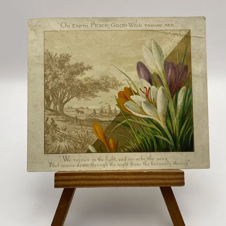 Antique Greeting Card, “On Earth, Good Will Toward Men”, Pretty Crocuses, People Plowing Fields In Background Please see pictures for measurements.