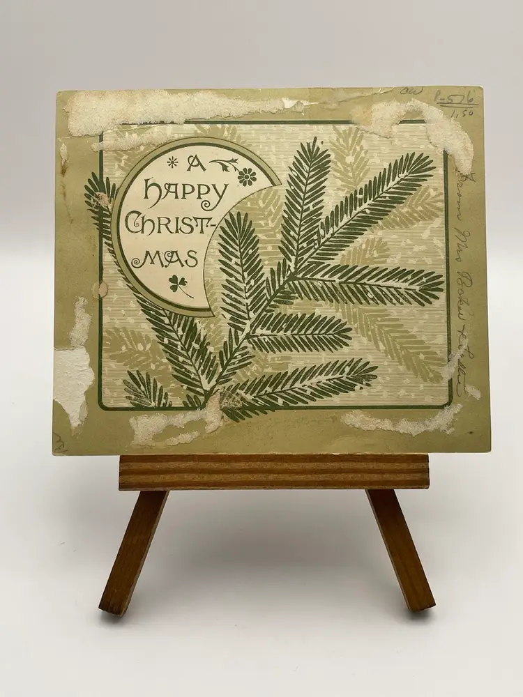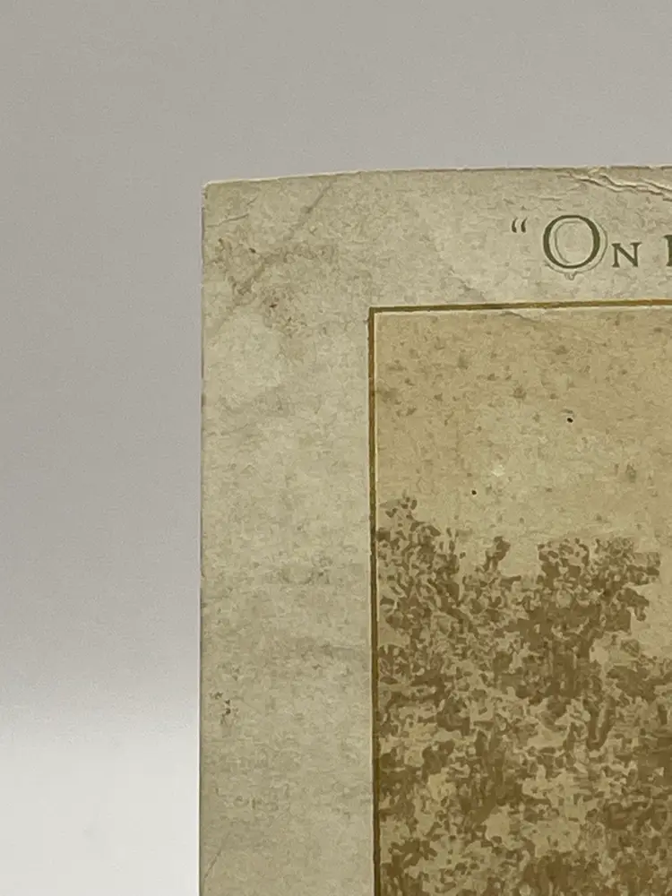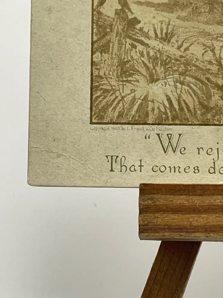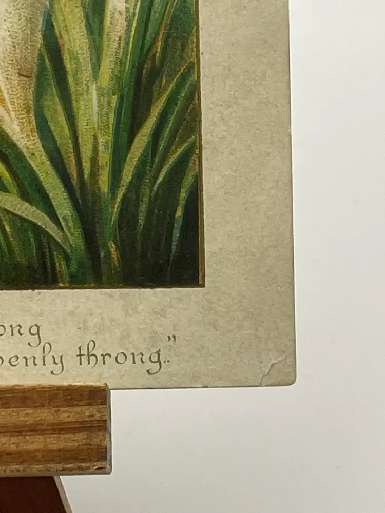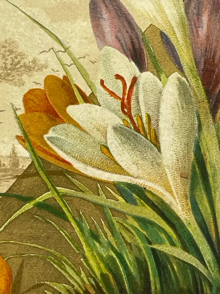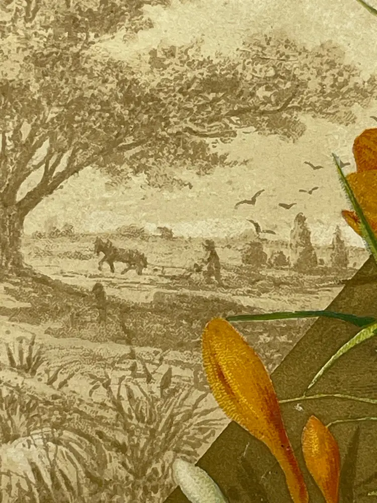 Antique Greeting Card, “On Earth, Good Will Toward Men”, Pretty Crocuses, People Plowing Fields In Background Please see pictures for measurements.