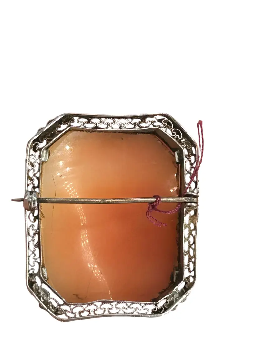 The delicate pewter frame features intricate filigree detailing, perfectly showcasing the beautifully hand-carved shell cameo.