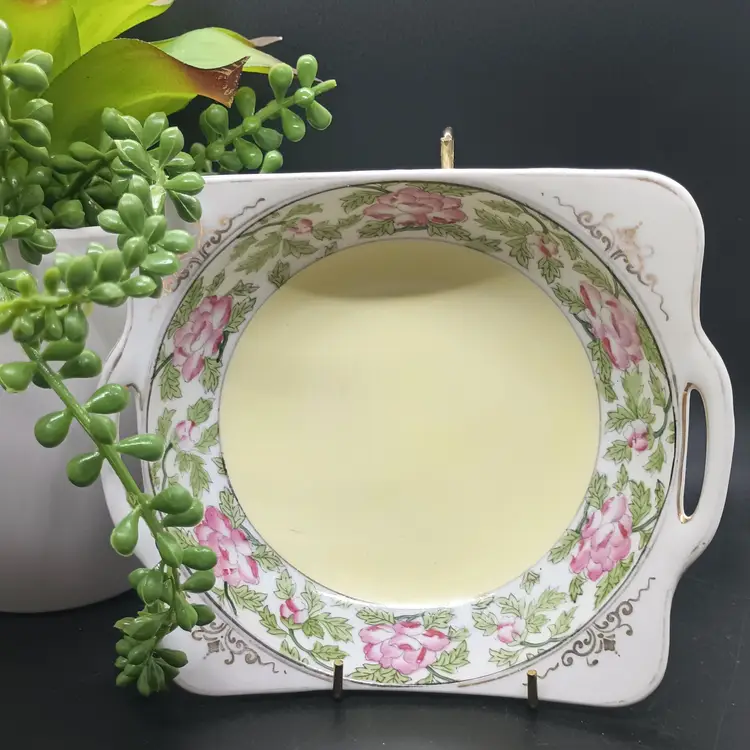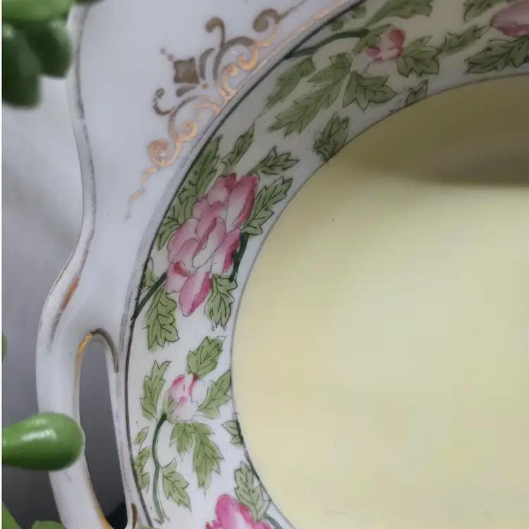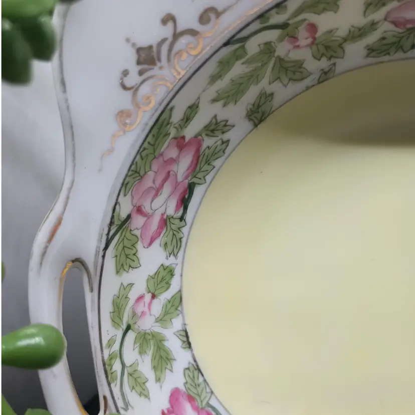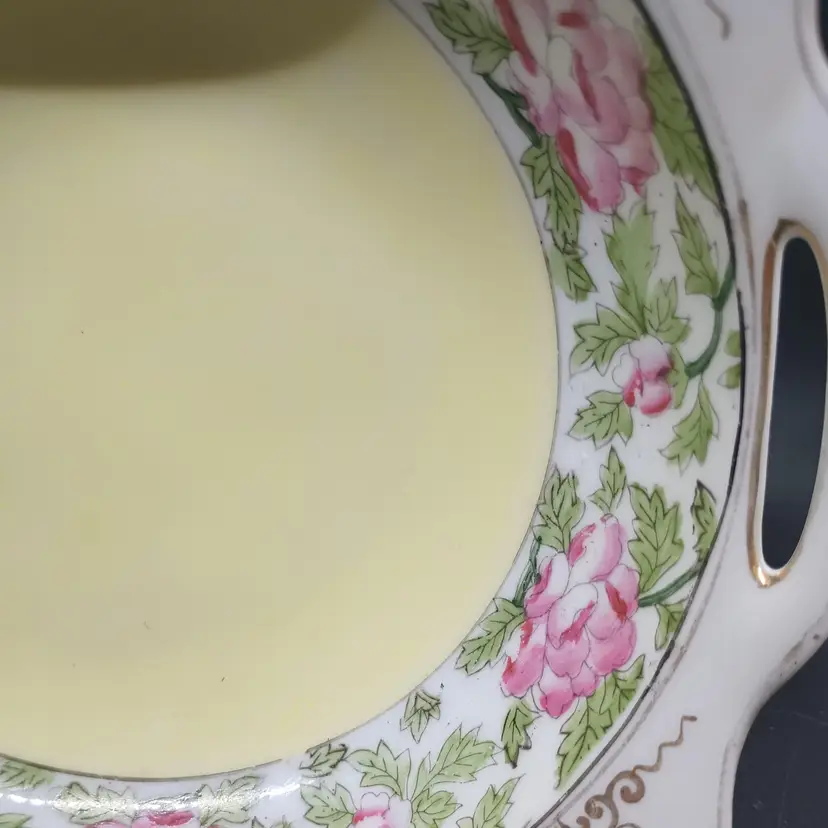This is a lovely bowl marked Nippon and hand painted. There are lovely pink flowers with green leaves and gold filigree with a center yellow bottom of the bowl. The bowl is 7 inches from handle to handle x 6 inches x 1 3/4 inches deep. Items marked "Nippon" mean it was created and imported between 1891 and 1921. Stand is not included in the sale.