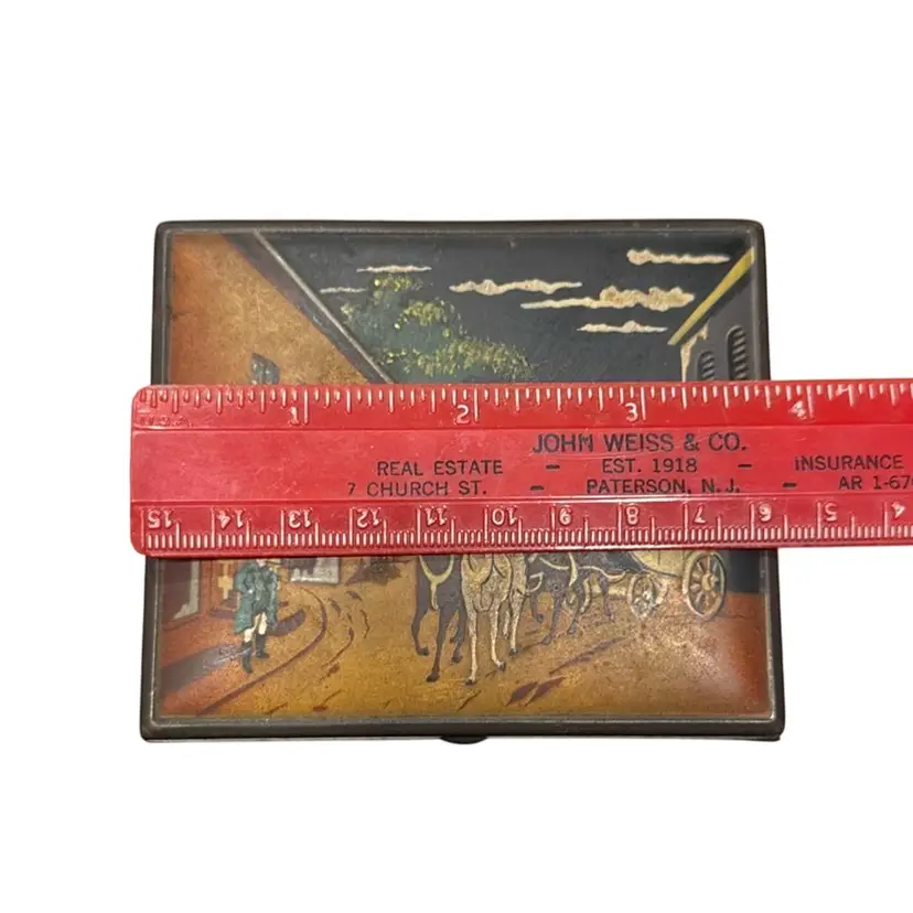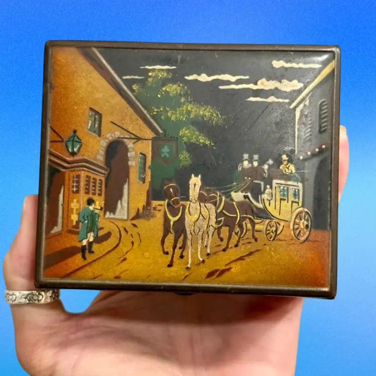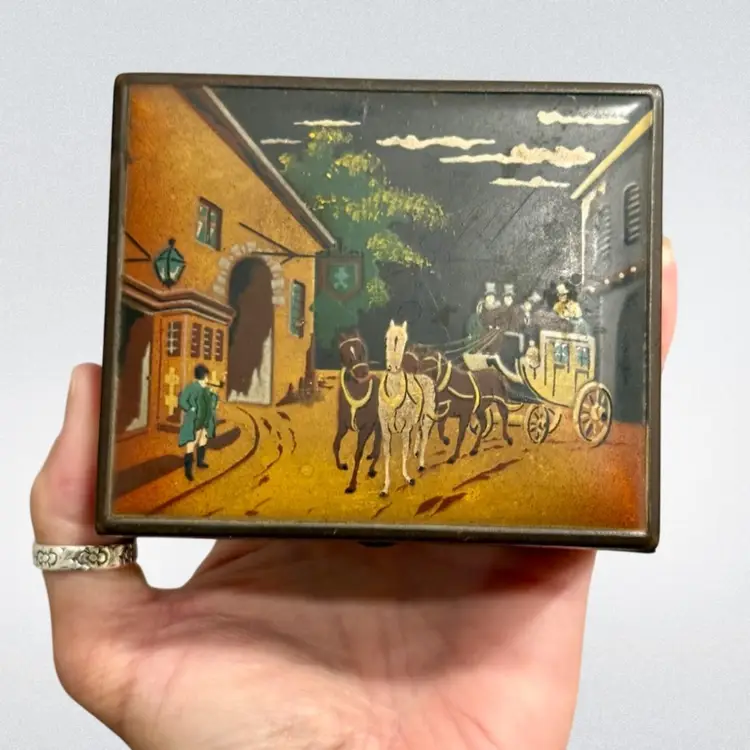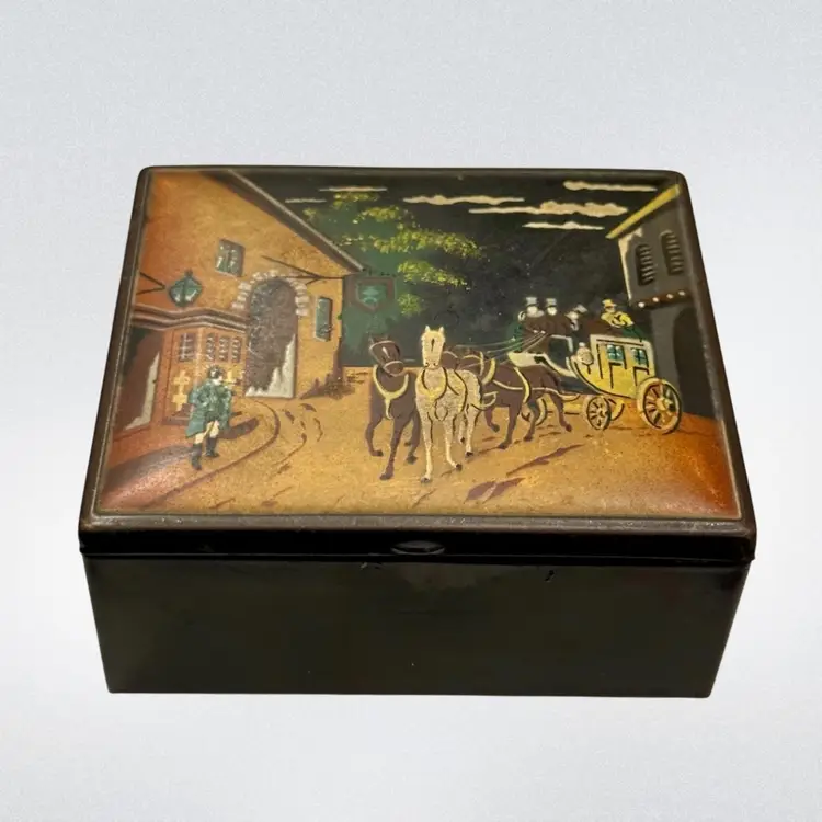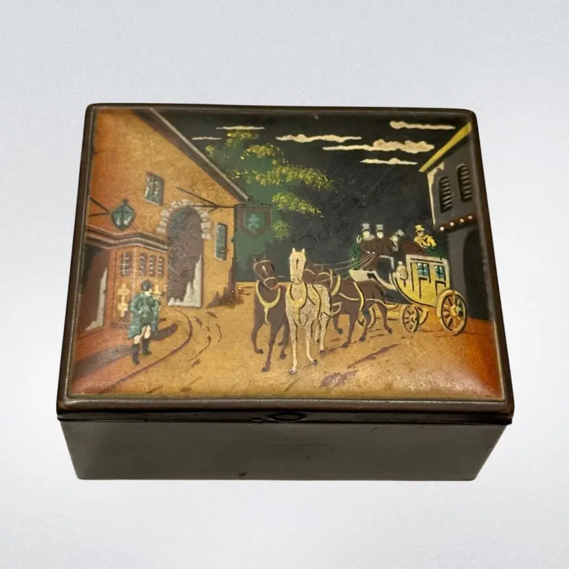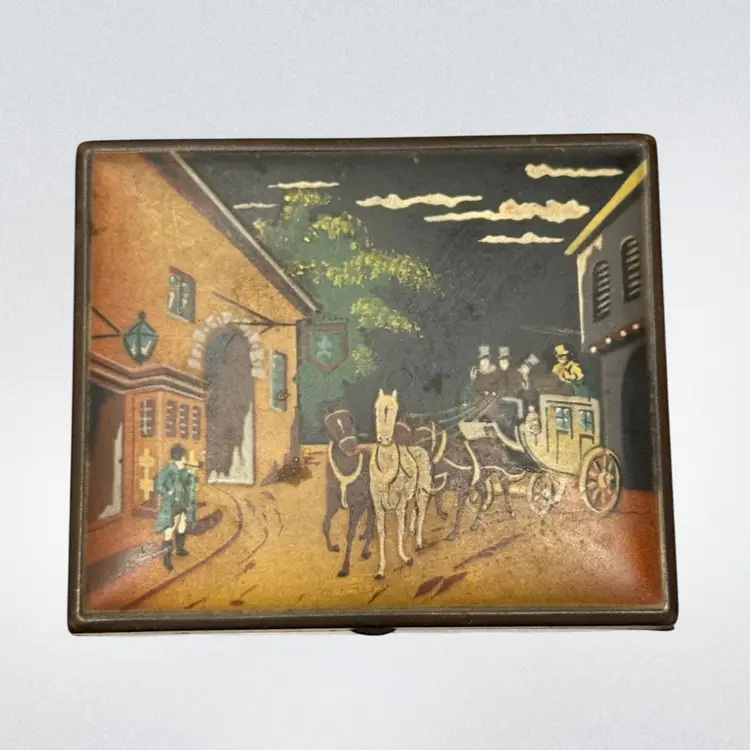 Antique Hand Painted Trinket Box English Stagecoach 4”
