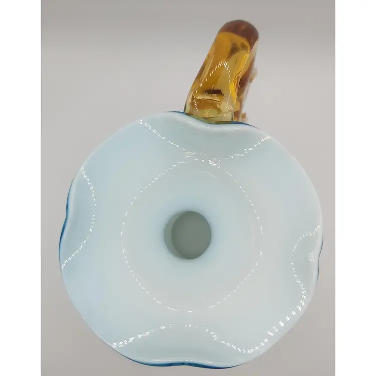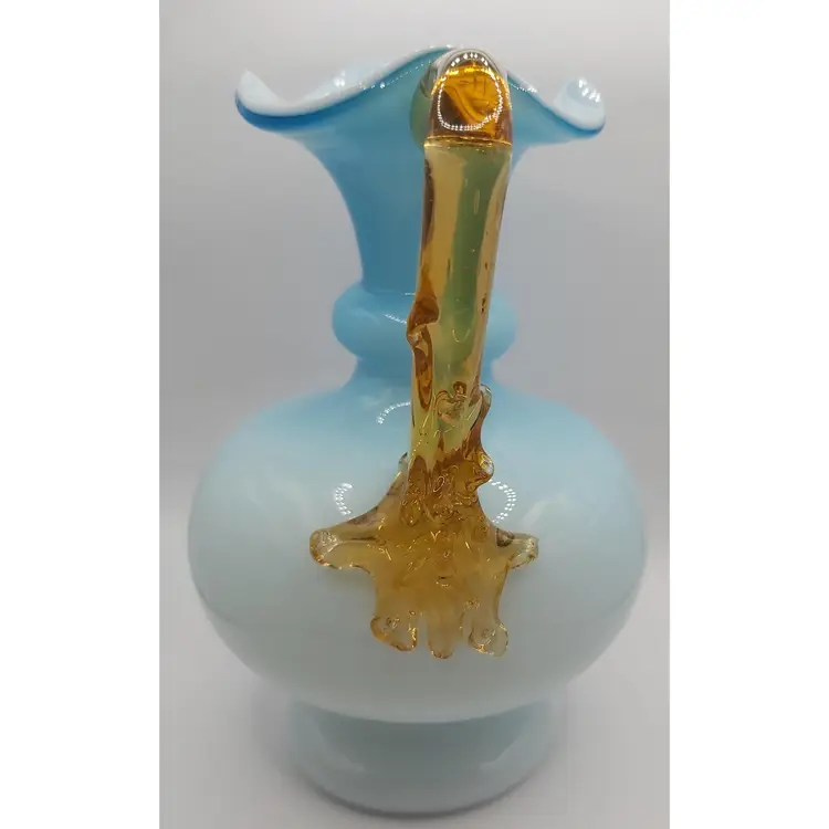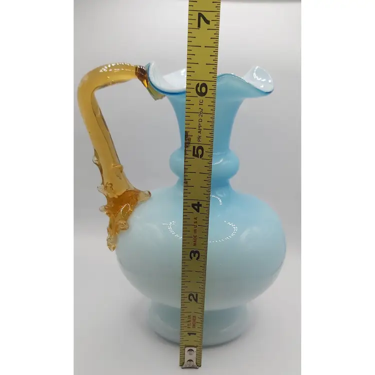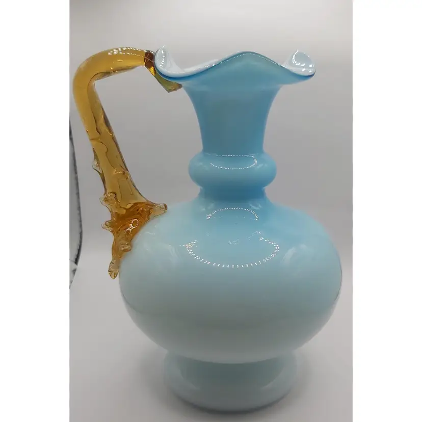 Beautiful antique handblown glass pitcher with unique applied amber handle. Excellent condition with no chips or cracks.