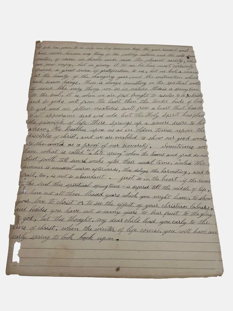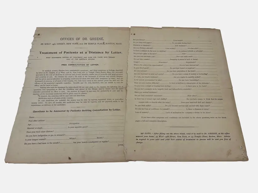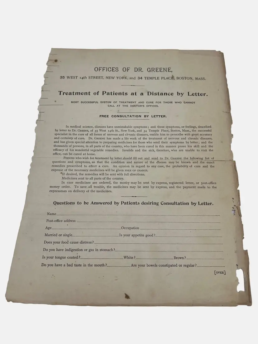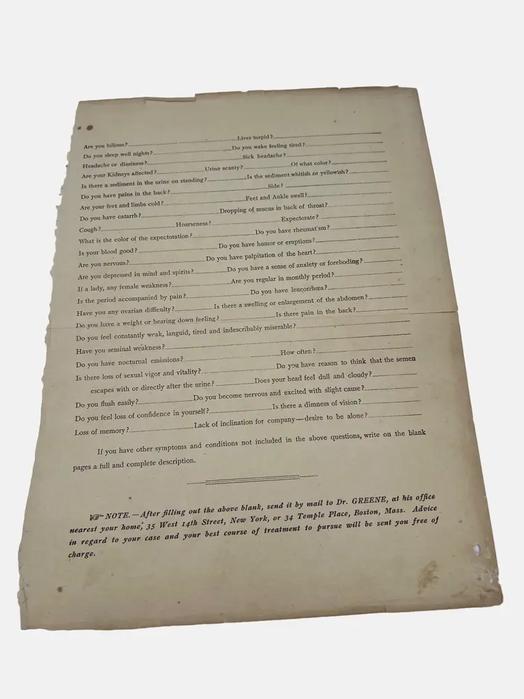 Vintage handwritten sermon notes / devotional thoughts on the back of long-distance medical consultation by mail forms by Dr. Greene. It appears that Dr. Greene had an office at the New York address listed between 1887 and 1901. The questionnaire consists of a series of questions that the patient would answer and then a long-distance diagnosis would be done by Dr. Greene. From other things found when researching the medical form it appears that Dr. Greene was also involved in quack medicine tonics. A unique and historical collector's piece.