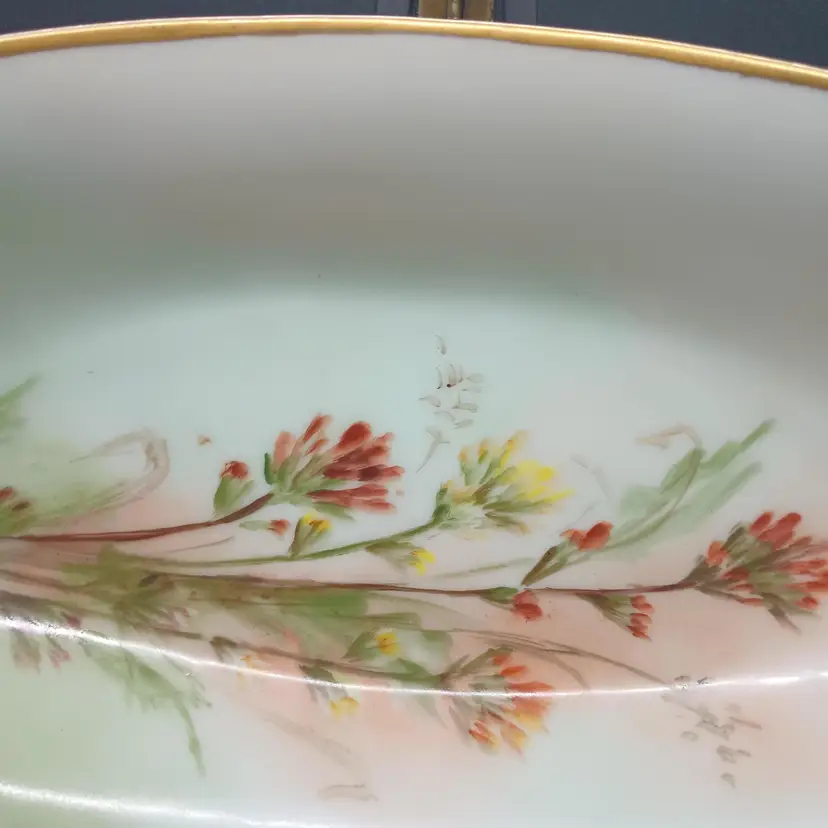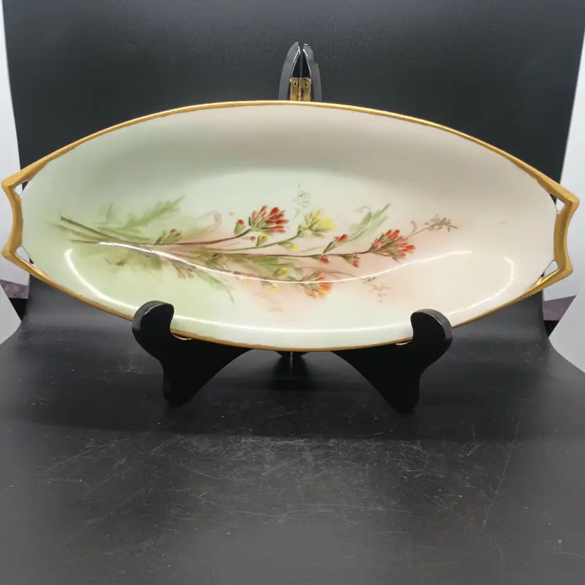 This lovely dish measures 13x5 3/4 x 2 and would have typically probably been used for bread. Research on the mark indicates that it is from 1857 to 1920. There are no chips or cracks to this lovely dish and the gold trim is in excellent condition.