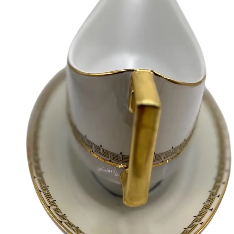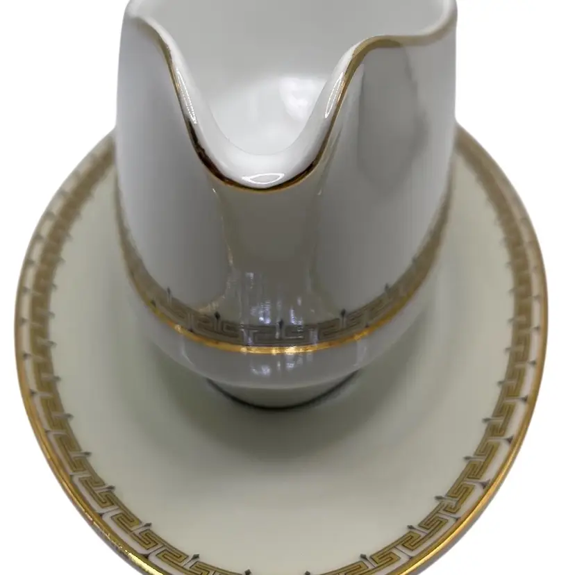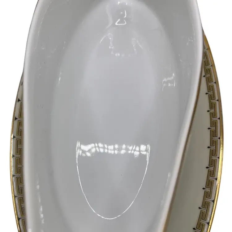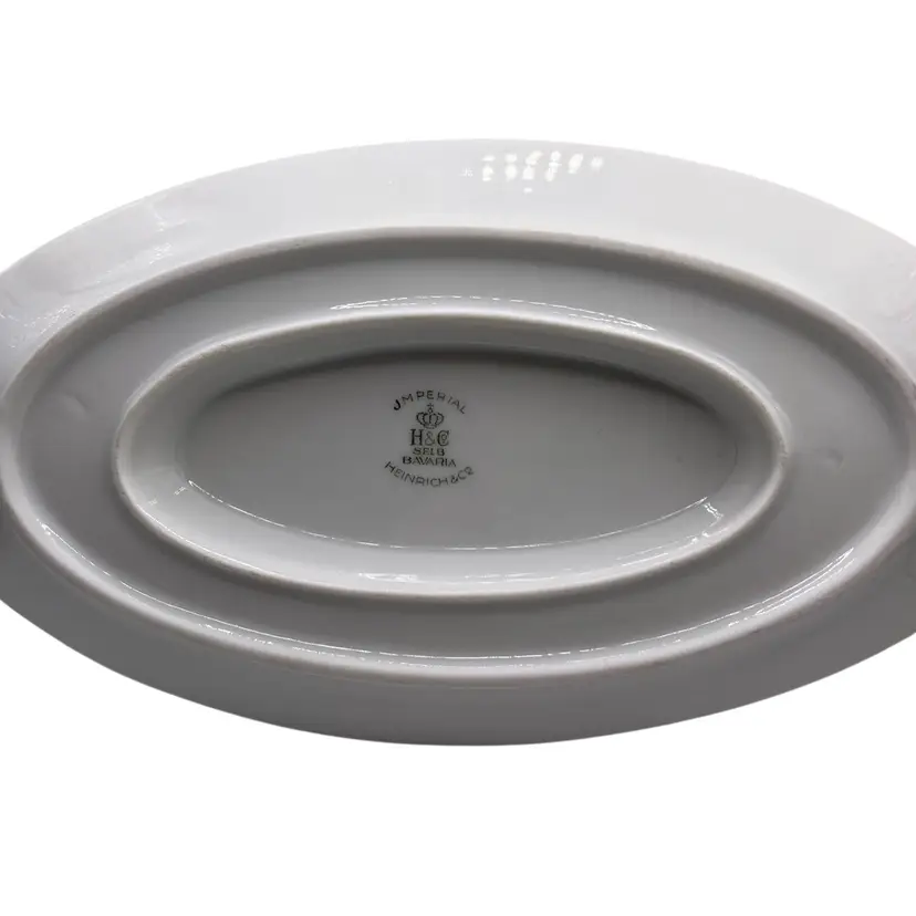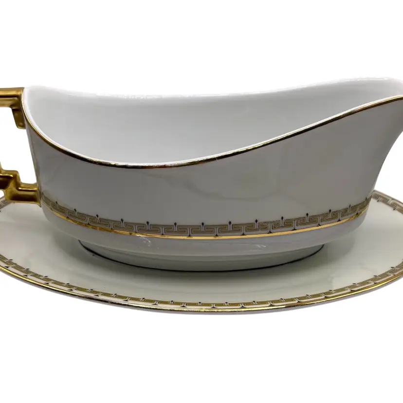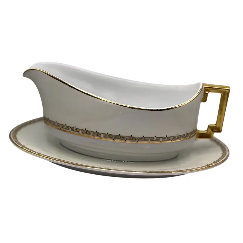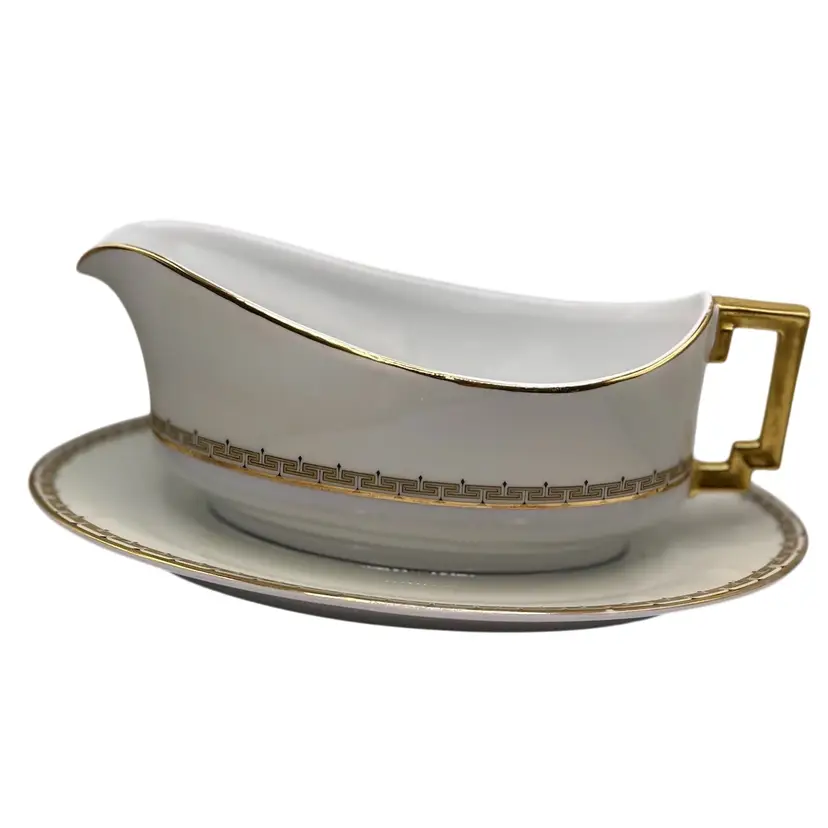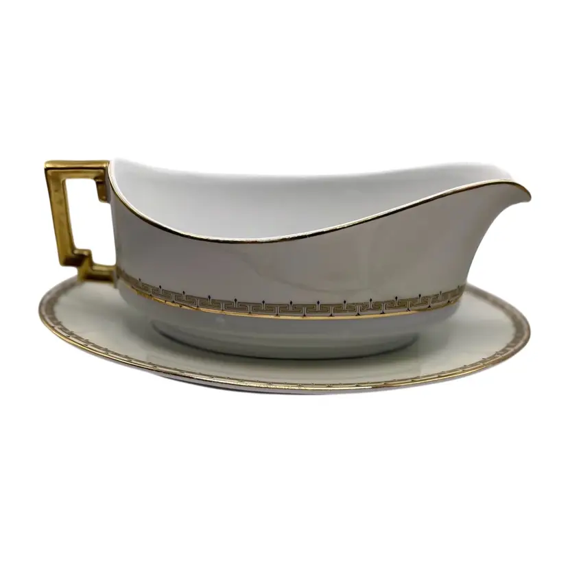 In time for Holiday in EUC . This is a high quality Heinrich & Co gravy boat with attached underplate in the Regent pattern. It measures approx. 9" by 3.5" tall. It is in excellent overall condition with no chips or cracks and a nice, shiny finish. No utensil marks. Very minimal gold loss. This pattern is circa 1914.