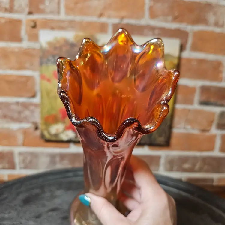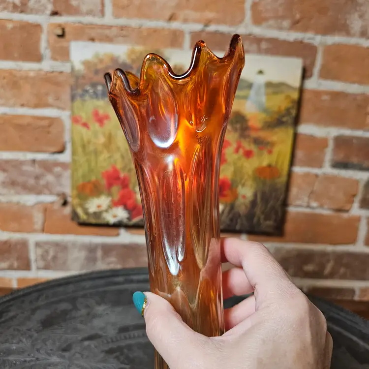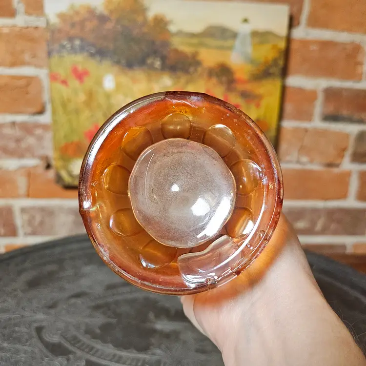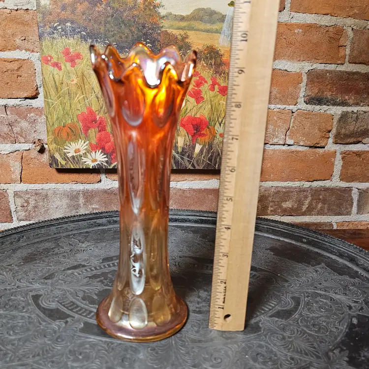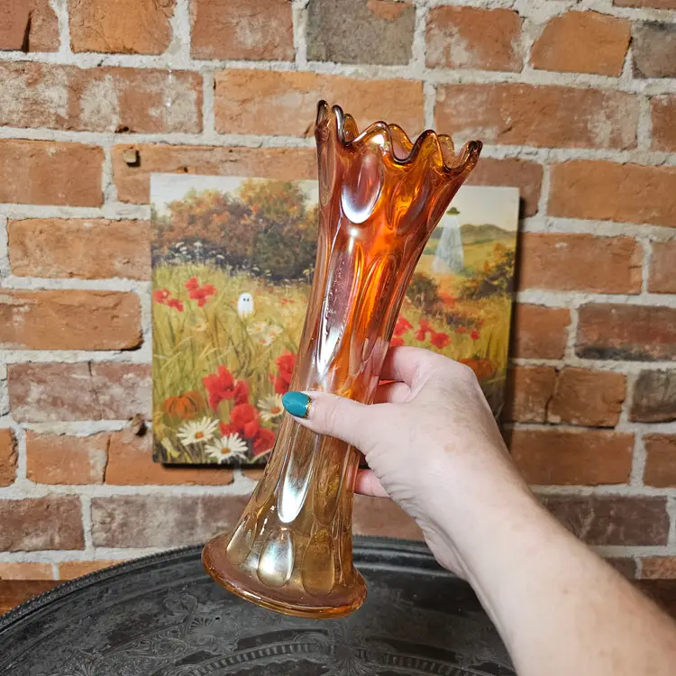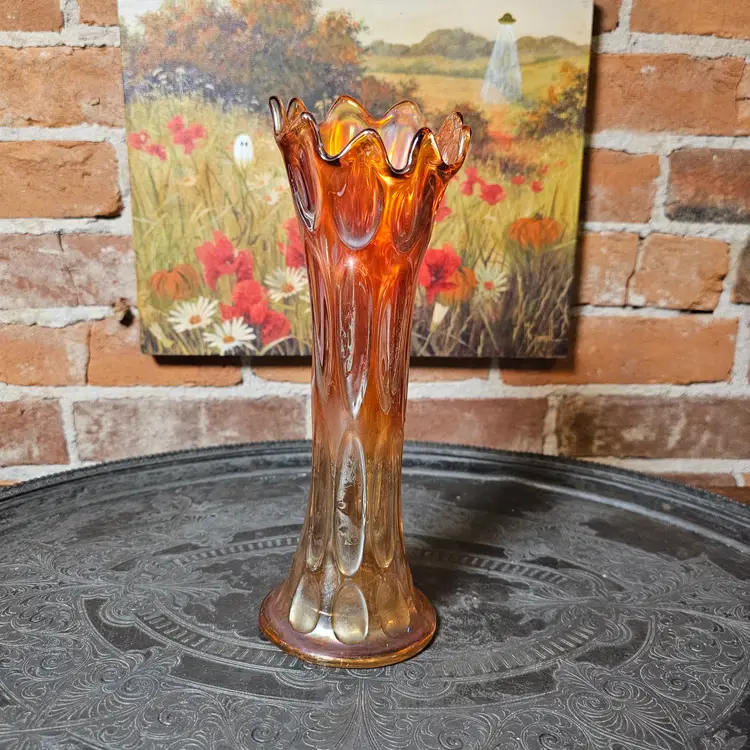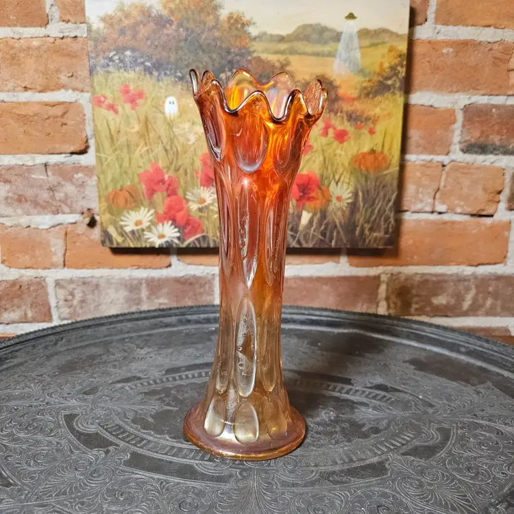 Details: The vase has elongated oval indents around the body that resemble heavy thumbprints. The ruffled/flared top and iridescent marigold finish are classic Imperial features. The base shows the typical ground/polished pontil-free molded finish Imperial used.