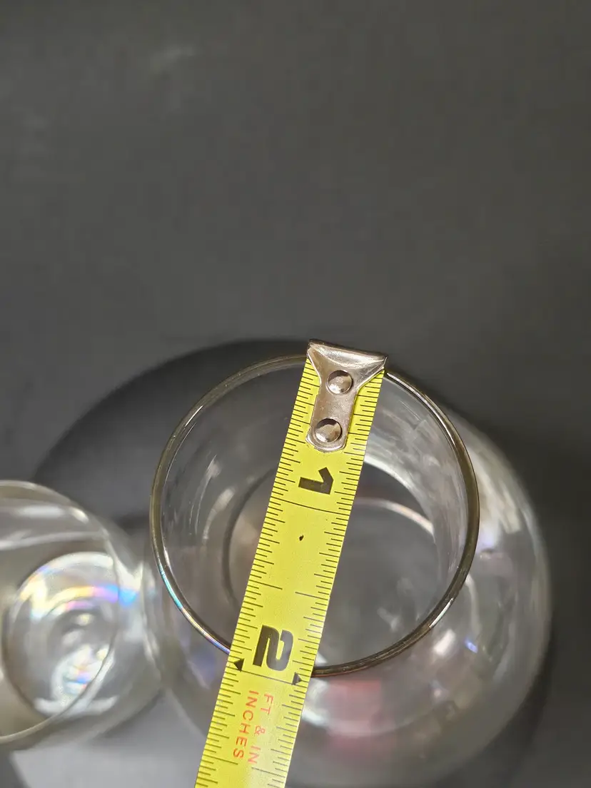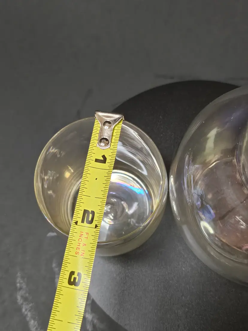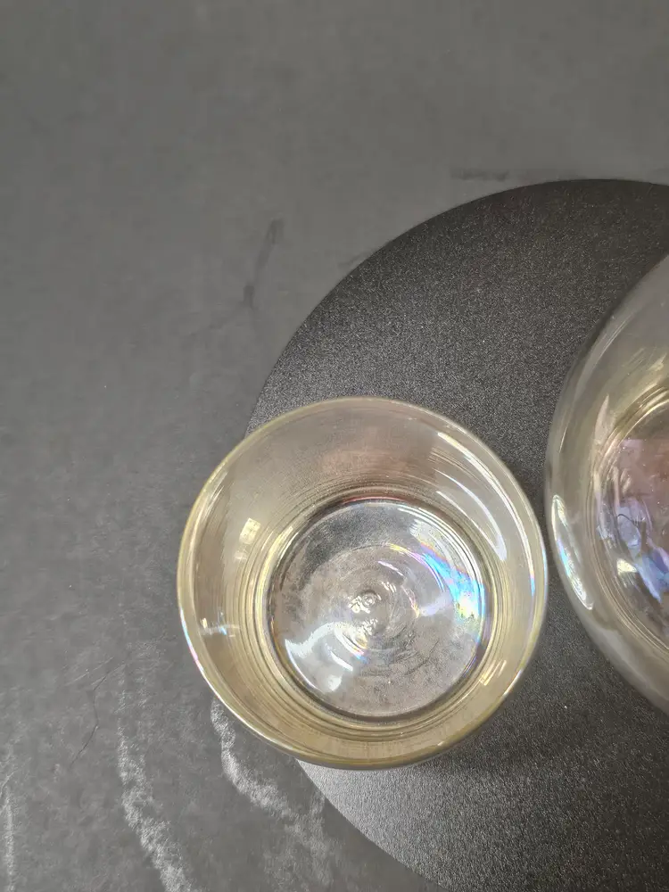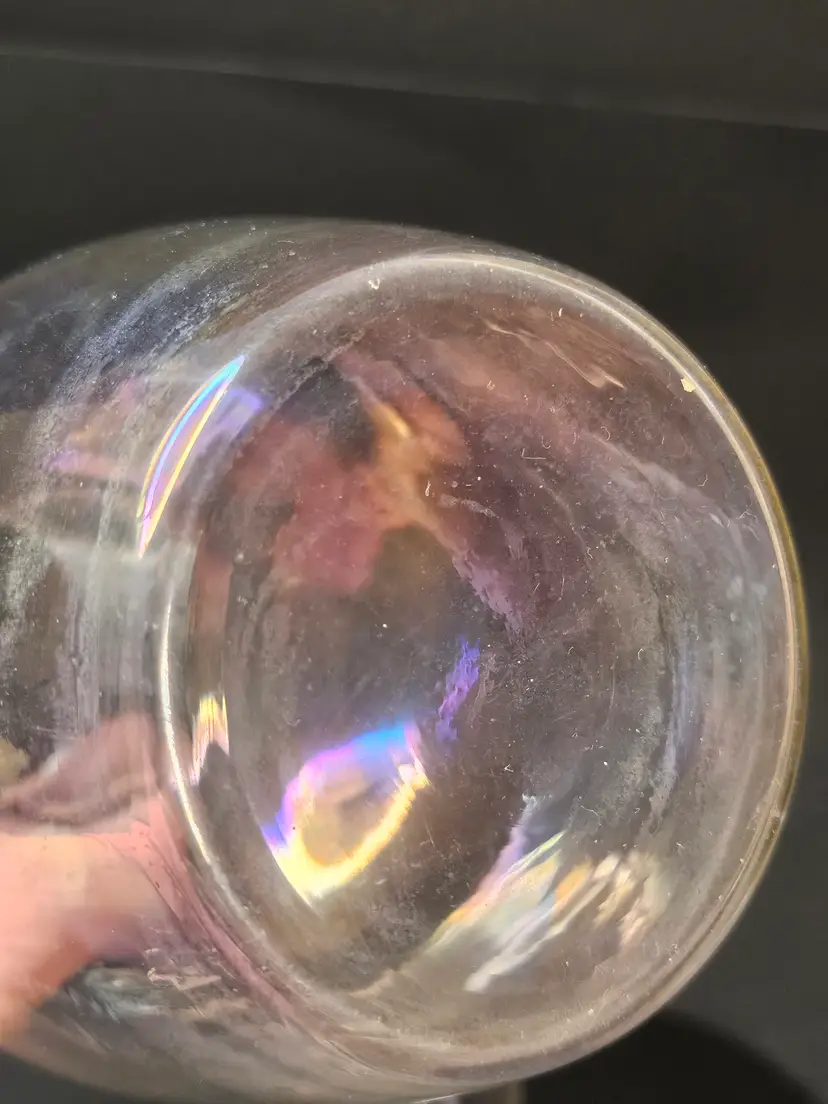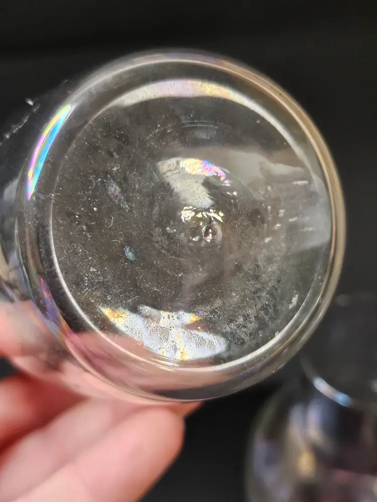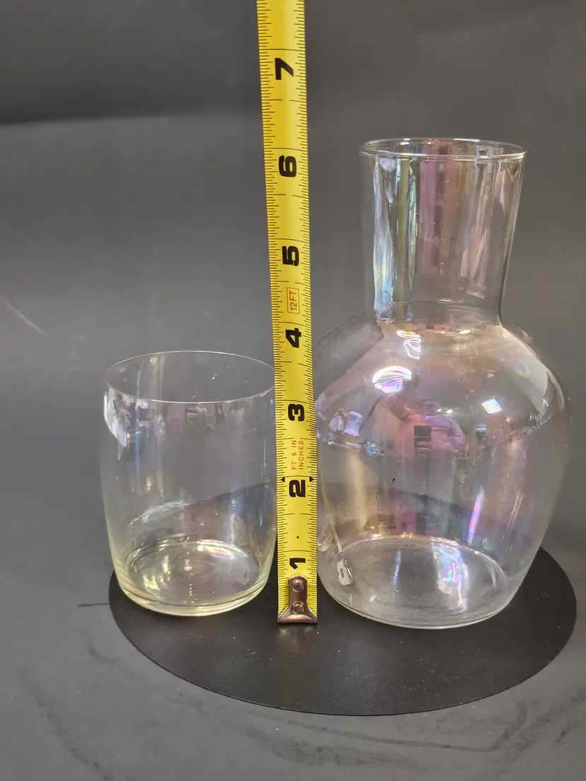 This product is an antique 2-piece tumblers and carafe set made of iridescent clear glass. The Victorian-style drinkware is hand-blown and features a glossy finish. It is a unique piece that would be perfect for all occasions, adding a touch of vintage charm to any table setting. The brand is unmarked, and it is recommended to hand wash only to maintain its original beauty. Ideal for collectors or those looking to add a touch of old-world elegance to their home bar or kitchen.