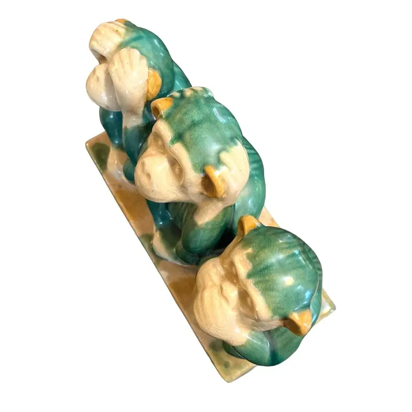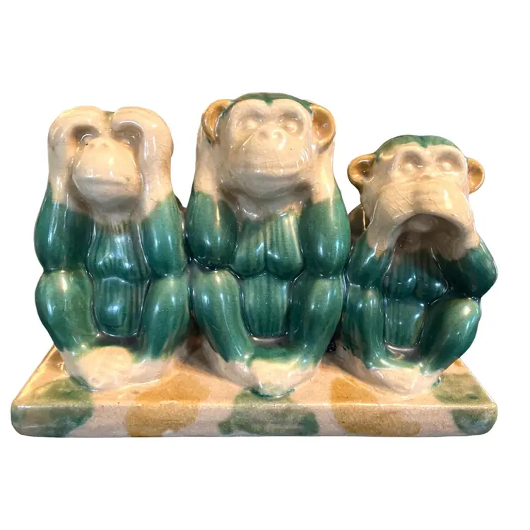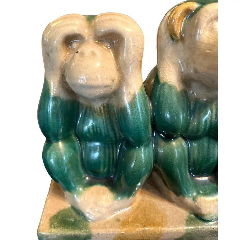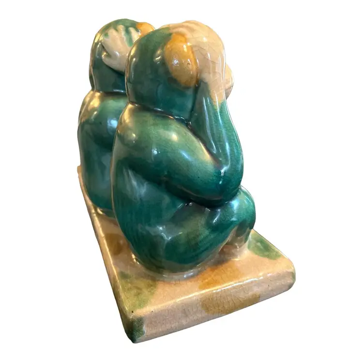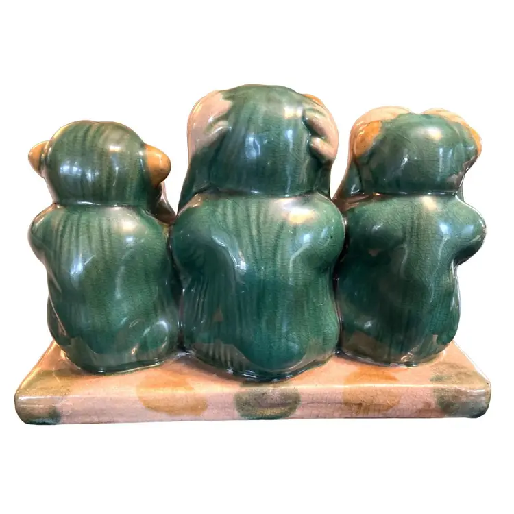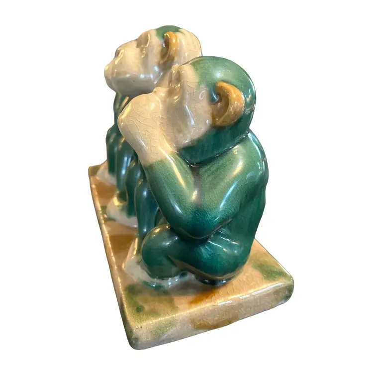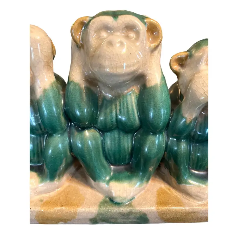 This Italian Pottery Figural Monkeys are in Very Good Antique Condition. No chips or cracks but shows crazing typical for a piece of this age. Features 3 Monkeys. Hear No Evil, See No Evil, Hear No Evil. Measures 12" Long x 8.5" Tall x 5" Deep