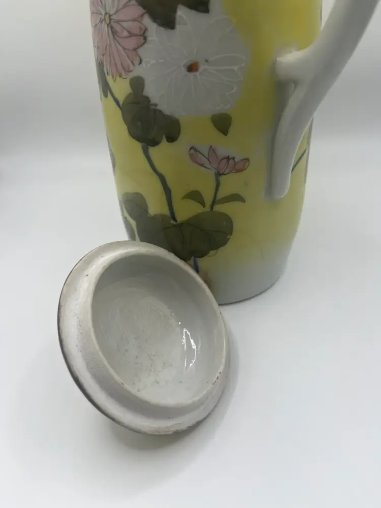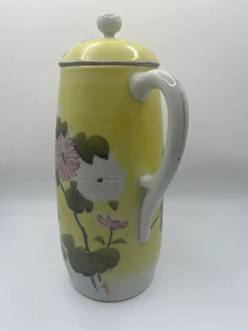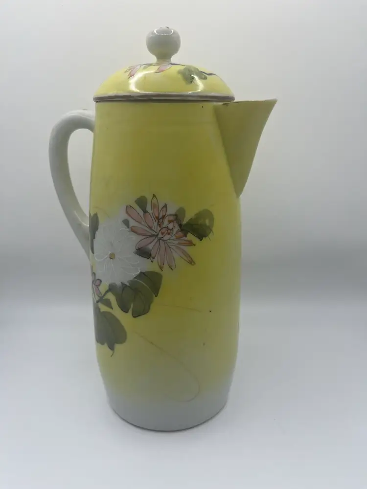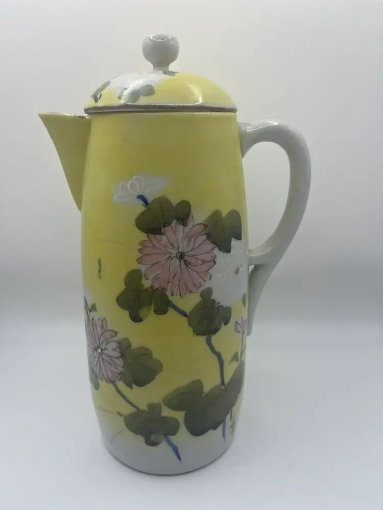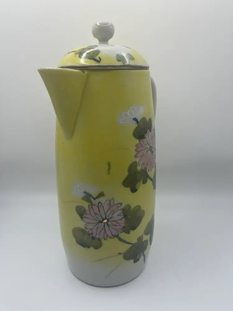 Antique Japanese Teapot. Signed on bottom. Hand painted. Yellow With Pink, White, Green Floral. No chips or cracks. Stands approximately 9 1/2” tall Great condition for age.