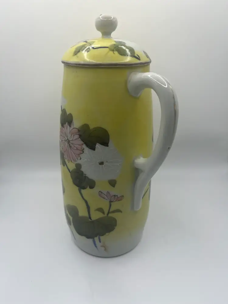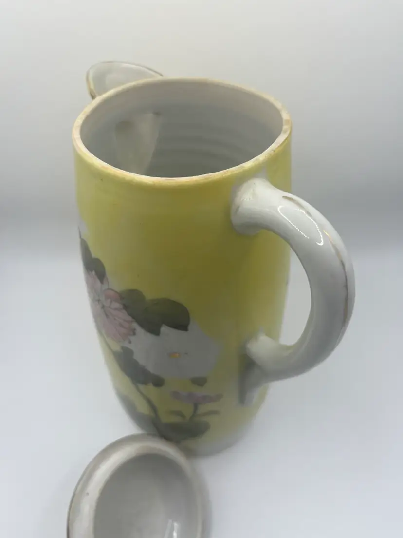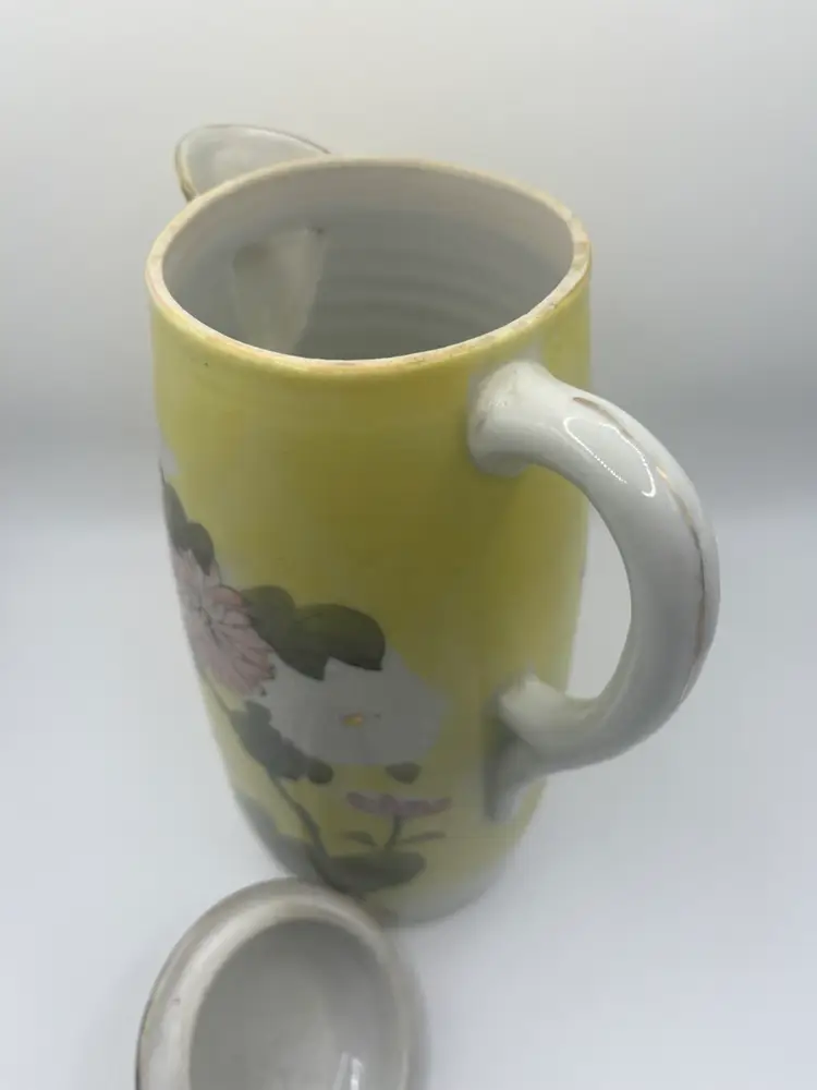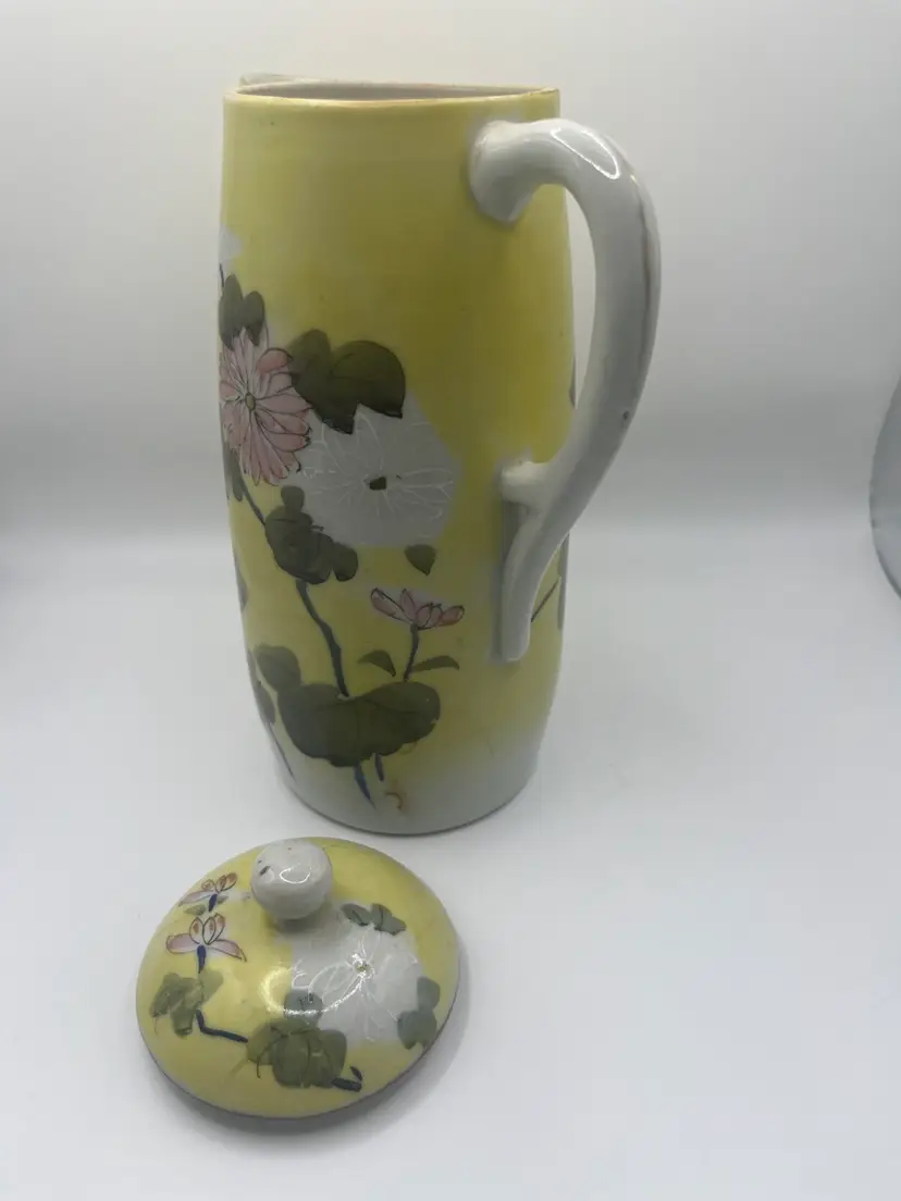 Antique Japanese Teapot. Signed on bottom. Hand painted. Yellow With Pink, White, Green Floral. No chips or cracks. Stands approximately 9 1/2” tall Great condition for age.