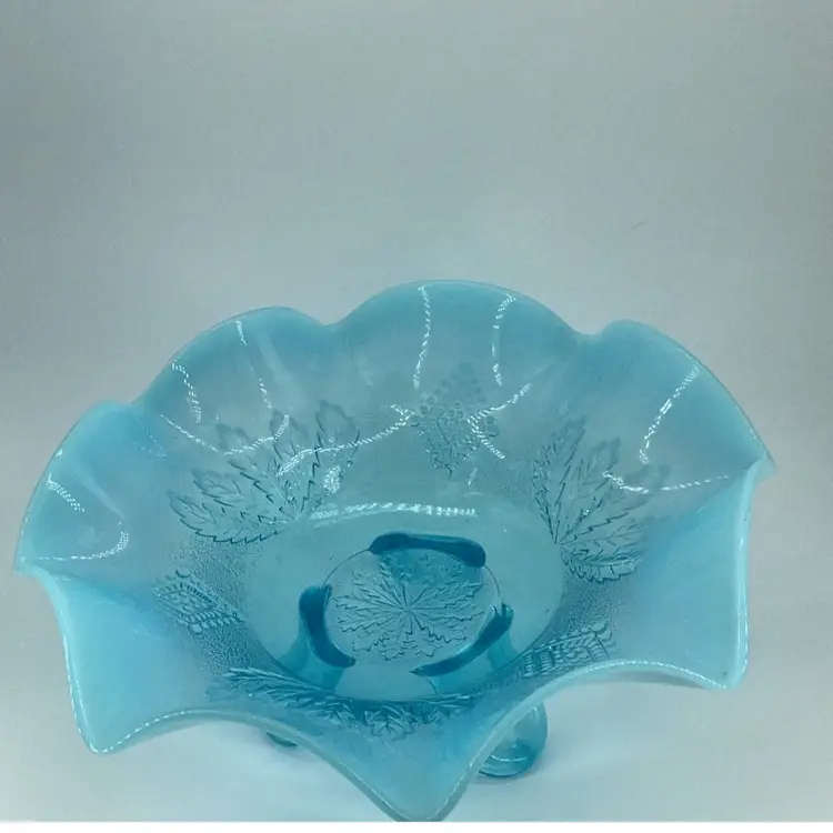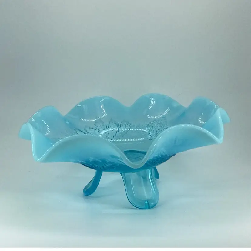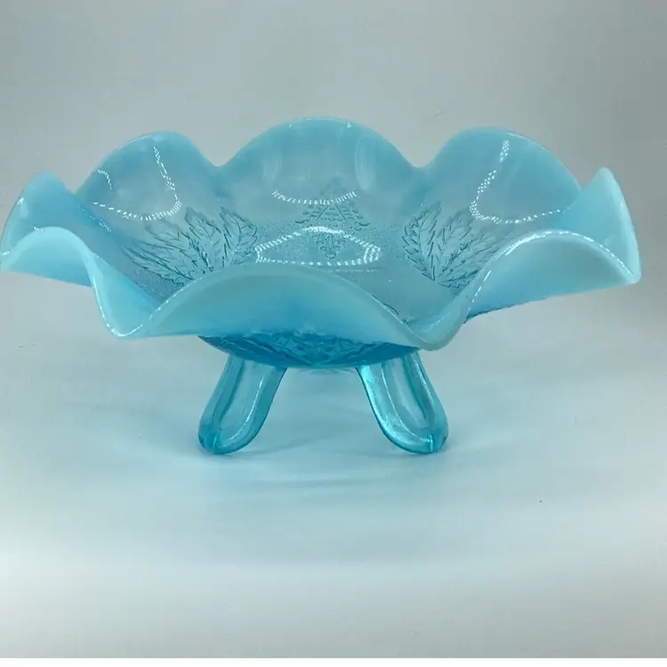 This piece is a blue opalescent ruffled and footed dish made by the Jefferson GlassCompany in Follansbee, WV. It is in the “Diamond Leaf” pattern. There are no condition issues. It stands 3.5 inches tall and 8 inches across the top.