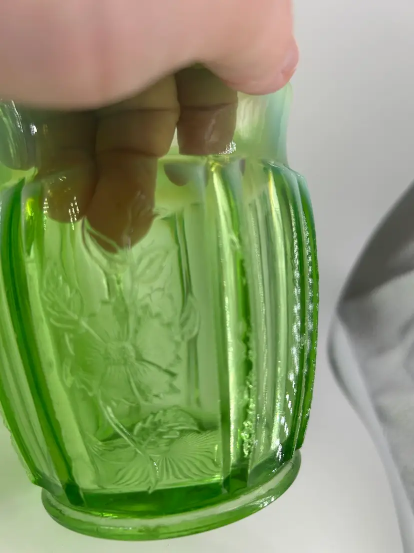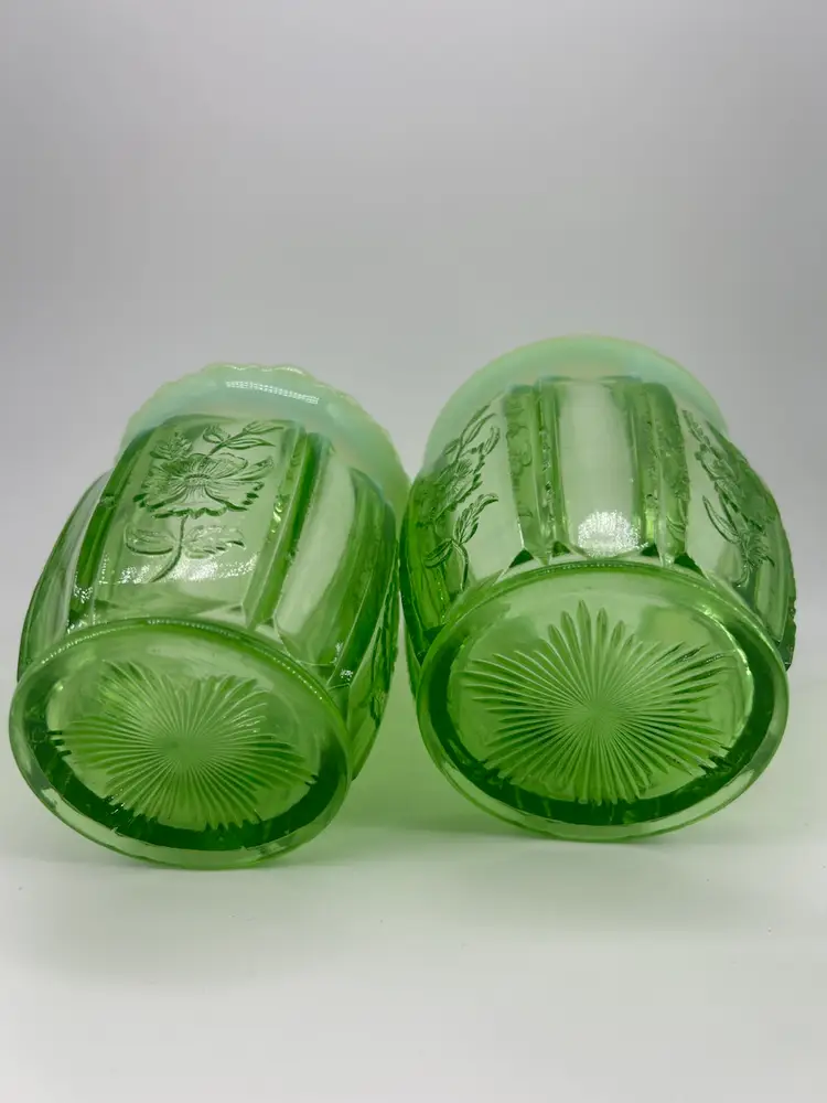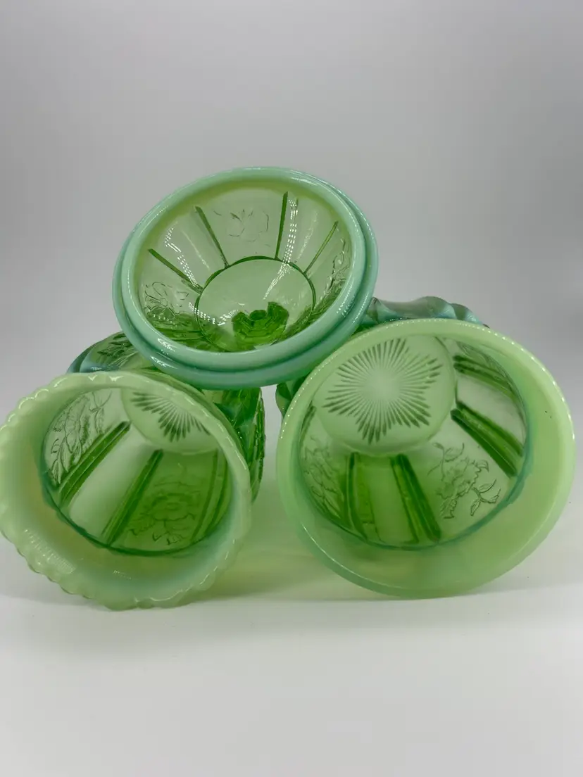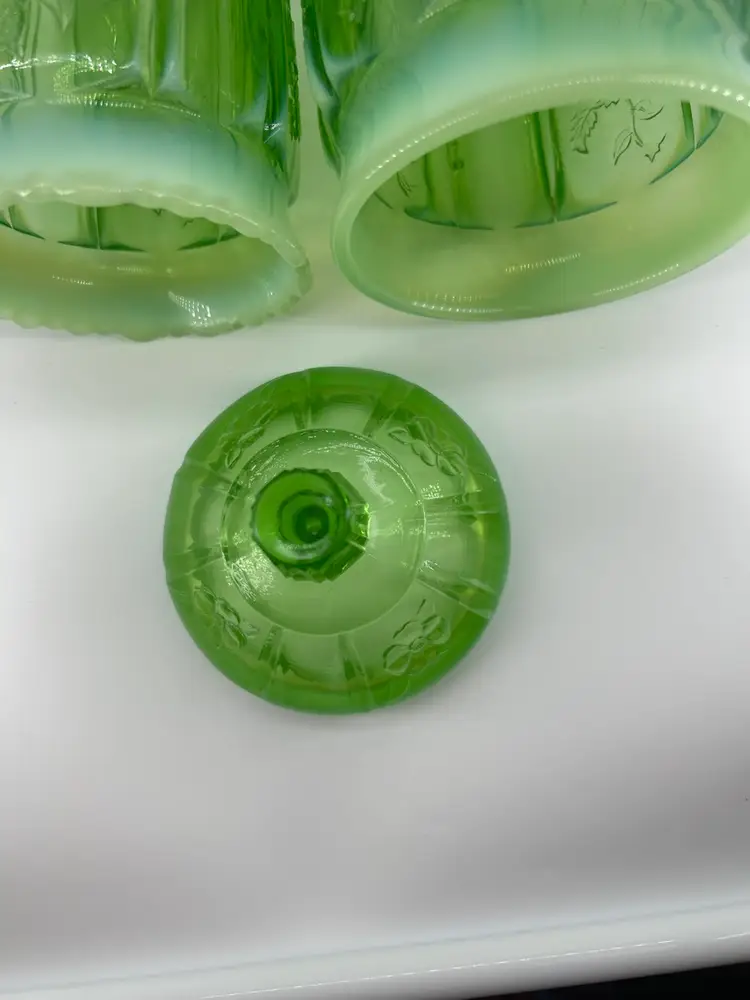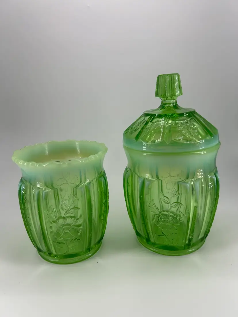 This is a pair of Jefferson Glass dishes in the Dolly Madison pattern. Made of thick green opalescent glass in the early 20th century. They are in fair condition considering their age. There are many flea bites along the ribs. No chips or cracks. The dishes themselves are 4.25 inches tall. With the lid on the lidded one is 7 inches tall.