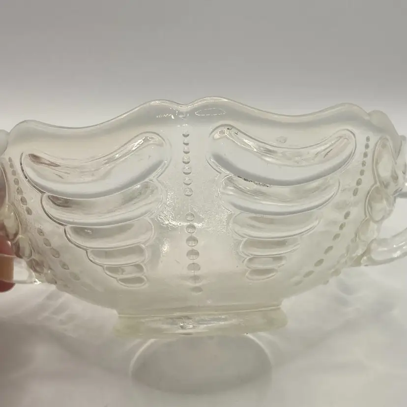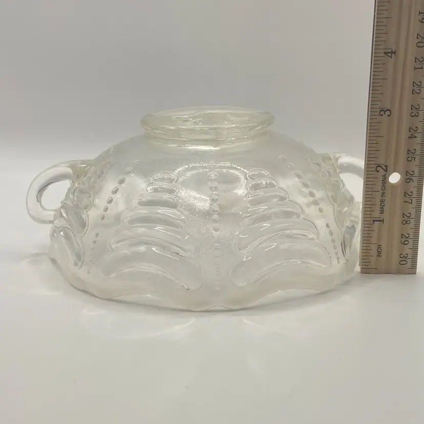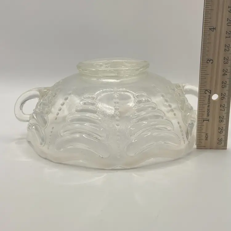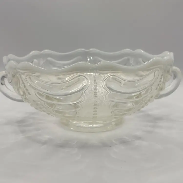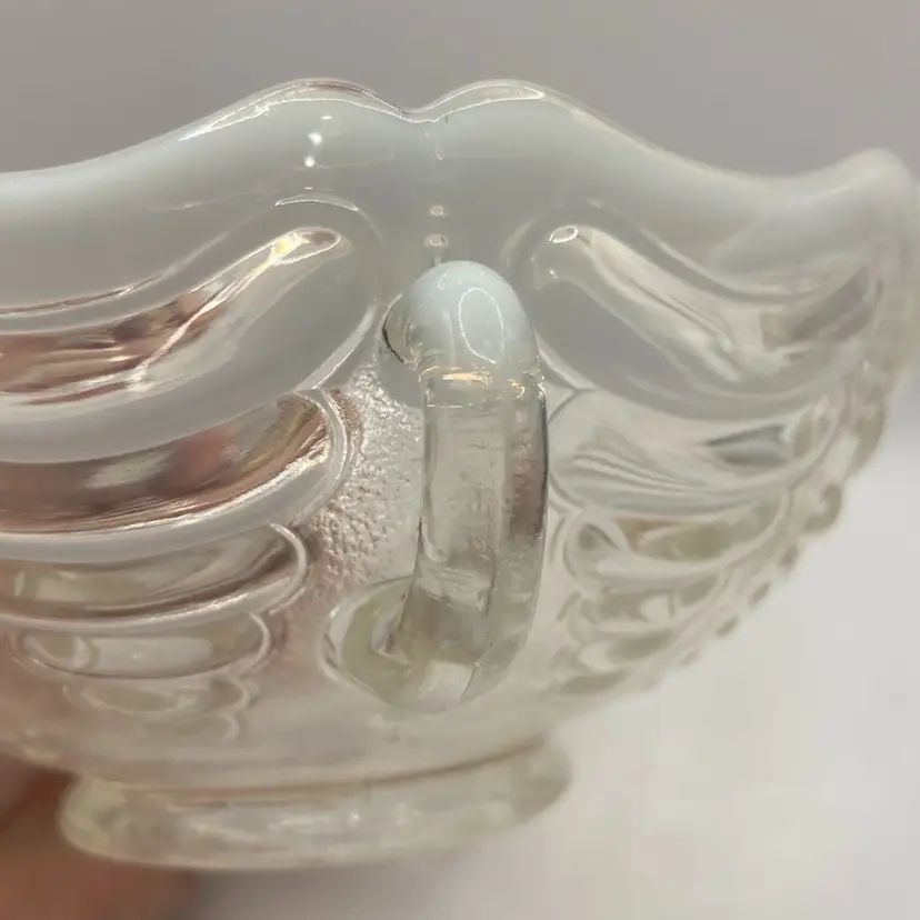 This bowl has a beautiful opalescence to it. Its double handles and abalone pattern makes it a nice piece for display. It has minor scratching in the bottom, as seen in last photo. No chips or breaks. Please see all photos for details.