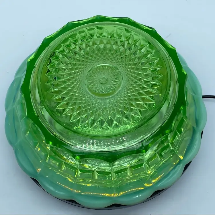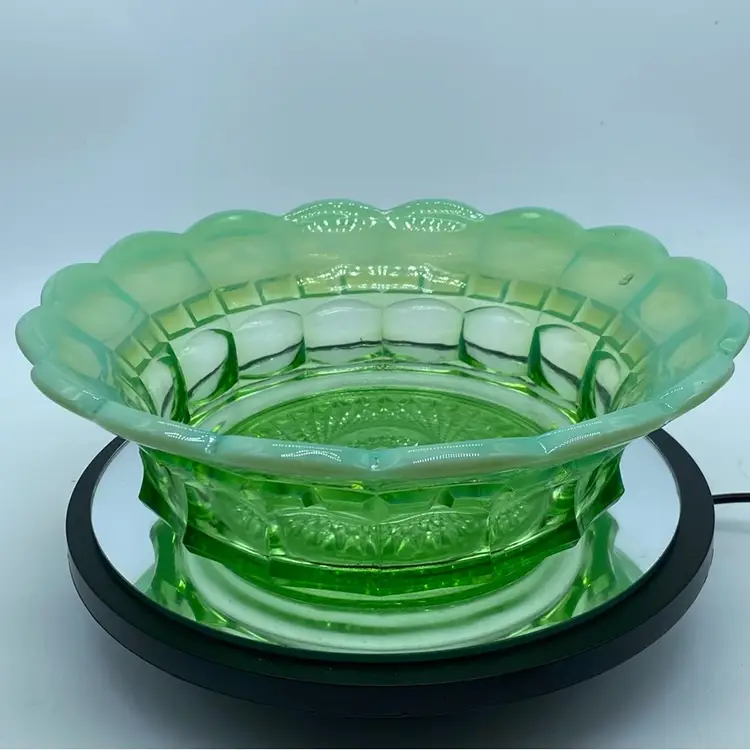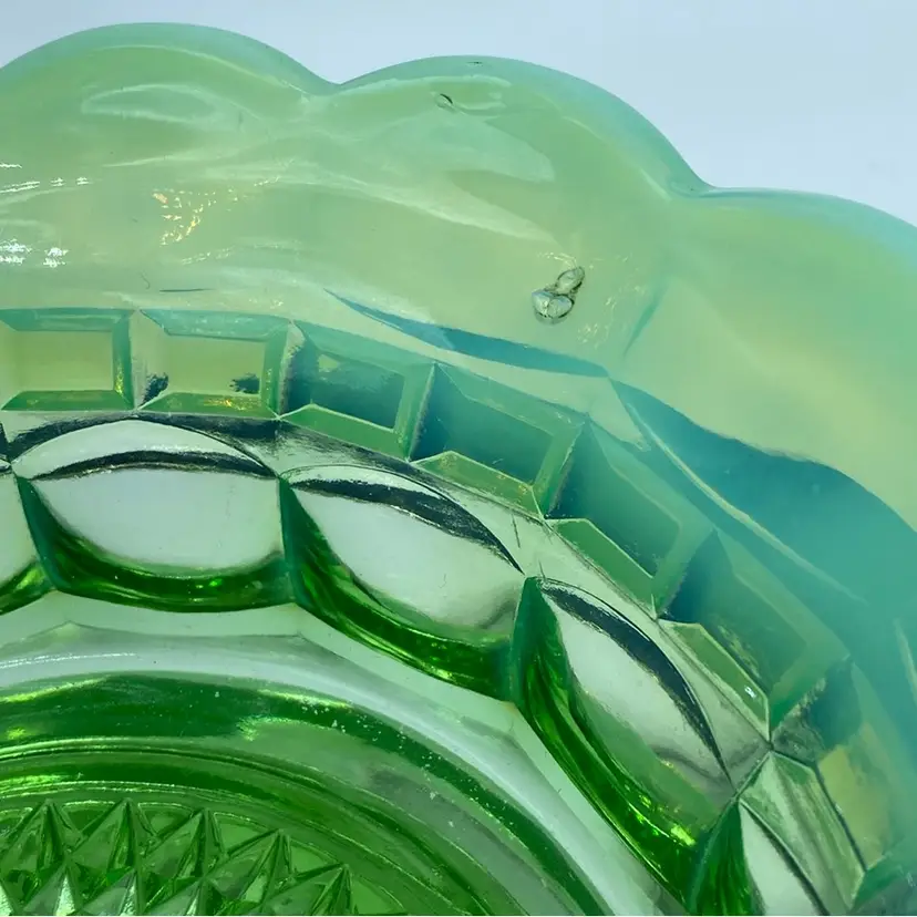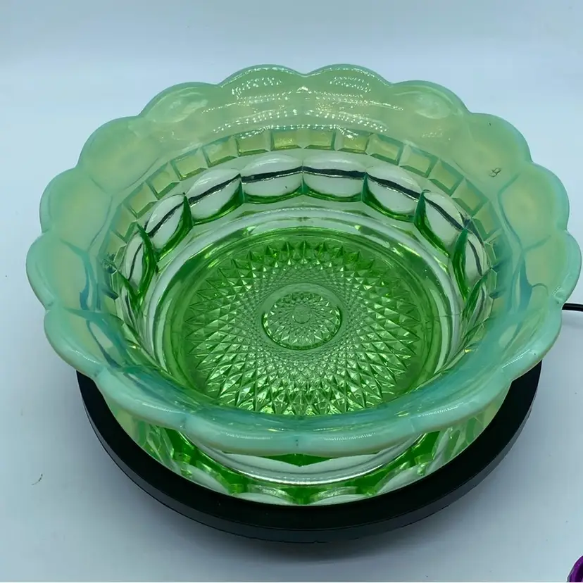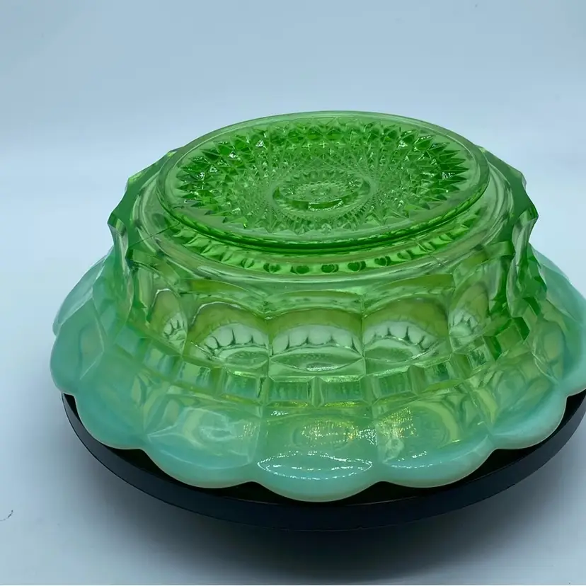 This type of glass was often used for decorative items such as bowls, dishes, and vases. The intricate pressed patterns and scalloped edges add to its appeal. Pieces like this bowl are sought after for their aesthetic qualities and historical significance, representing a unique period in glassmaking history.