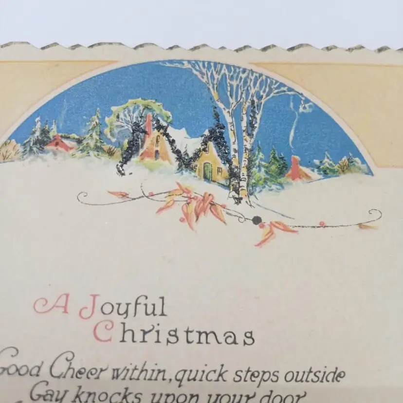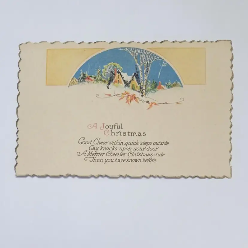 Capture the essence of vintage holiday spirit with our Antique Joyful Christmas in the Country Greetings Postcard. Featuring the charm of rural Christmas celebrations, this printed lithograph from the early 20th century is steeped in the nostalgia of the era with its divided back design, glitter accents, and scalloped edges that add a touch of whimsy. Crafted on standard-sized cardboard (5.5 x 3.5 in), this original piece hails from the United States and remains unposted. It's a single unit offering that has not been signed, conveying a pure and unadulterated message of 'A Merrier Cheerier Christmas-tide' that is perfect for collectors or as a festive greeting.