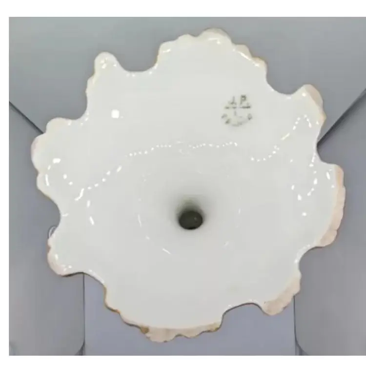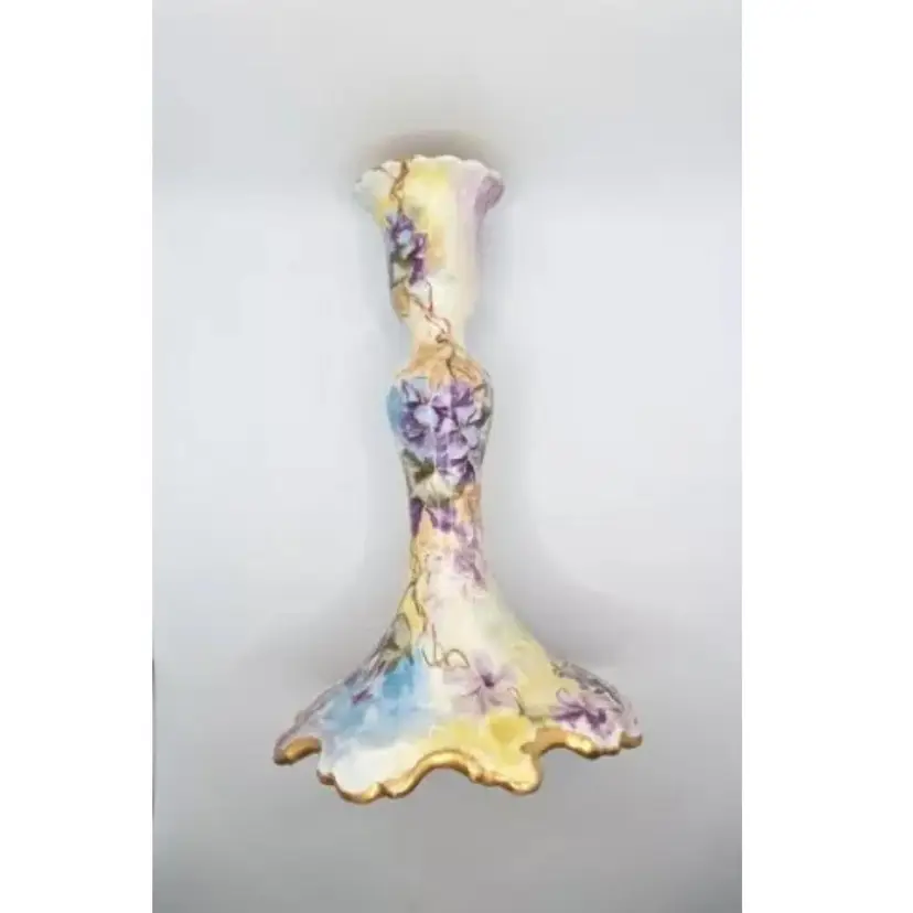 Here, we have an extraordinary piece of mid-19th century hand crafted French porcelain by Jean pouyat, Limoges France. Superior artistry design and technique. This piece has an abstract organic shaped cut-out base, stunning hand painted 6 colorway in purples, blue, greens, and yellow and white. Rich heavy gold leaf interior and edge detail. Light moriage texture throughout the piece, delicate ribbed detail under the top scalloped edge. Smooth satin glazed finish. Flawless condition, this piece has no detectable paint loss to the body, very slight wear to the gold leaf rim, JPL France stamp present on the bottom in green. The buyer will be thrilled! Stands 6.5" tall, approximate base diameter is 4.5". Artisan Jean Pouyat 1842-1849.