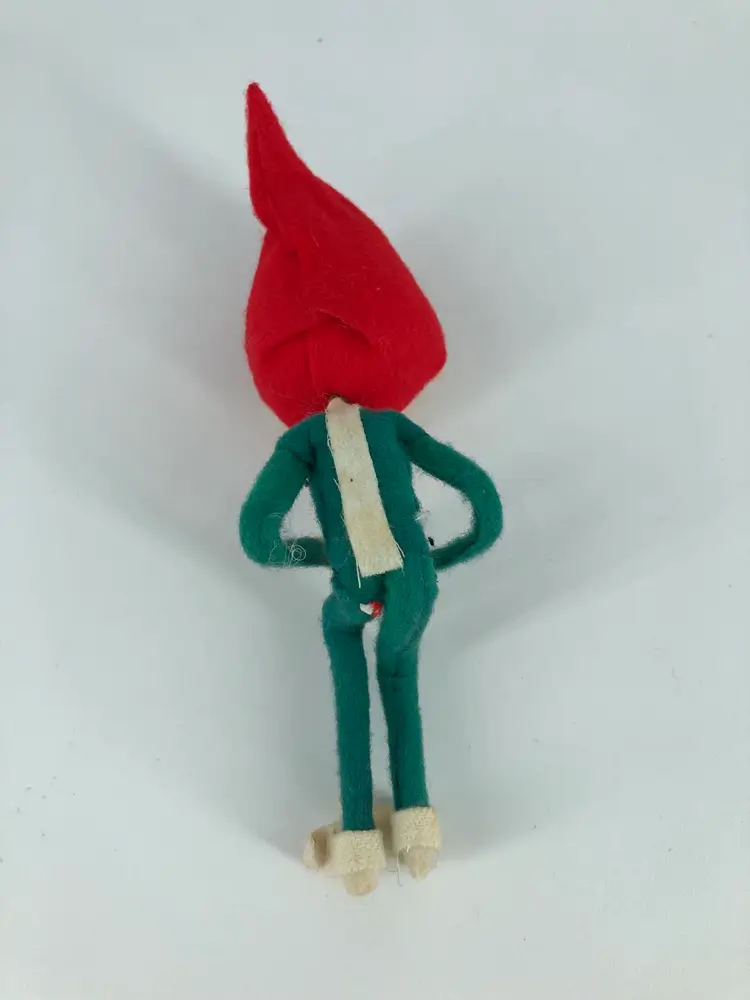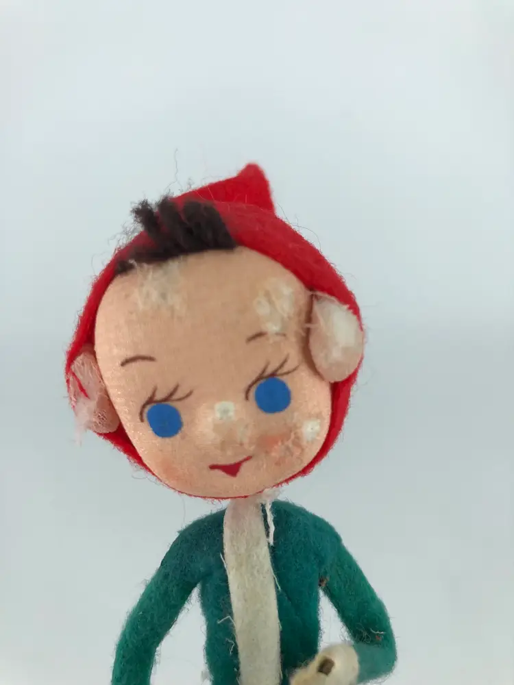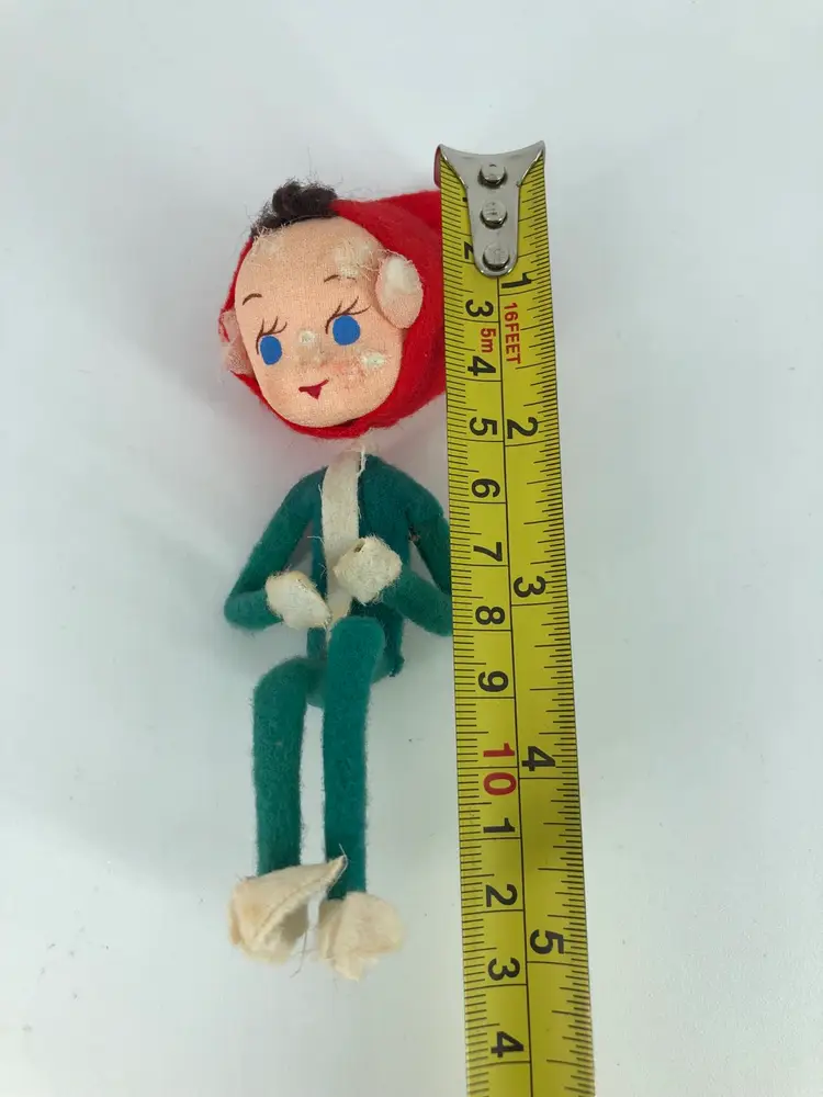 Very old and has some rips and tears Really cute Posable Great for Christmas, elf collectors, and so many more The way it is positioned in the photos it is about 5 inches in height but can be stretched and shorted