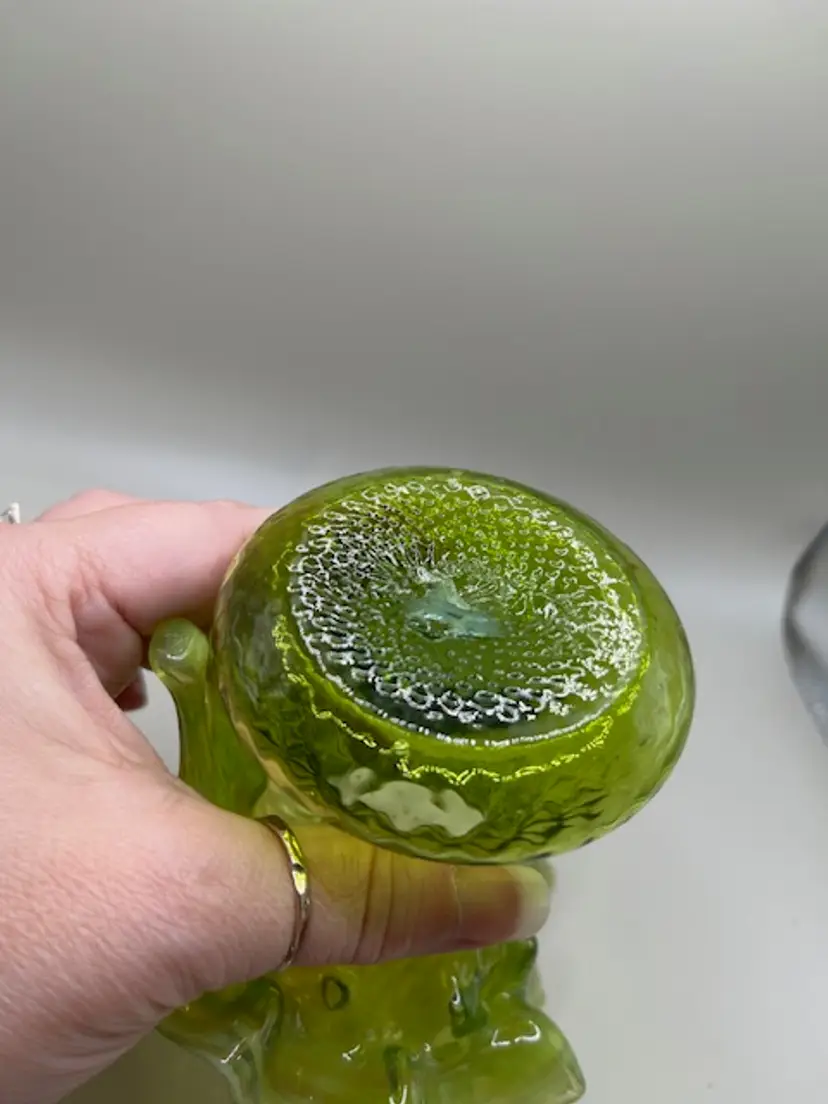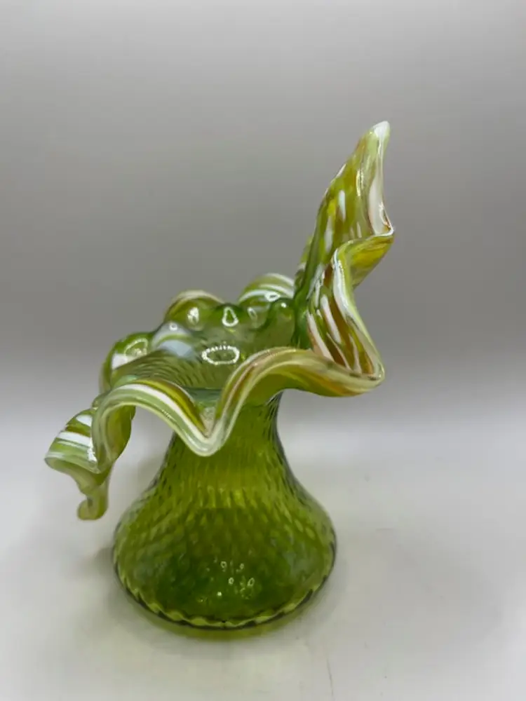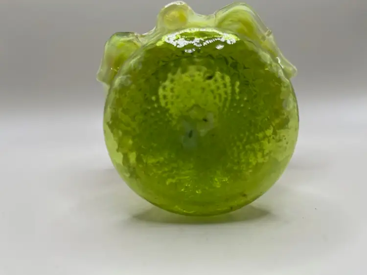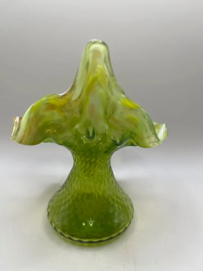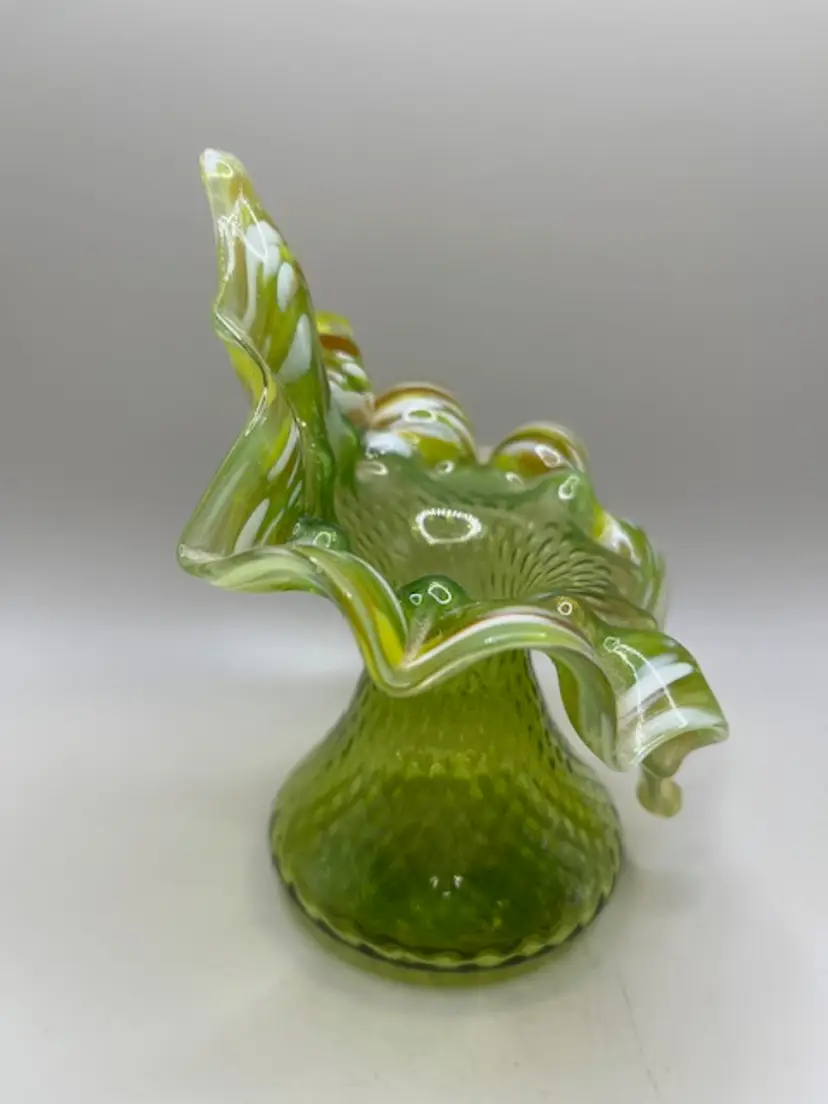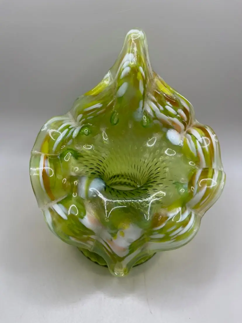 This piece is antique, likely dating to the late 19th or early 20th century. It is handblown art glass, featuring vibrant green, yellow, pinkish orange and white spatter coloration. It is Bohemian Czech glass, a style produced by makers such as Kralik. No chips or cracks. Measures 5 inches tall, 4 inches at the widest.