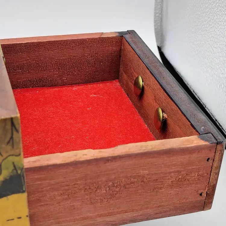 This piece is in wonderful condition for its age. It is without damage, all hardware in place and functioning. The red felt lining is intact and without rips or tears. Piece is just a bit dusty inside.