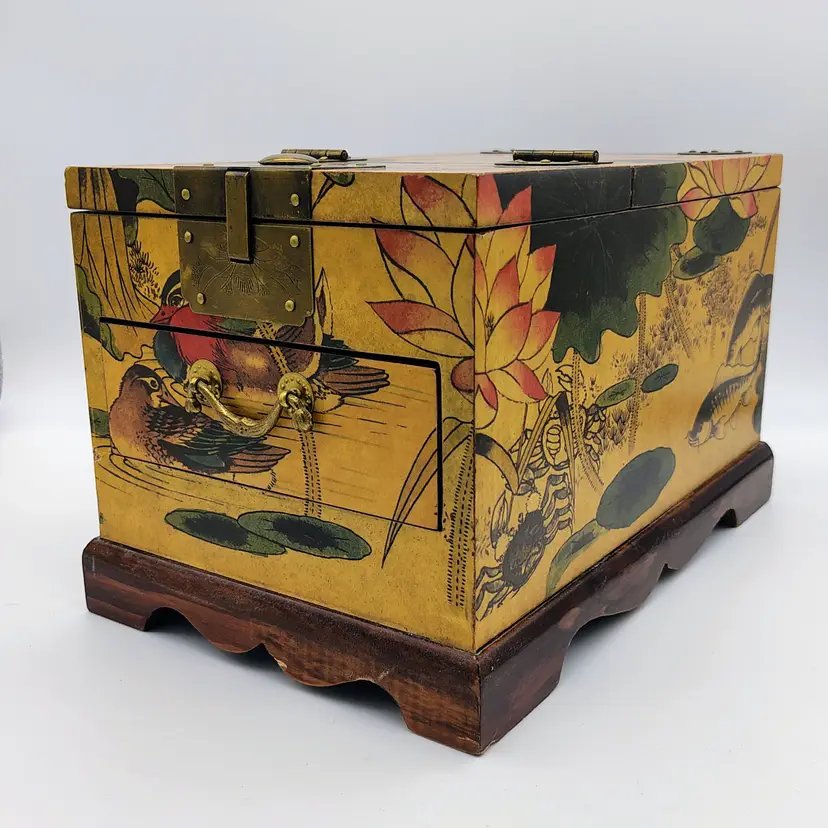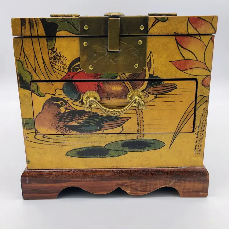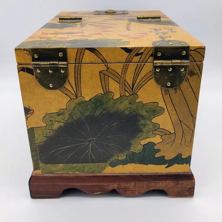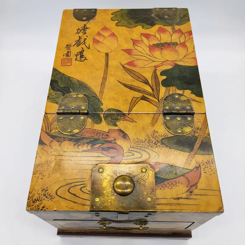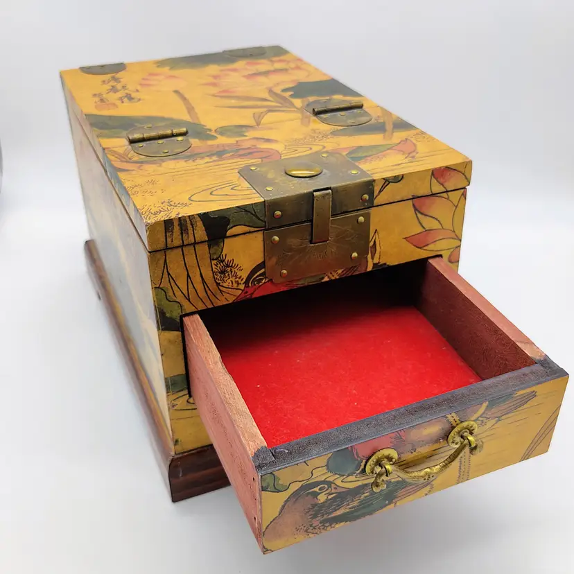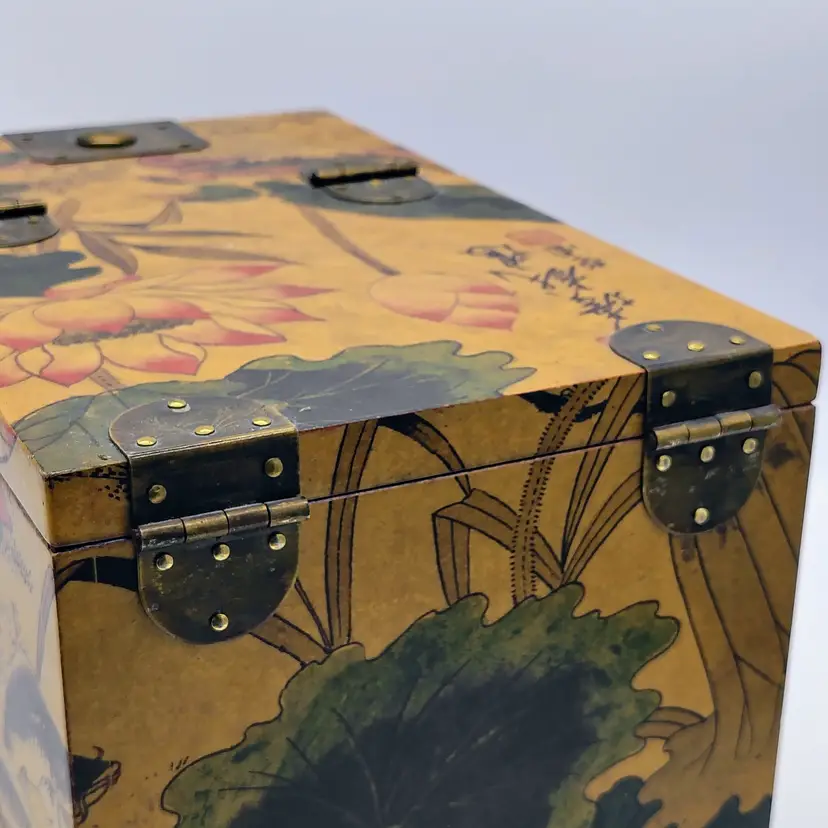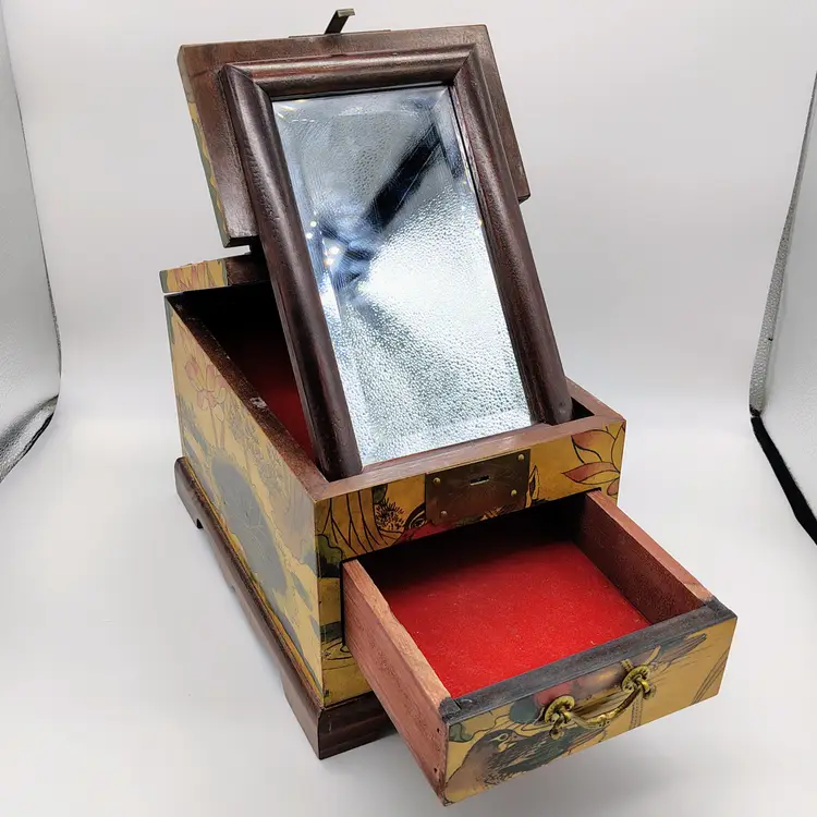 This Antique Lacquered Travel Jewelry/Dressing Box features intricate Oriental motifs, showcasing a blend of Chinese and Japanese craftsmanship from the early 20th century. Made of wood with a multi-color finish, this original antique piece reflects the artistry and cultural influences of the era. Perfect for storing jewelry or other treasures, this unique box offers a glimpse into the rich history and aesthetics of Asia during the early 1900s. Ideal for collectors of Asian antiques or those looking to add a touch of vintage glamour to their space.