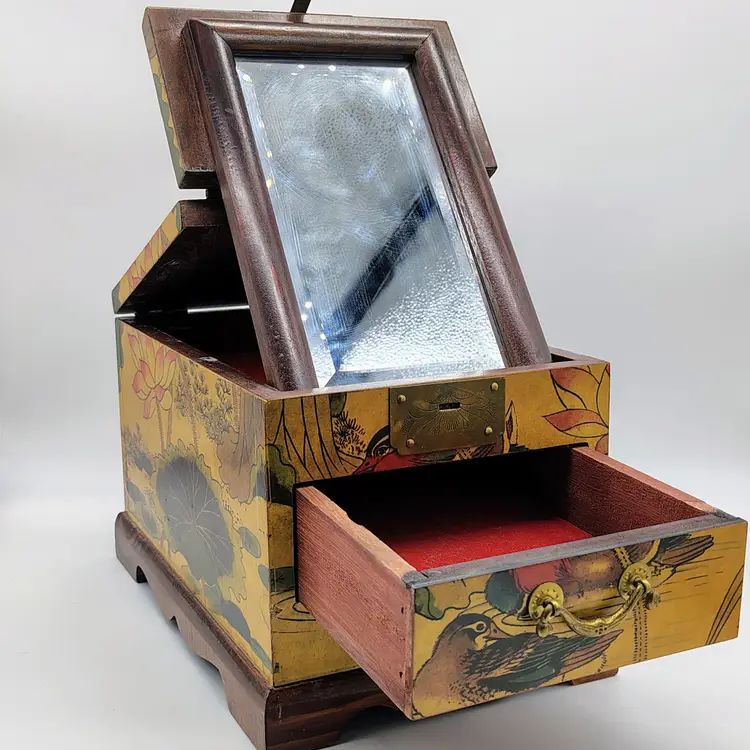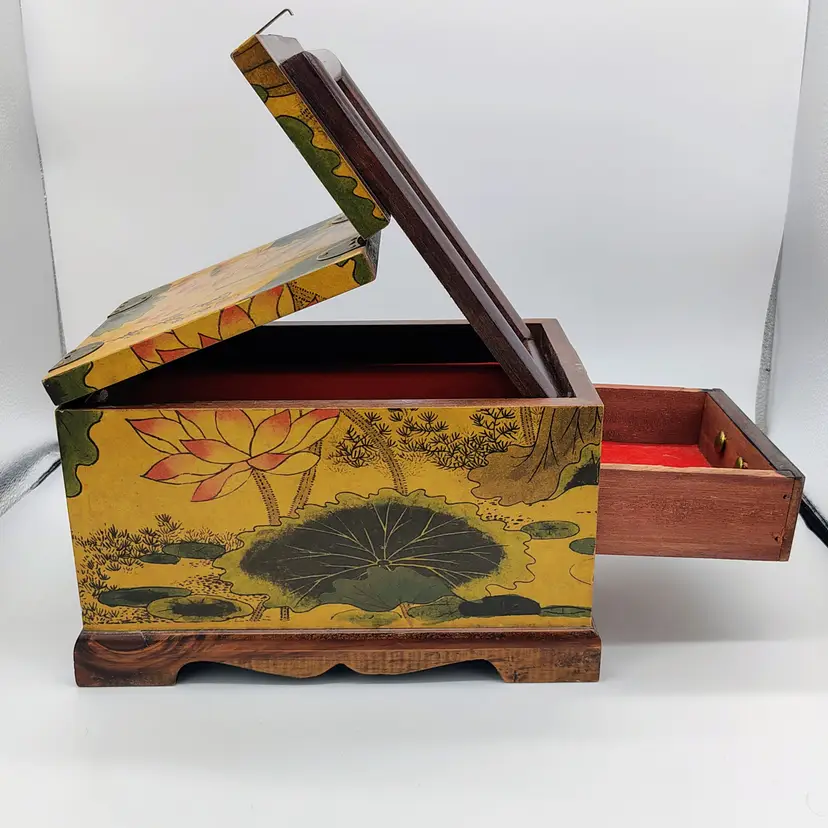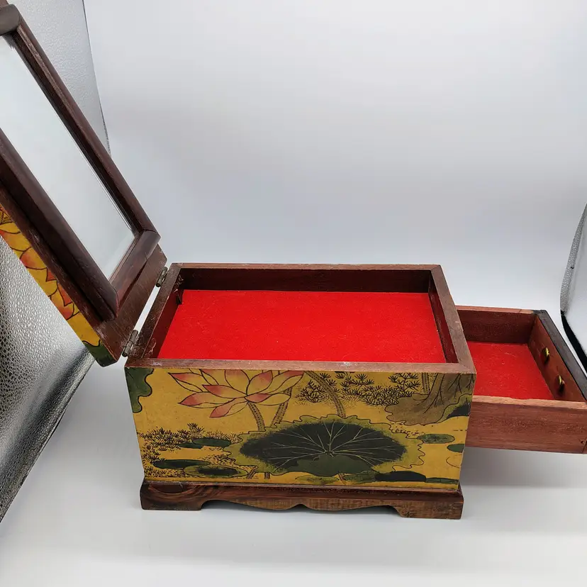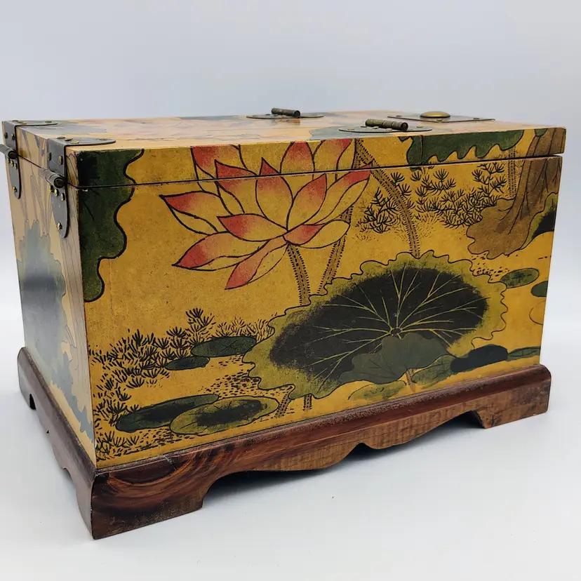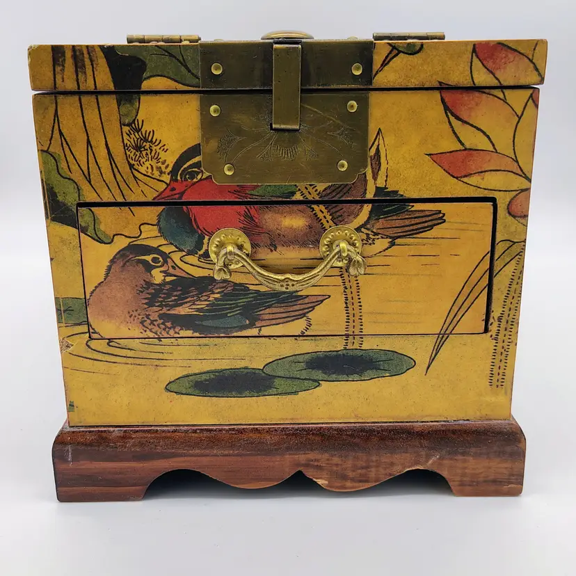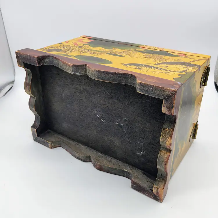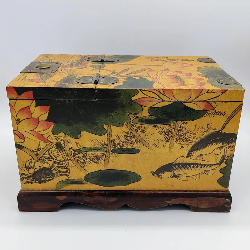 This Antique Lacquered Travel Jewelry/Dressing Box features intricate Oriental motifs, showcasing a blend of Chinese and Japanese craftsmanship from the early 20th century. Made of wood with a multi-color finish, this original antique piece reflects the artistry and cultural influences of the era. Perfect for storing jewelry or other treasures, this unique box offers a glimpse into the rich history and aesthetics of Asia during the early 1900s. Ideal for collectors of Asian antiques or those looking to add a touch of vintage glamour to their space.
