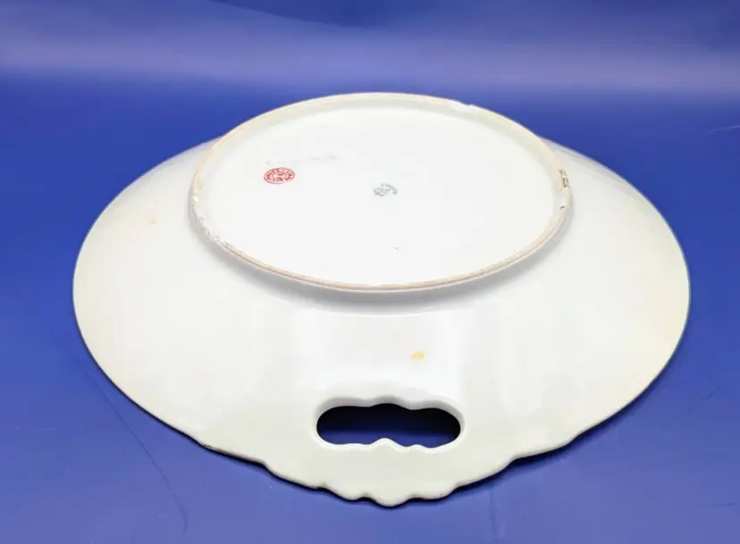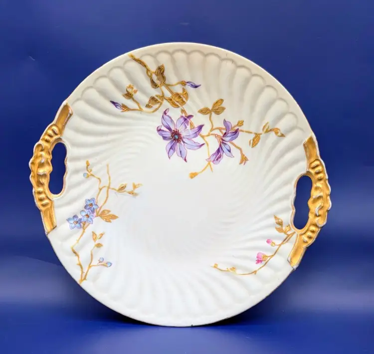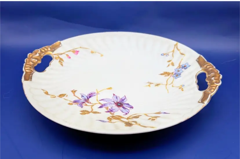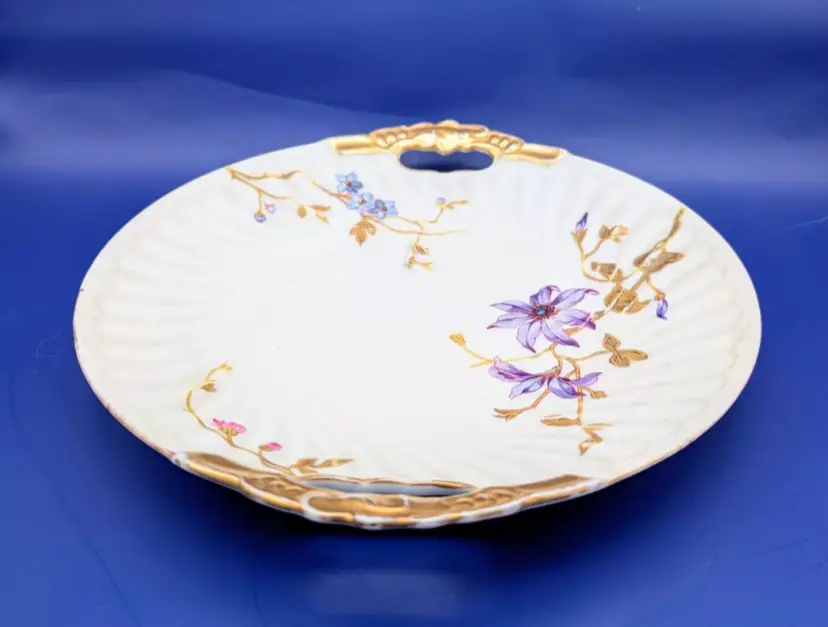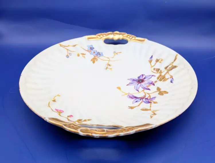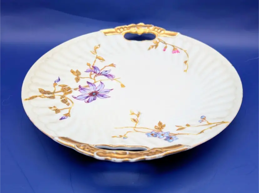 Beautiful hand painted 10 inch serving tray with gold gilting. This tray is a rare Lanternier for Limoges, which was made from 1891-1914. There is some chipping at the base of the plate, but nothing is visible. Shows some wear due to age.