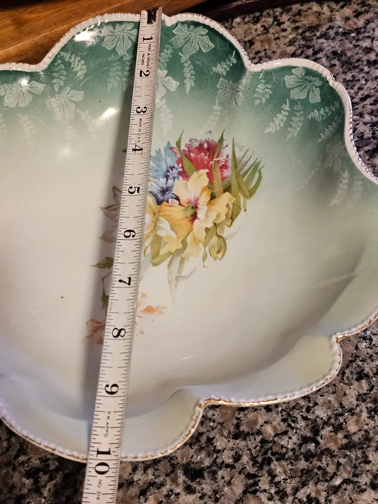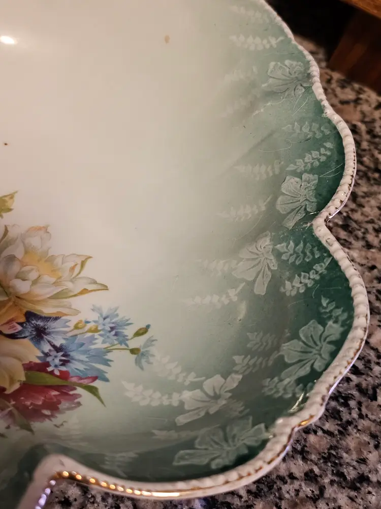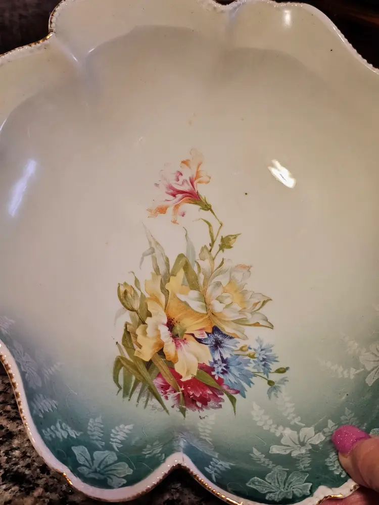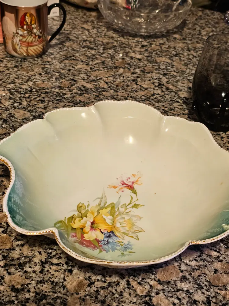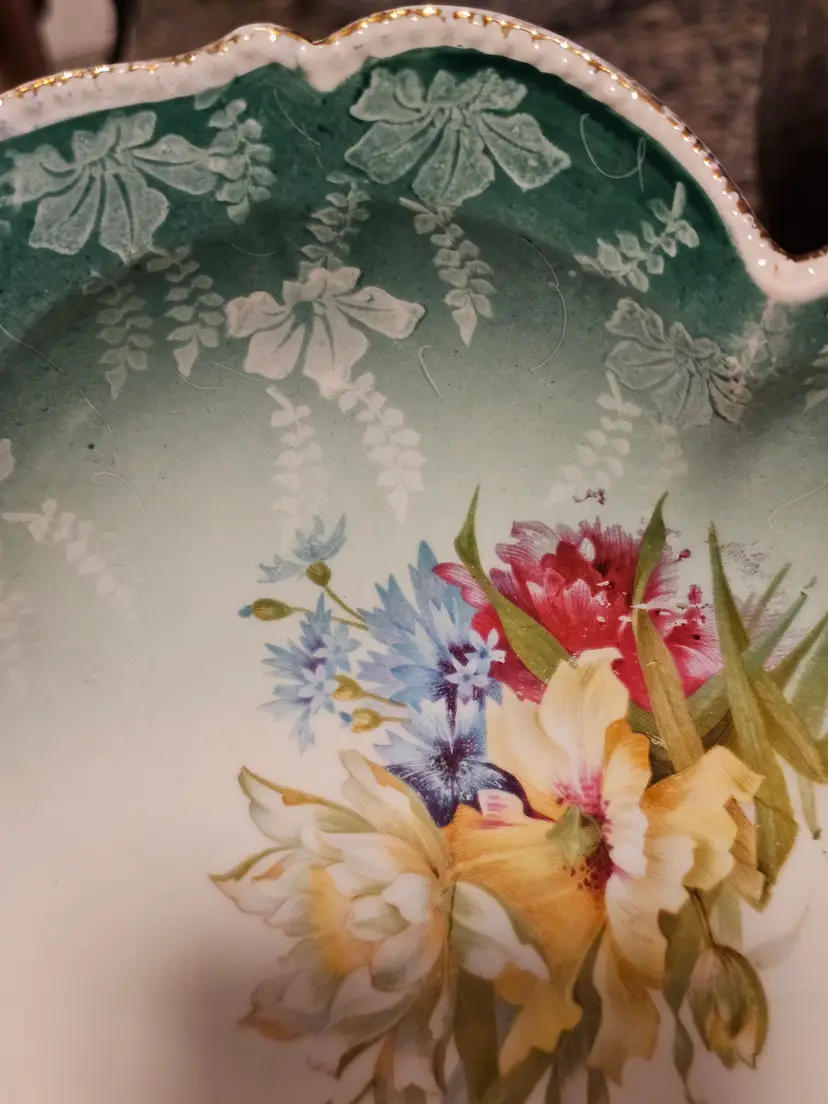 Gorgeous bowl with raised dotted gold trimmed edges. Classic aqua base color with beautiful florals! Perfect condition. No chips or cracks. Looks like the remnants of a mark on the side but I can't make it out. 10 inches across and 2.5 in deep.
