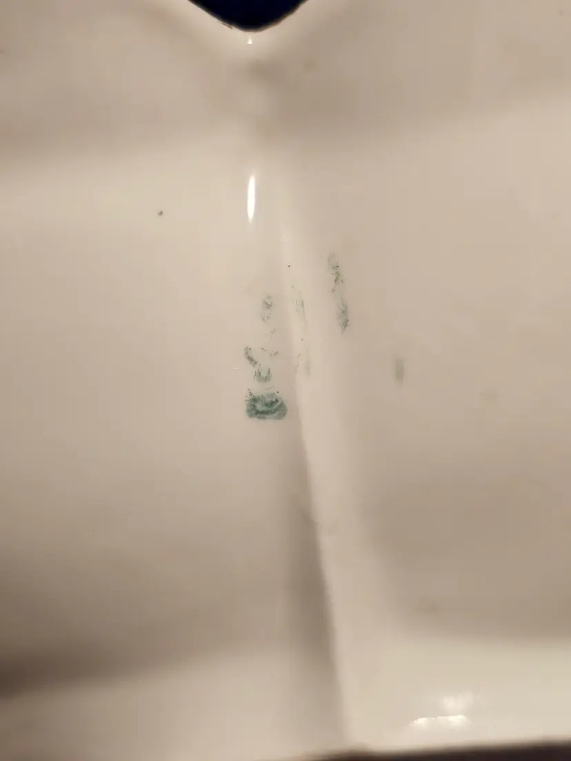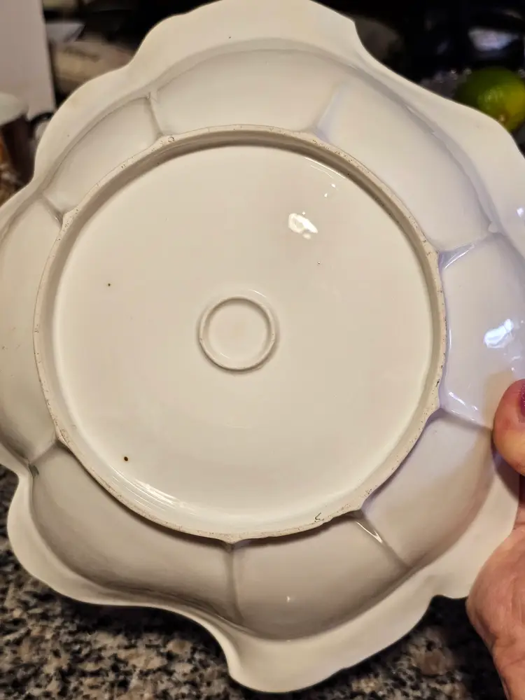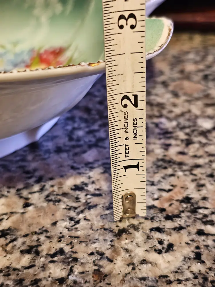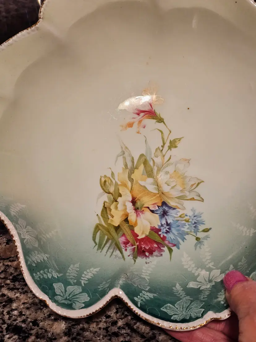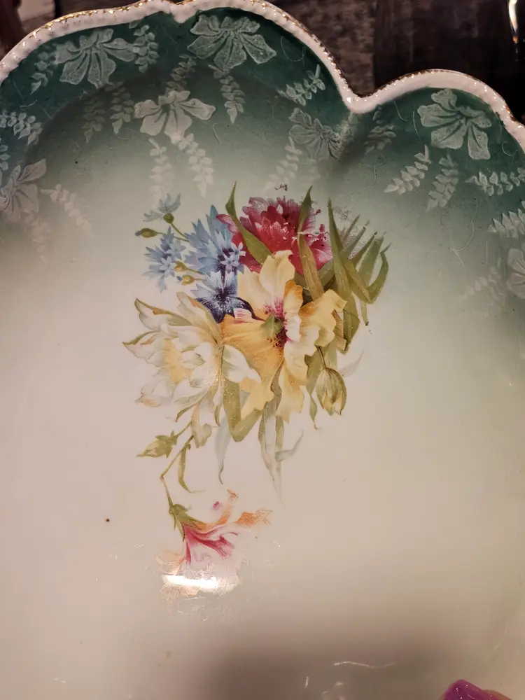 Gorgeous bowl with raised dotted gold trimmed edges. Classic aqua base color with beautiful florals! Perfect condition. No chips or cracks. Looks like the remnants of a mark on the side but I can't make it out. 10 inches across and 2.5 in deep.