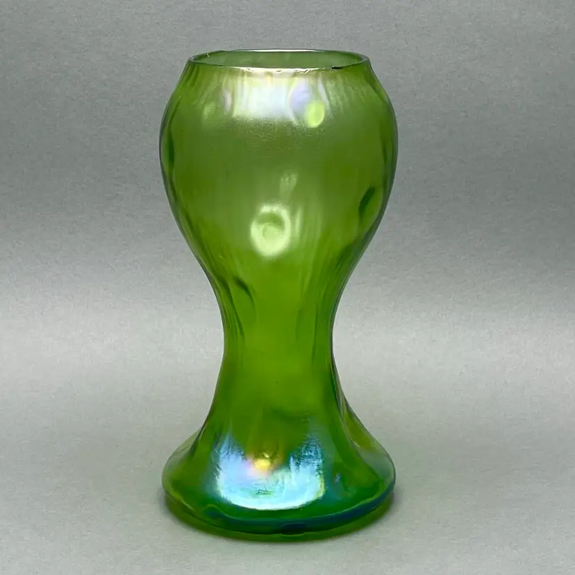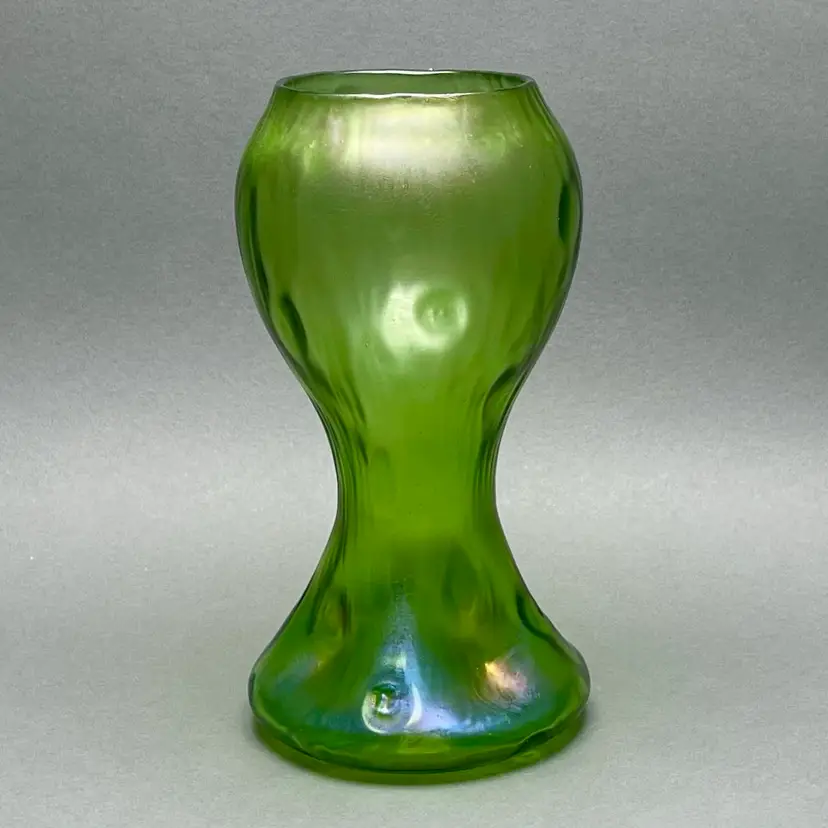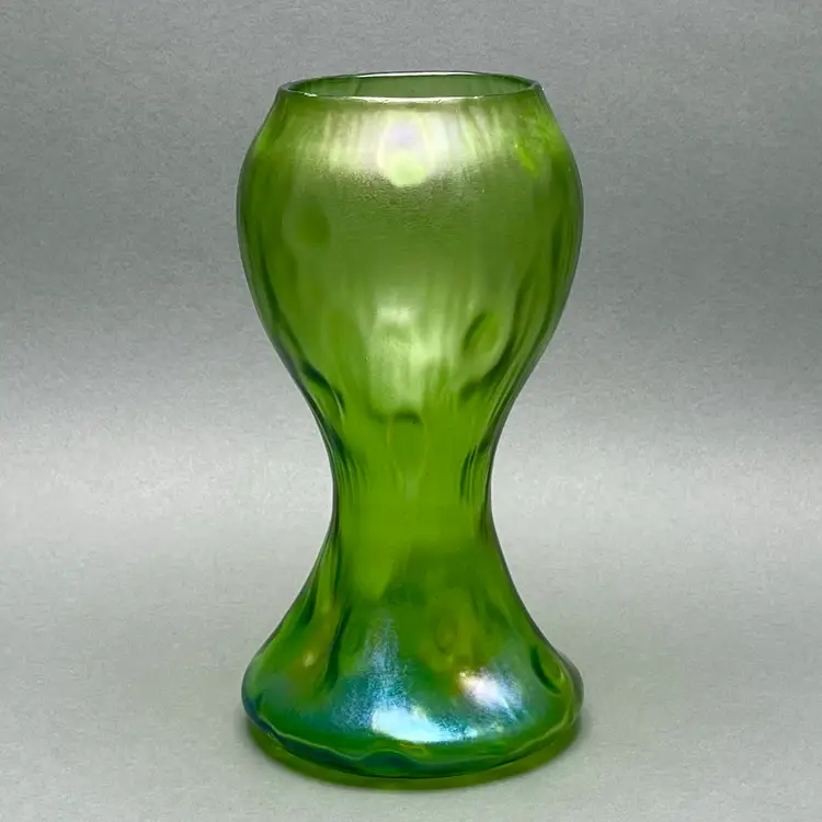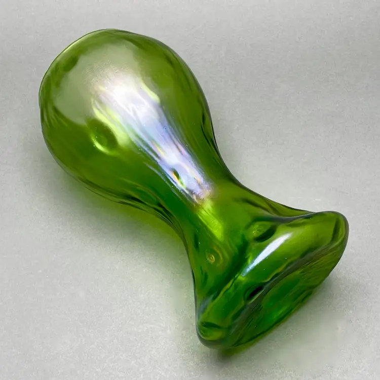 Antique Loetz Art Nouveau iridescent green art glass vase. Its unique shape and shimmering finish make it an eye-catching decorative piece.
