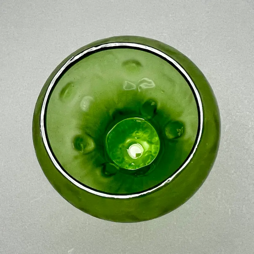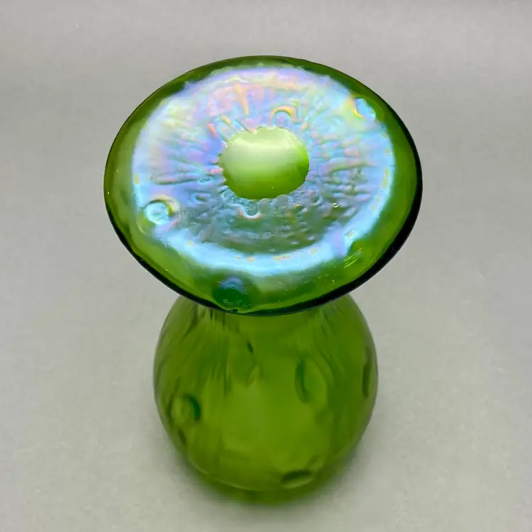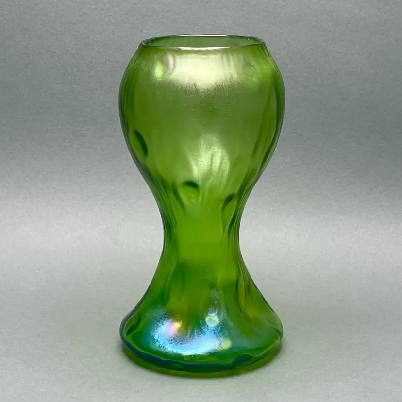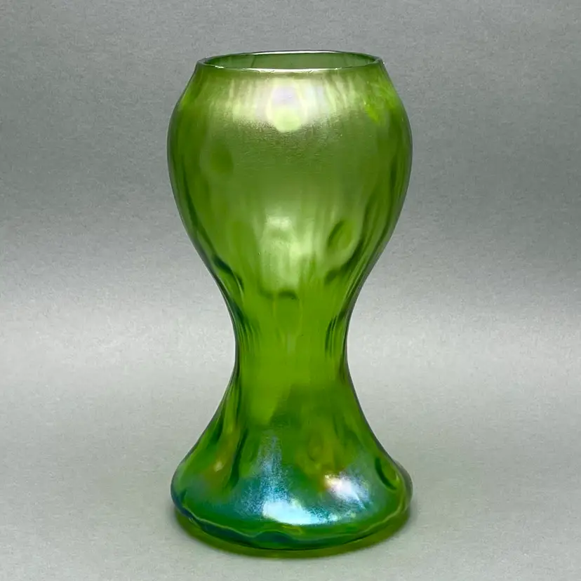 • Iridescent finish • Unique hourglass shape • Art Nouveau design • Statement art glass piece