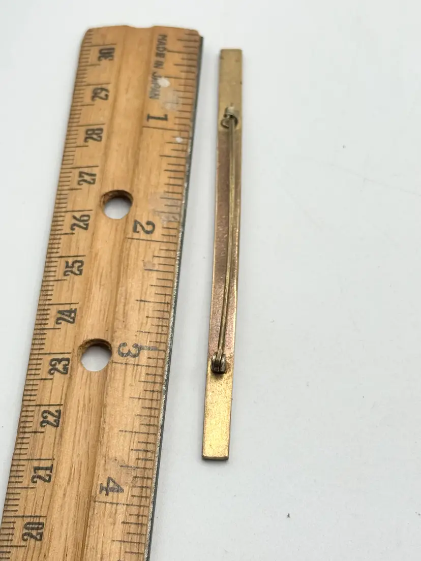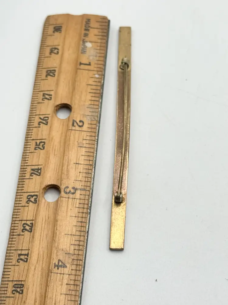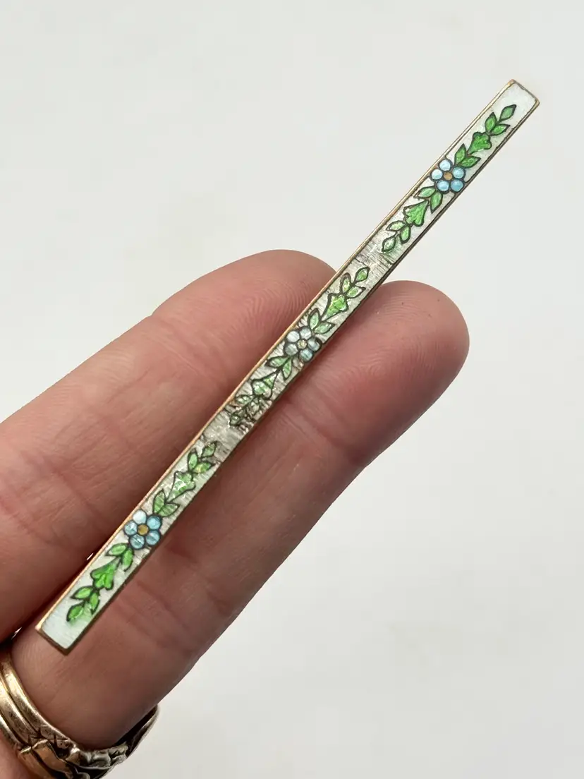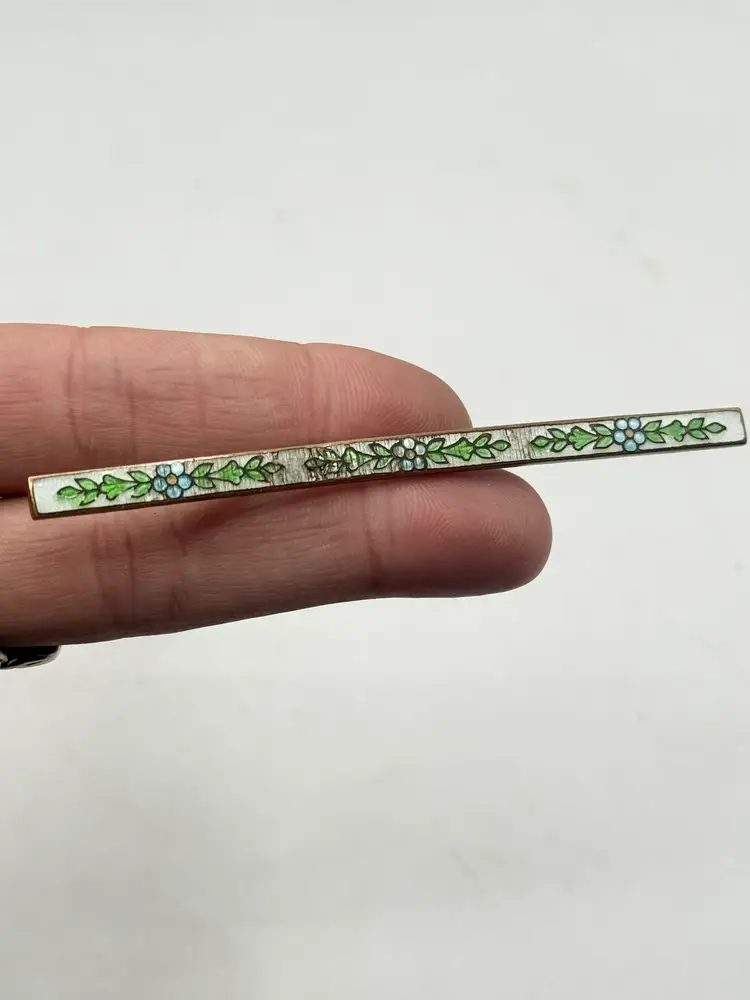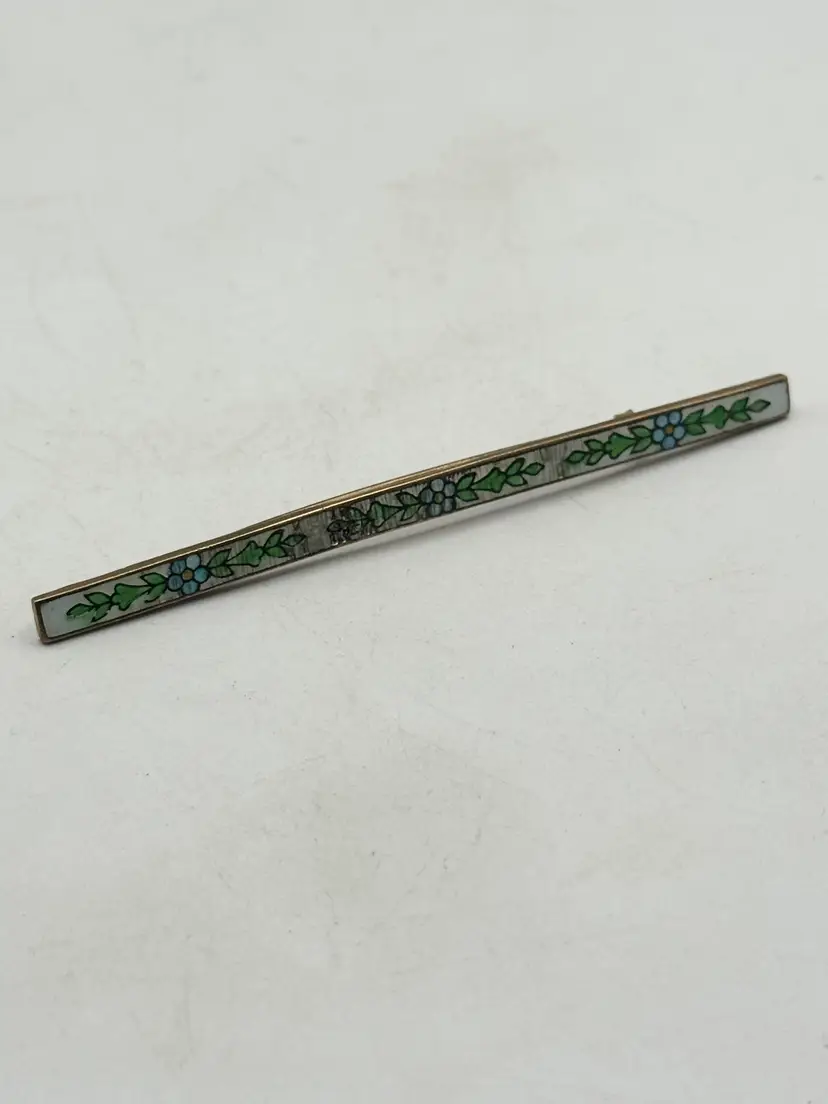 Antique long floral guilloche enamel bar pin. Antique estate bar pin with green leaves, white background with blue and yellow flowers. Floral design. Long bar pin. Guilloche enamel. Estate pin. MN54GH.
