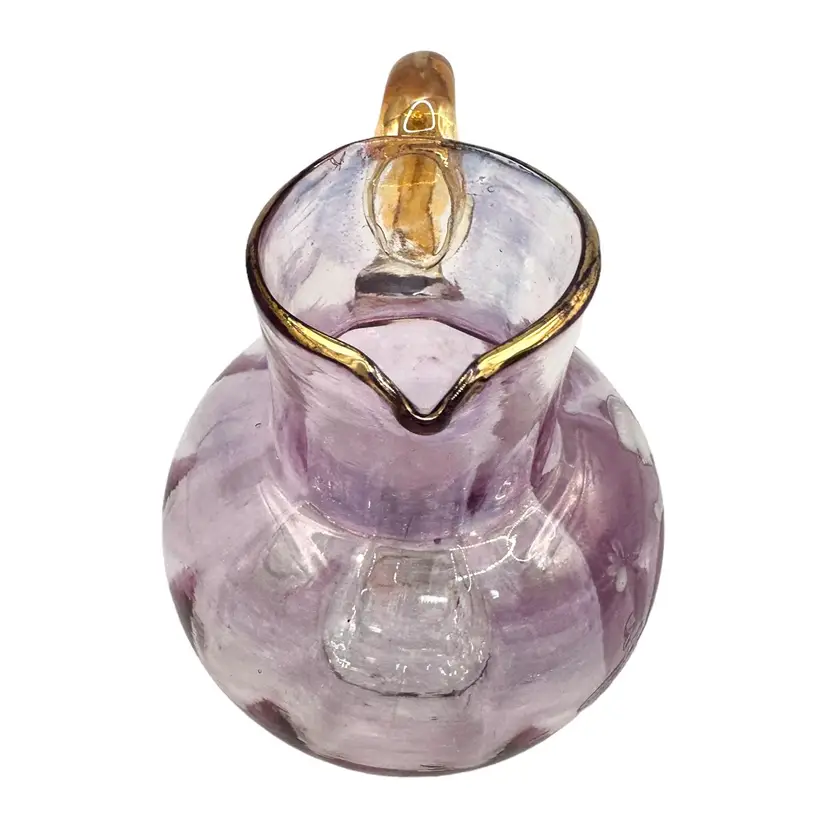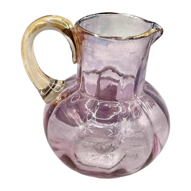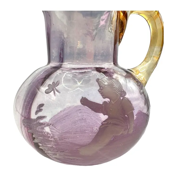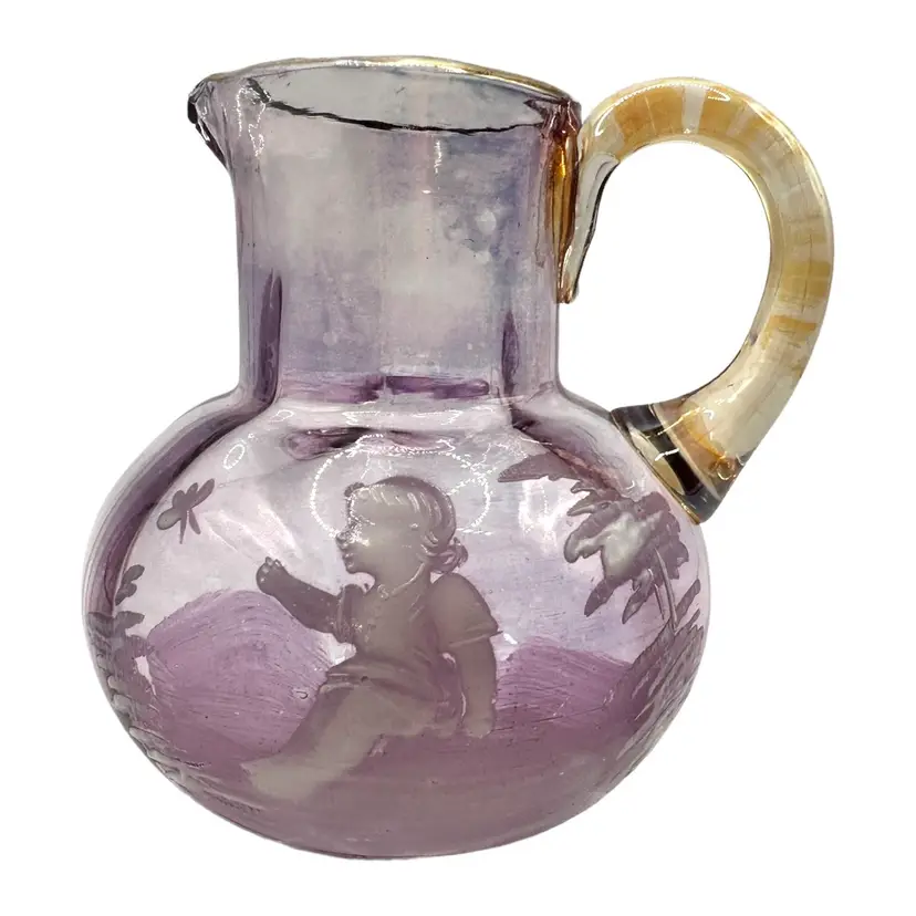 Antique Mary Gregory Small Cranberry Optic Pitcher Handblown Child Sitting Reaching for Butterfly Design Gold Gilt Rim