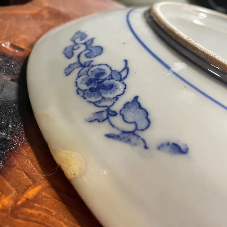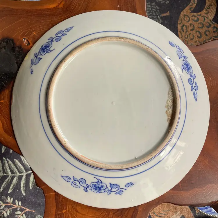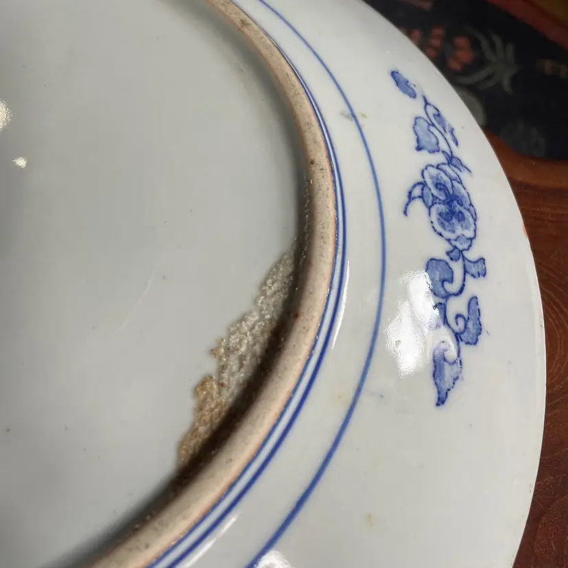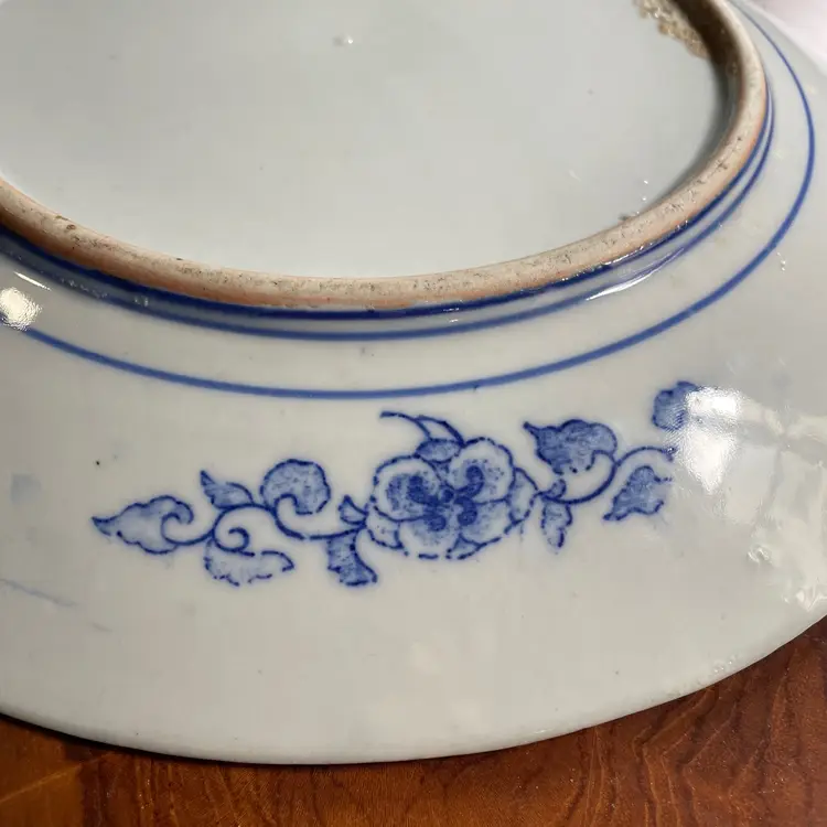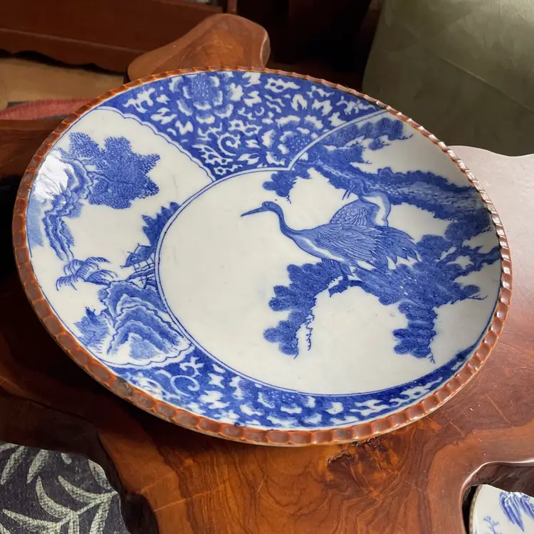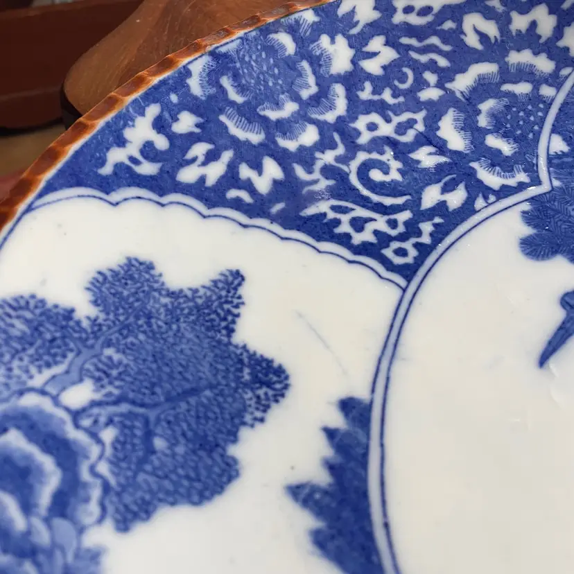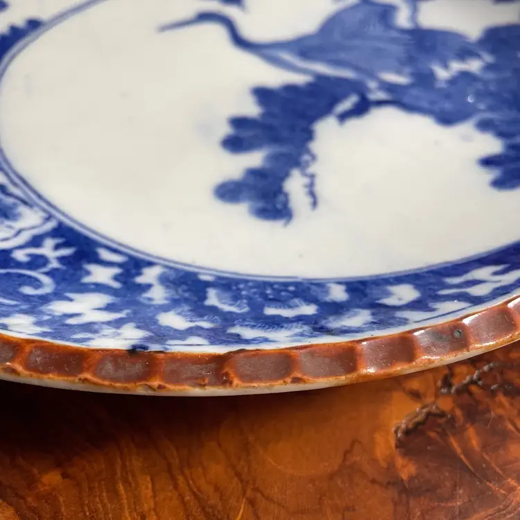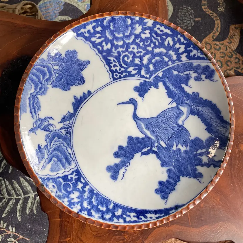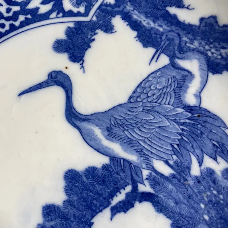 A stunning antique Japanese Igezara blue, white, and brown pie crust edged plate. Beautiful crane and pine tree design, symbolizing longevity and luck. The plate measures at 12 inches in diameter and is about 1.5 inches thick. It is in great condition but has signs of wear consistent with its age as an antique item, and imperfections consistent with handmade items during that era. Please look at photos carefully. For care, please wash gently, do not use the dishwasher.