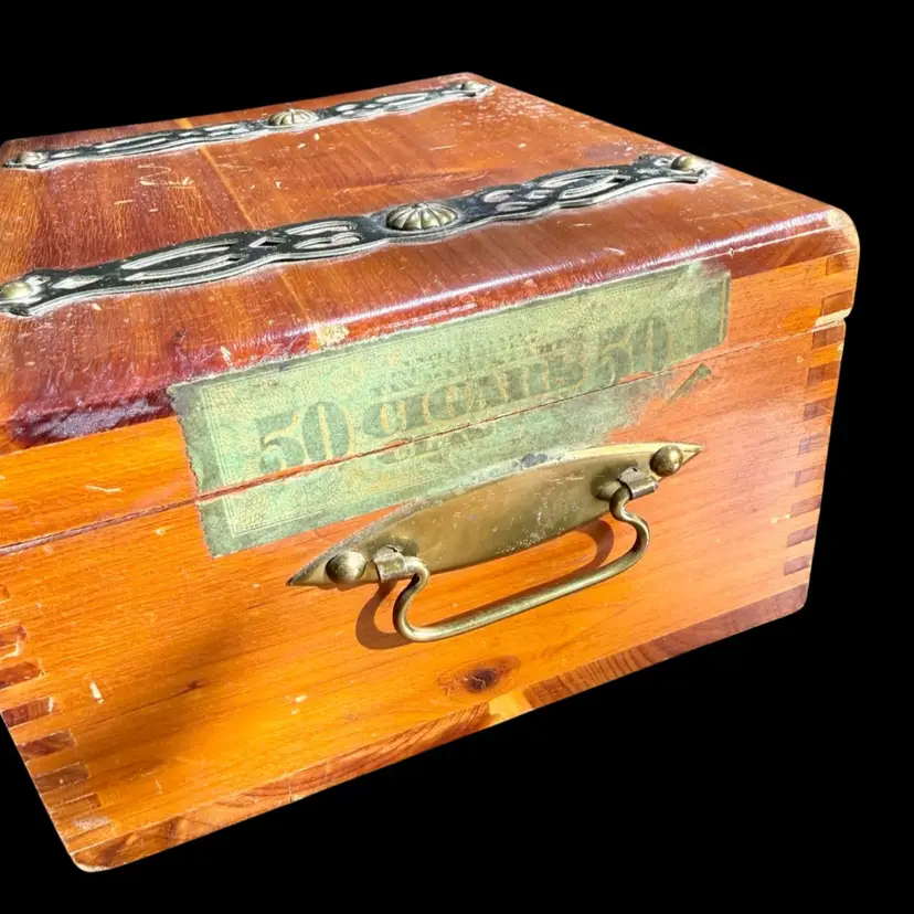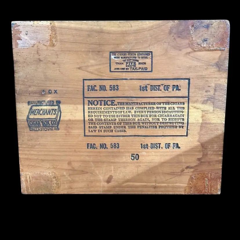 7.5"x3.75"x6.5". Authentic antique wooden cigar box manufactured by Merchants Cigar Box Co. of Dallastown, Pennsylvania, featuring original factory and federal tax stamps. This box dates to the early 20th century (circa 1906–1930) and was originally made to hold 50 cigars.