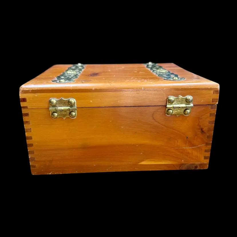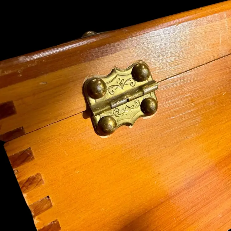 The box has been fitted with brass hardware, including a latch and side handles, likely added in the early to mid-20th century when the box was repurposed for storage or keepsakes — a common and desirable practice that adds both charm and functionality.