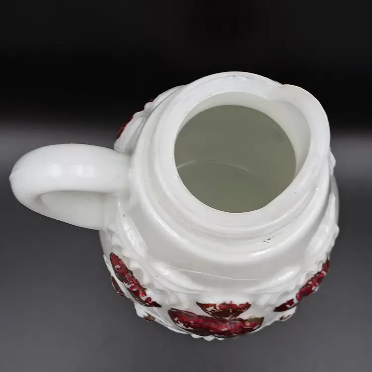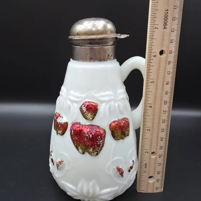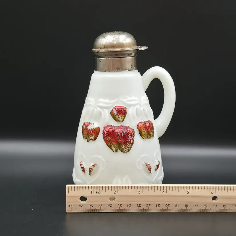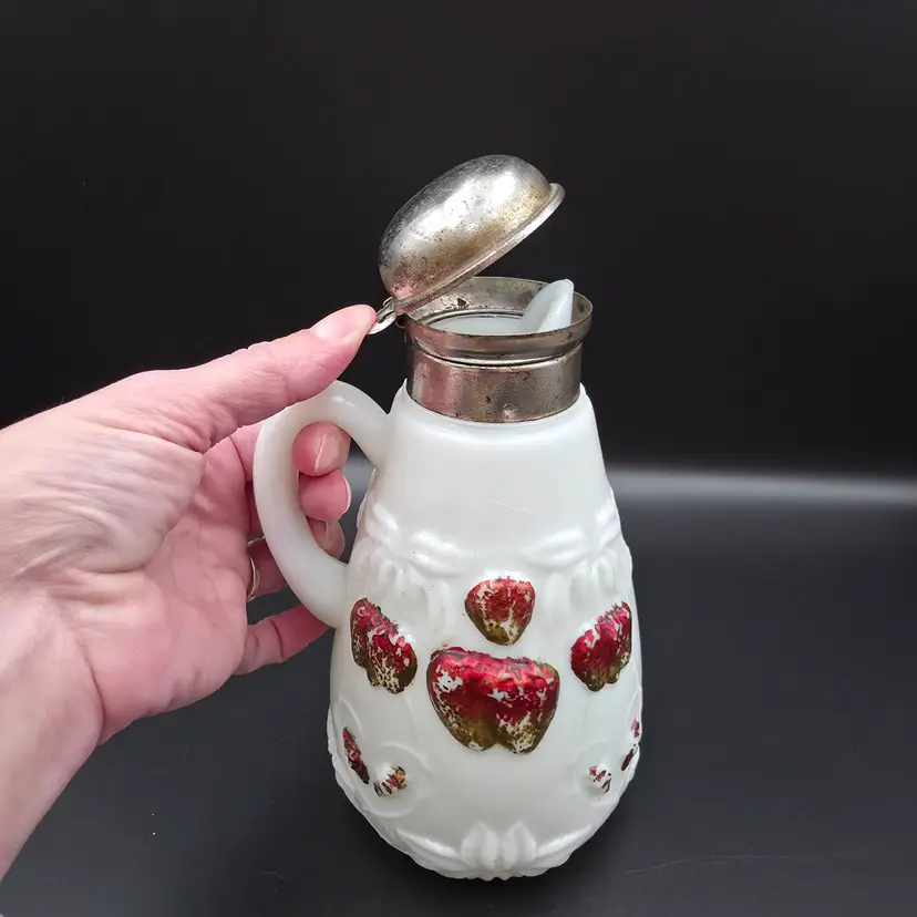 Item is in excellent condition given its age. No chips or cracks, some wear on paint and corrosion on lid. Lid springs are in good working condition. Measures 7.25 inches tall with lid, 4.5 inches wide with handle. Thank you for looking and have a great day!