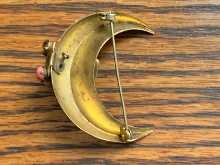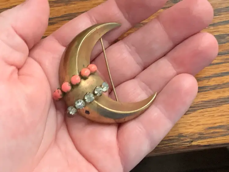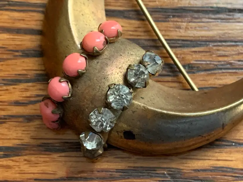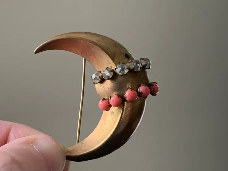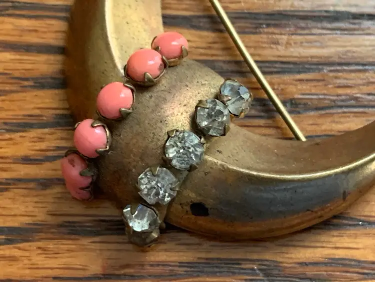 Antique moon brooch with clear rhinestones and faux coral in gold tone metal