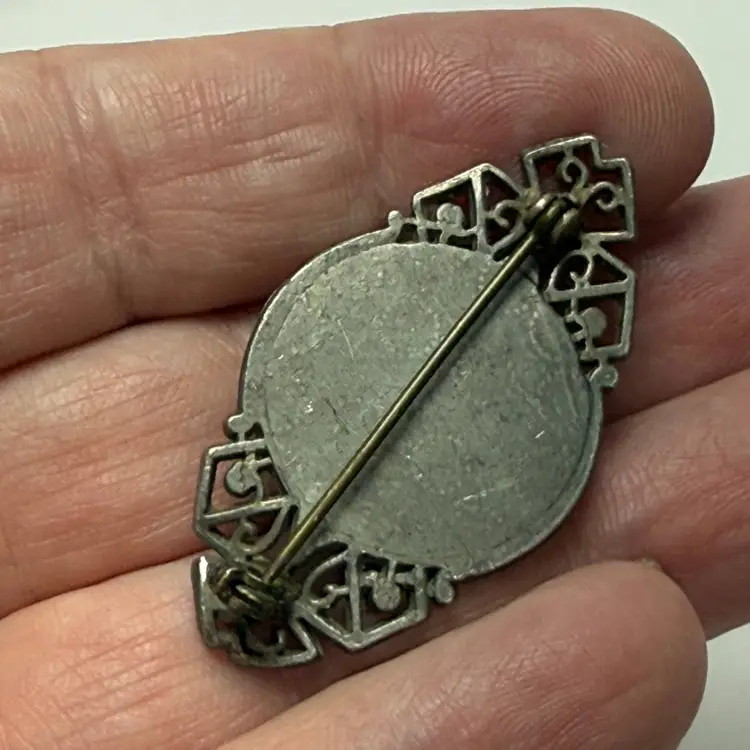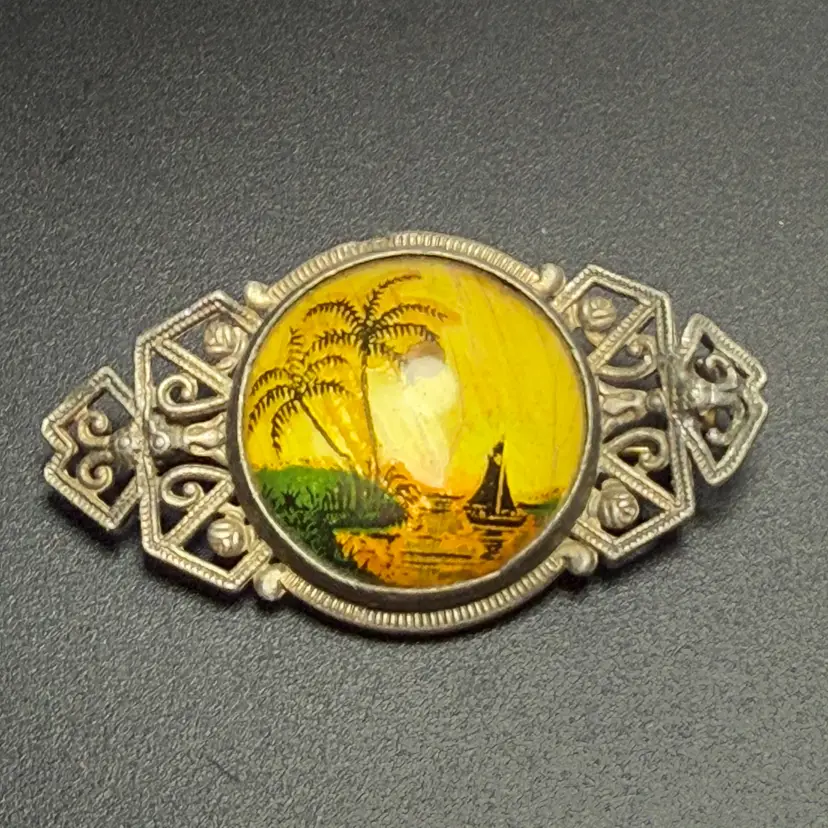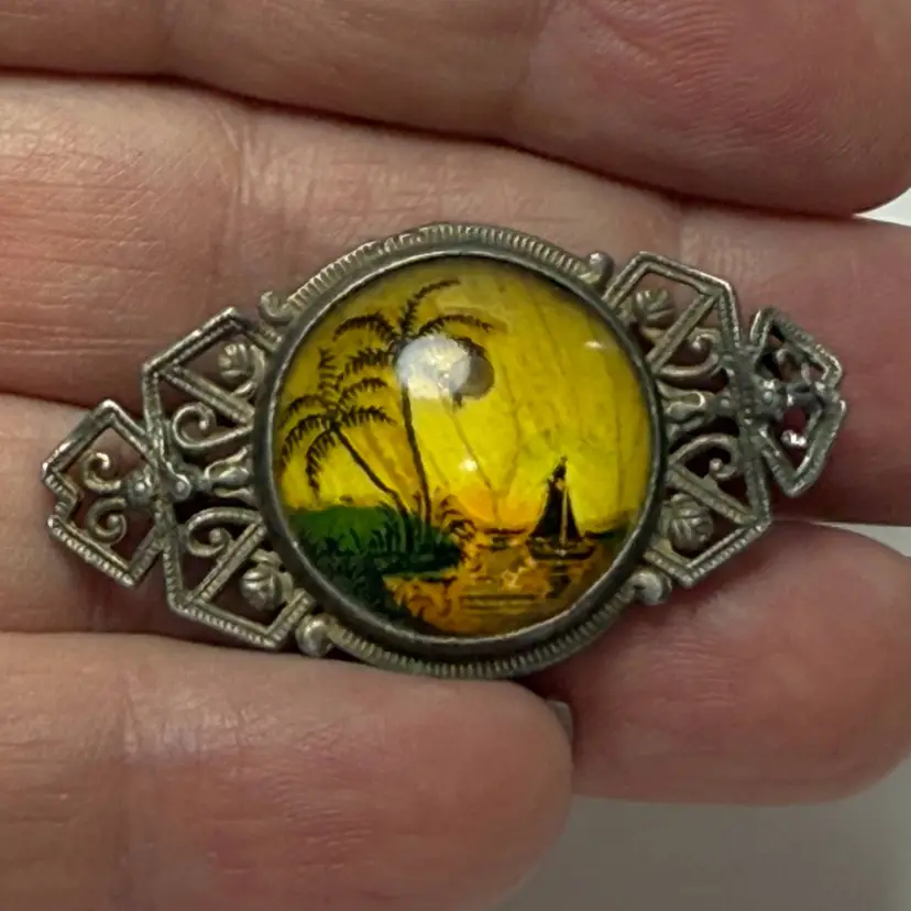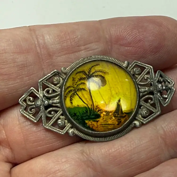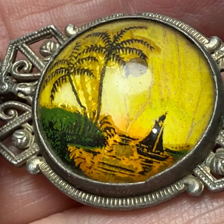 Antique Yellow Morpho Real Butterfly Wing Hand Reverse Painted Bubble Brooch Palm Tree Boat Tropical Scene. Art Deco 1920s-30s. Silver tone. Unsigned. 1.75" long x 1" wide. Good condition. Light wear.