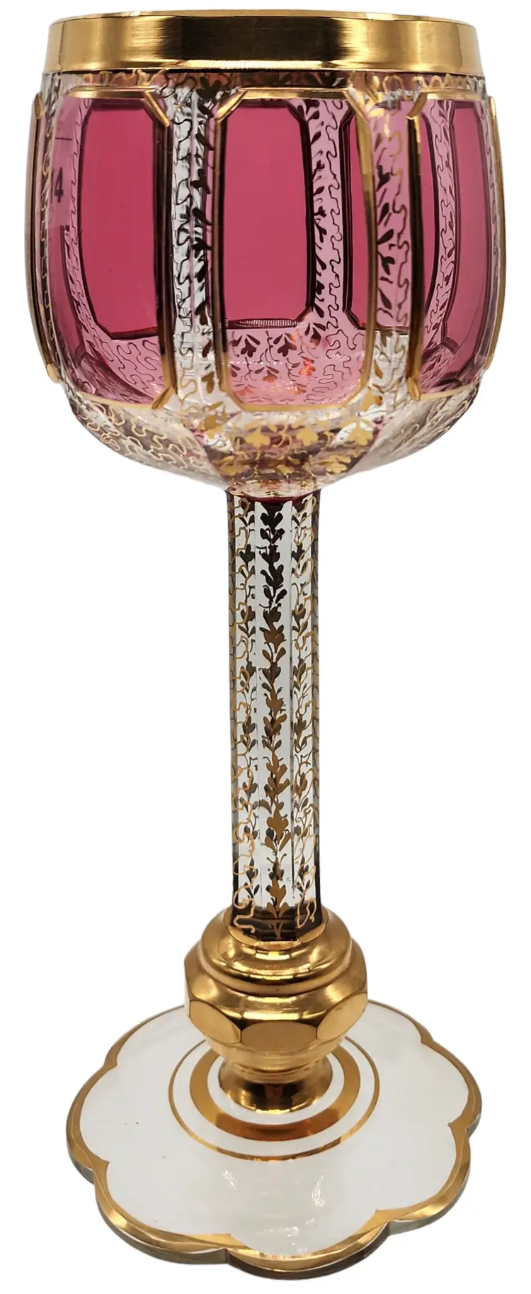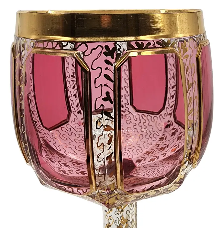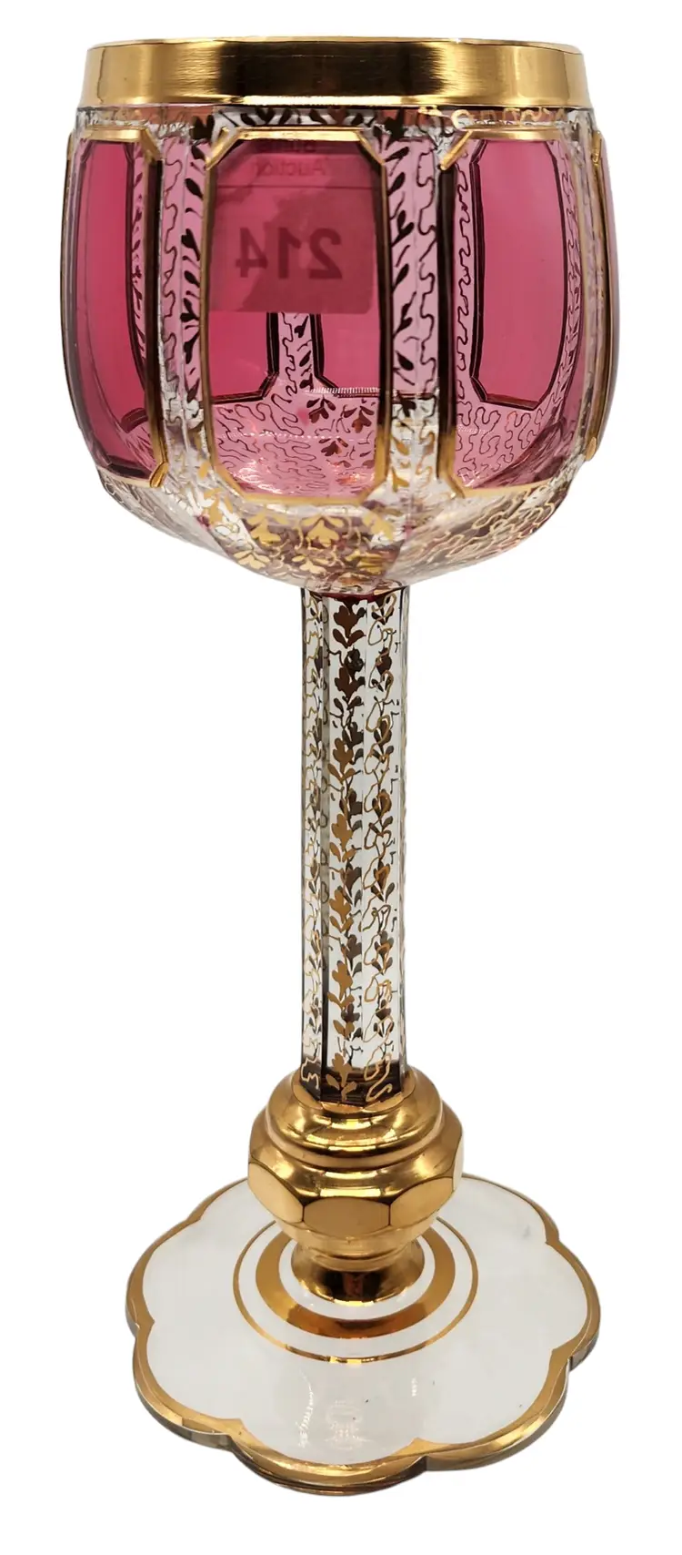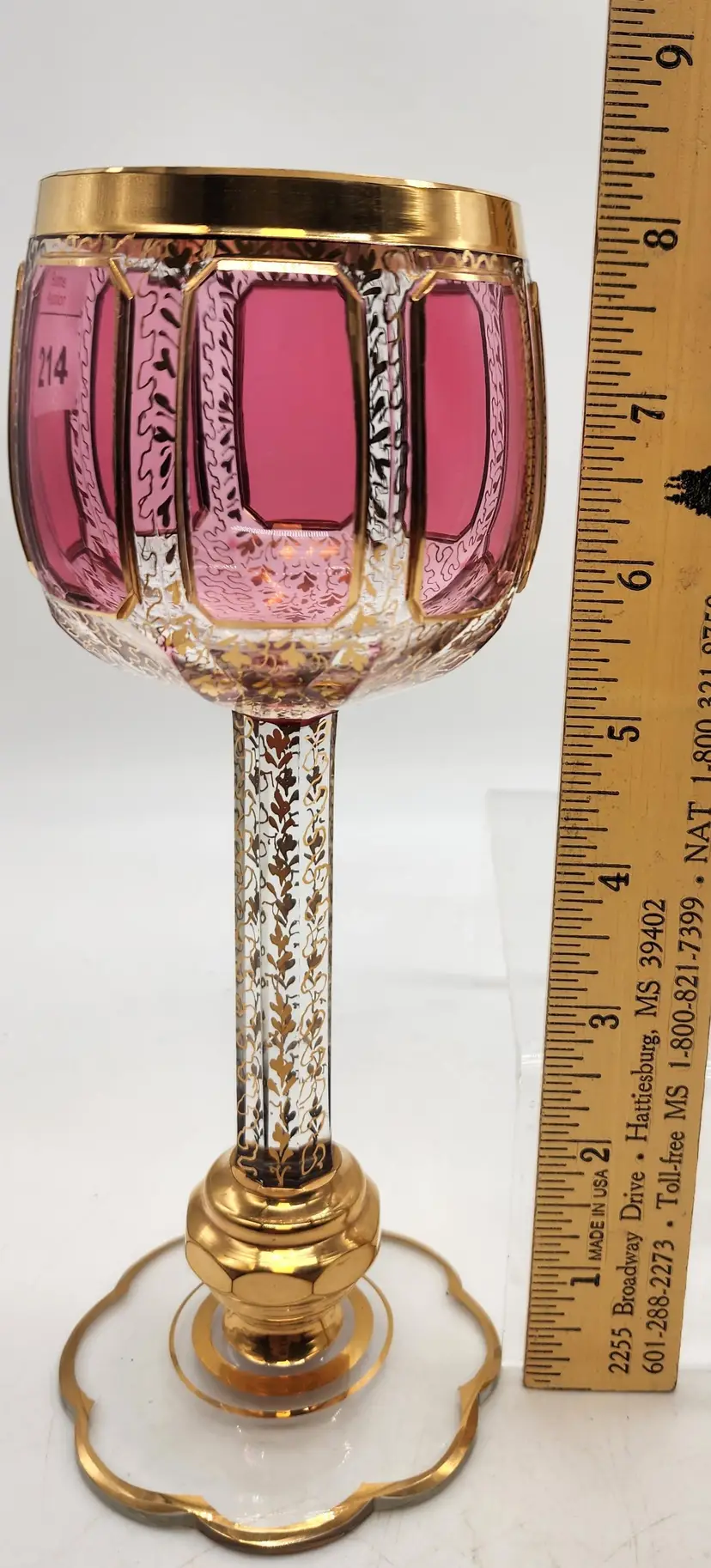 This antique Moser wine glass is a stunning addition to any collection. The pink cabochon crystal and elegant glass production style make it a true Victorian masterpiece. The brand, Moser, is well-known for its exquisite glass and crystal items. Measuring 8 1/4 inches tall, this wine glass is perfect for use or display. The color, style, and material aspects of this glass make it a unique and beautiful piece. Add it to your drinkware or barware collection or display it with your other Moser items.