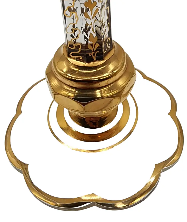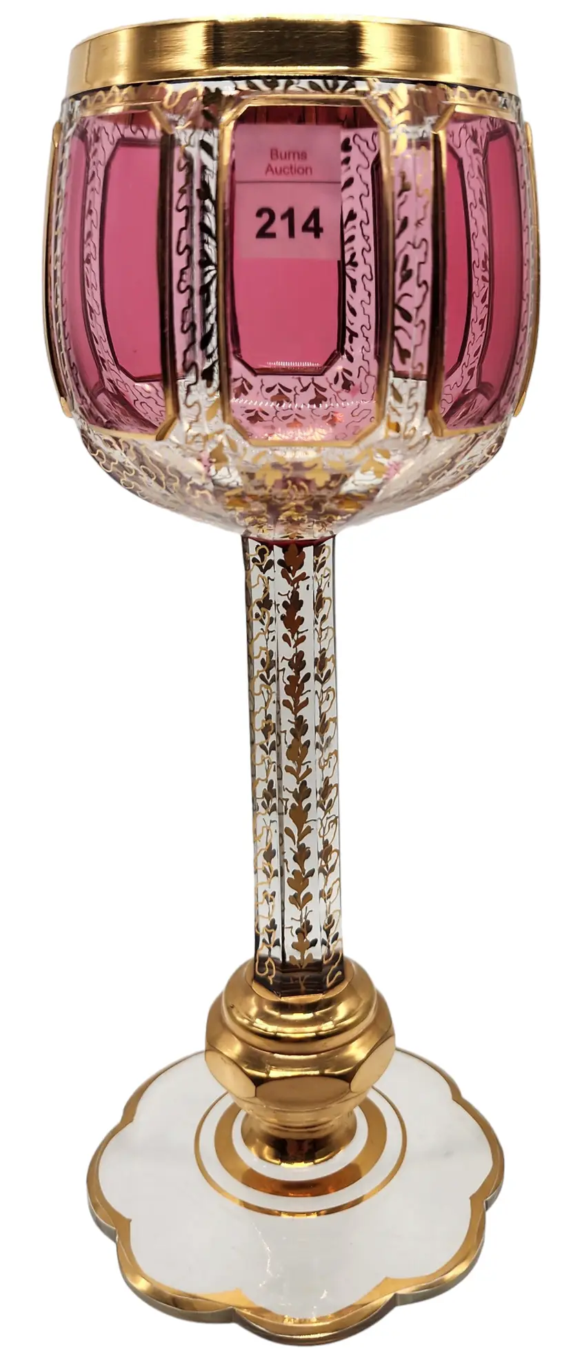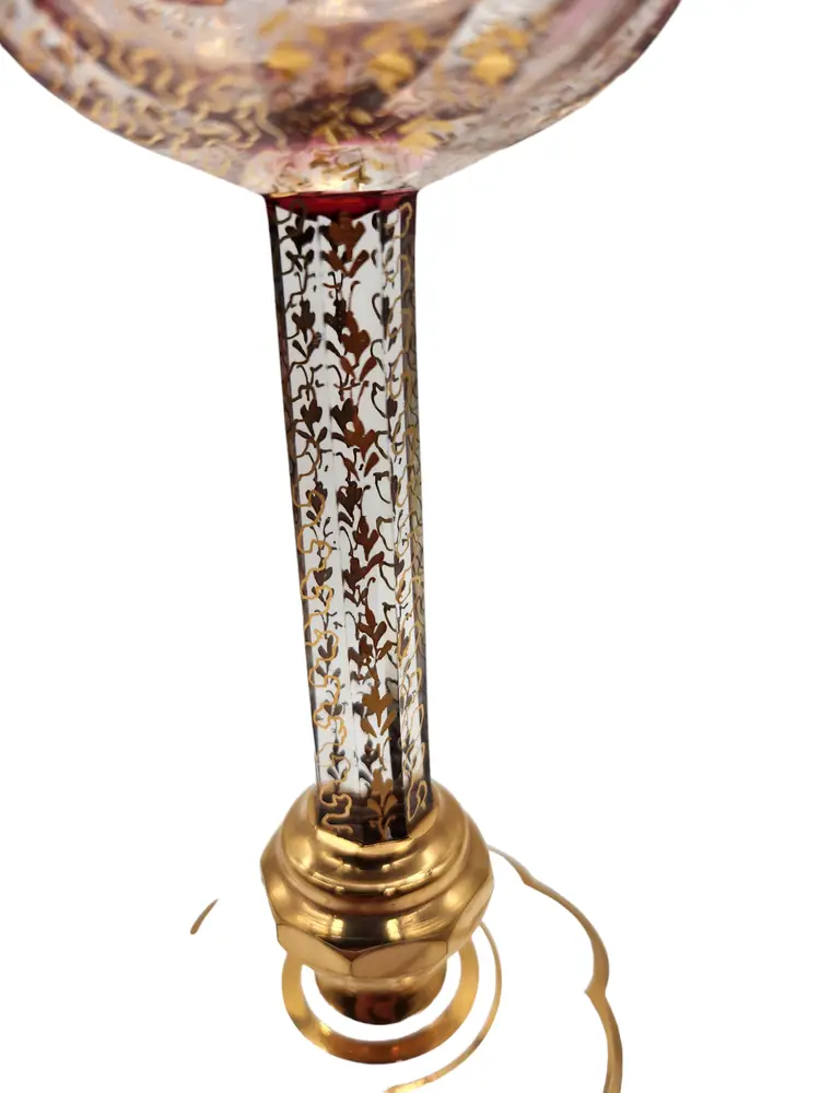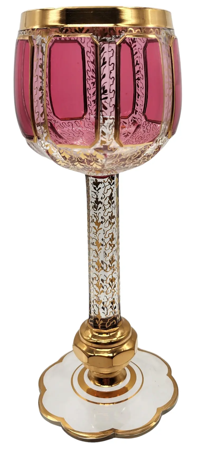 This antique Moser wine glass is a stunning addition to any collection. The pink cabochon crystal and elegant glass production style make it a true Victorian masterpiece. The brand, Moser, is well-known for its exquisite glass and crystal items. Measuring 8 1/4 inches tall, this wine glass is perfect for use or display. The color, style, and material aspects of this glass make it a unique and beautiful piece. Add it to your drinkware or barware collection or display it with your other Moser items.