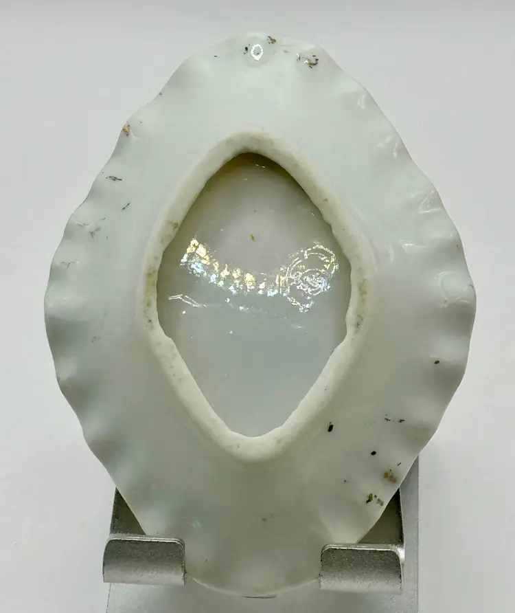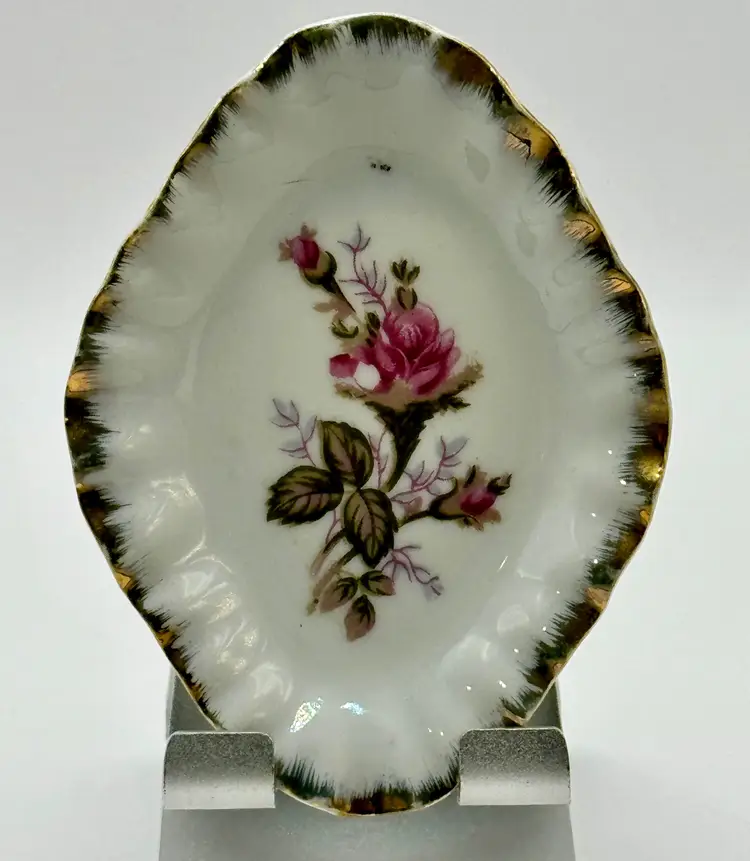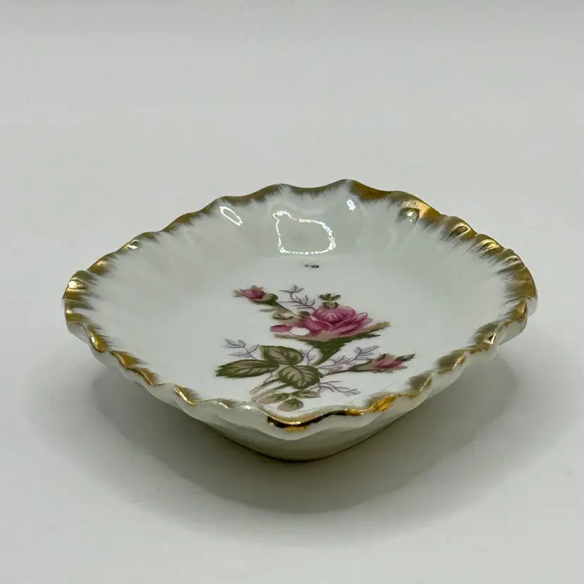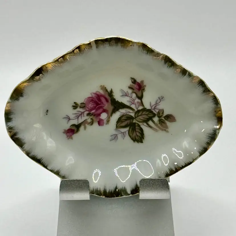 Cherish the elegance of yesteryear with this vintage porcelain dish, featuring hand-painted pink roses and delicate gold trim. Its oval shape makes it a unique find, perfect for collectors or as a graceful accent in your home. Note the charming patina that tells a story of its past. No visible chips or cracks. Measures 3.25x4.25x1. Weighs 4oz.